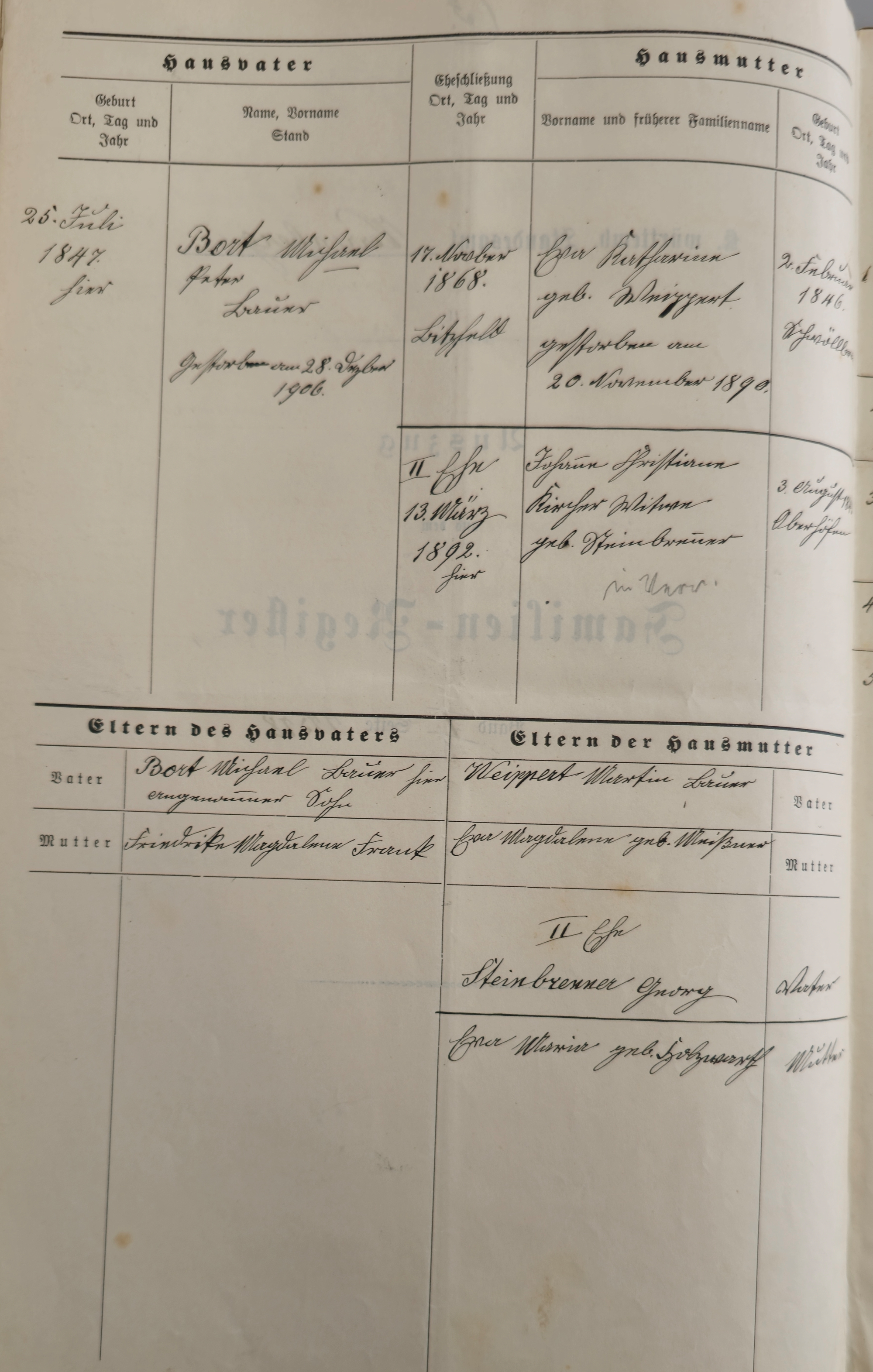 Johann Michael Peter Bort geb. Frank (1) Bürgerausschuß 1880-81, 1886-87, 1889-90 neues kirchl. Familienregister 1808-1890 fol. 26b