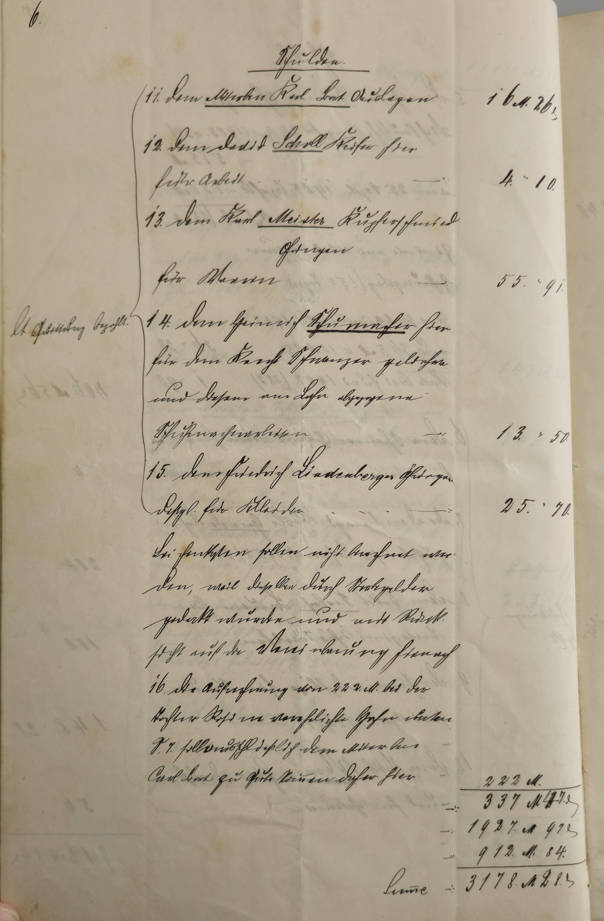 In diesen Nachlassakten vom 28.12.1906 - 06.07.1907 findet sich das folgende: Die gesetzlichen Erben sind: 1. Die Witwe Christiane geb. Steinbrenner ... Kinder aus der getrennten Ehe sind nicht am Leben, dagegen aus der I.Ehe des Verstorbenen mit Katharina Weippert 2. Rosine geb. Bort, Ehefrau des Leonhard Hahn Schullehrer 3. Michael Bort Bauer in Feuerbach 4. Karl Bort Bauer in Verrenberg und 5. Friedrich Bort Architekt in Degerbach Liegenschaft. welche von den unter Ziffer 1-5 aufgeführten Erben nebst dem gesamten Zubehör und Inventar § 91 u. 98 Lit. G. B. [Grundbuch] und aller Haushaltungsfahrniß, soweit letztere nicht Eigentum der Witwe ist und mit Ausnahme 1 Kiste mit u. 1 doppelte Bettst. [Bettstatt], bestehend aus Ober- Unterbett, Pfühl und 2 Kissen, am 27.04.1907 an den Miterben Carl Michael Bort verkauft und aufgelassen worden ist um — — 31 000 Mk. a. Die Hypothek des Sparvereins Kasse Östringen Z. v. d. G. bis 1. Oktbr. 1906. a 4 1/2 % 15000 M. Rata bis 2 April 1907 auf 153 Tage ... 259 M 37 (Summe:) 15 259 M 37 b. Sicherungshypothek der Miterbin Rosine- ... .... ... 1500 M. von 2 April 1907. a 4% Zinsen Zins an den Schwag. Carl Bort dessglich: 1500 M. " " Friedrich " " 1500 M. " " Richard " " 700 M. (Summe:) 5200 M. (Zwischensumme rechts:) 20 459 M 37 Ab 2 April 1907 hat der Käufer die Zinsen selbst zu vertreten (verrechnet auf d. Kaufschilling d. gegenwärtigen Verkaufs) (Rechts:) 10 540 M 63 (Einfügung: Abtragend aus d. Kaufsch. vom 1. Aug 1907 laut Quittung erfolgt) An v. g. restlich vom 2 April 1907 mit 4% und zahlbar gegen ½ jährige Kündigung Rata bis 1 Juni 1907 auf 60 Tage ... 69 M 80 Fahrniß Diese besteht in den Beilegungen der Witwe und ist stammvatergemäß hier sämmtlich aufzunehmen mit dem eingeschriebenen Wert von ... 441 M 40 ferner 1. Kasten und ein vollständiges Bett (vergl. oben S. 2) im Wert von ... 60 M. Es werden noch offene Forderungen aufgelistet in Höhe von insgesamt 1.927 M. 97 d.. Ebenso die offenen Schulden in Höhe von 3.178 M. 28 d. Vermögen Rest 7.932 M 95 fl. Es haben anzutreten: