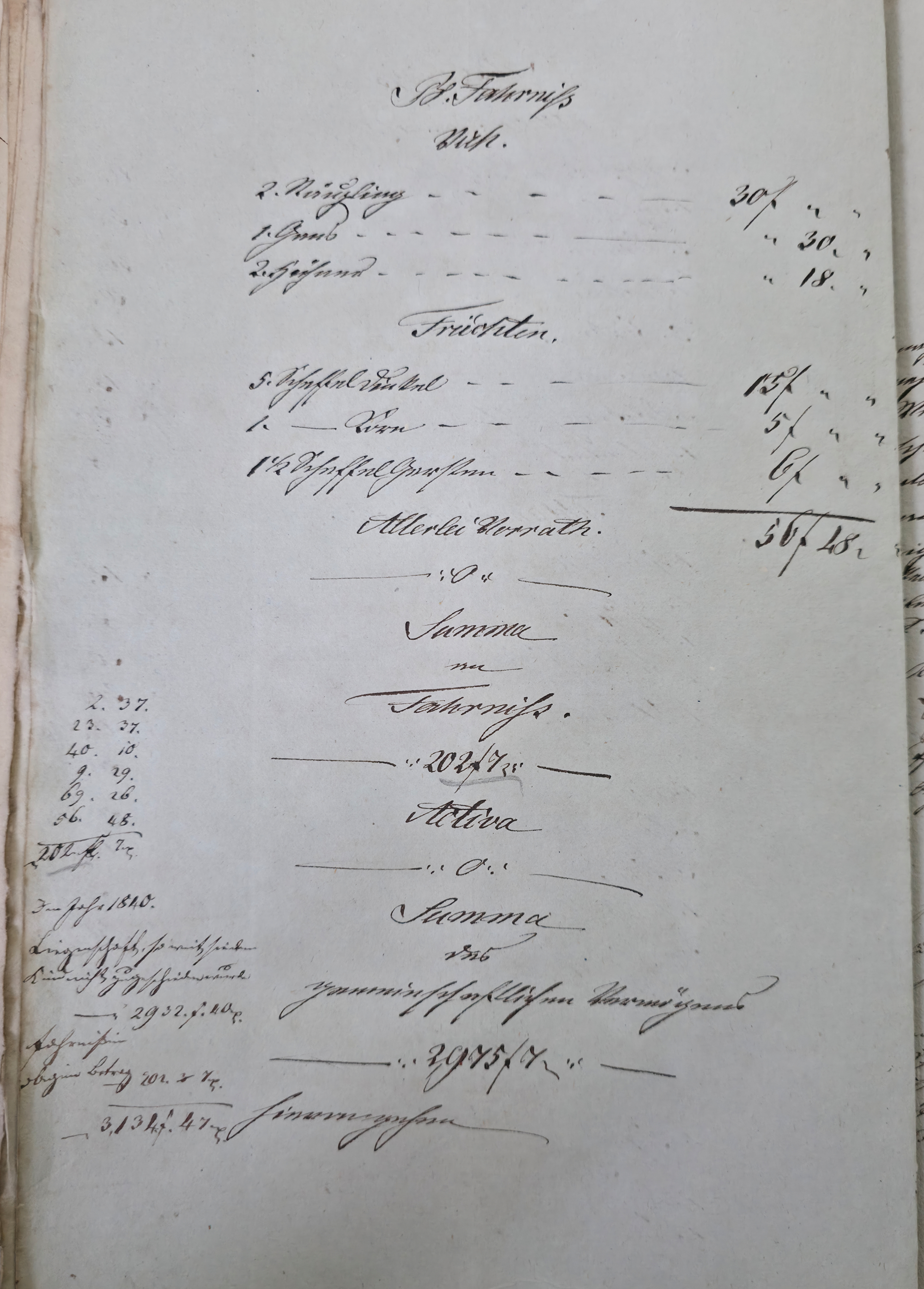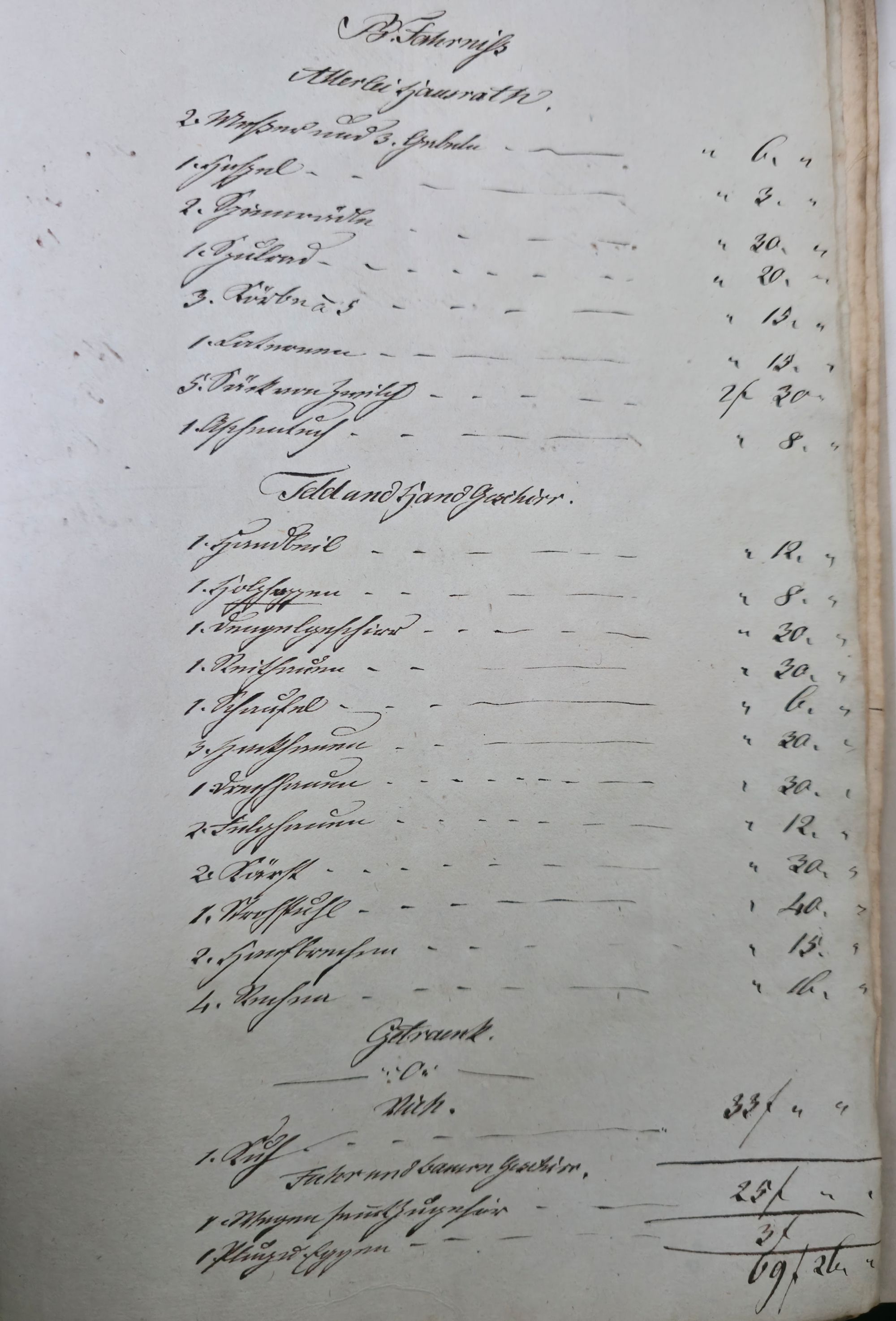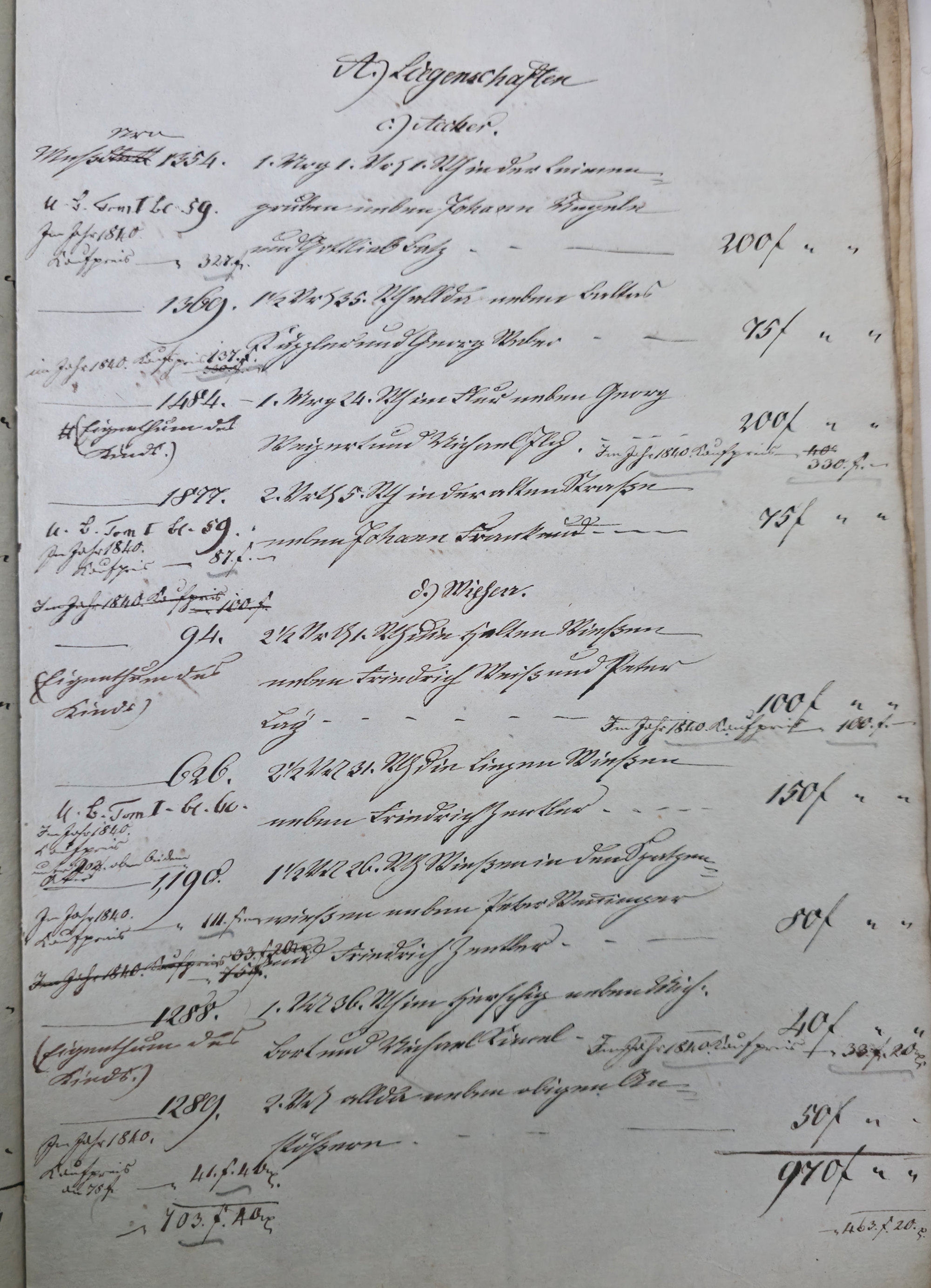In dieser Eventualteilung vom 28.04.1836 / 02.01.1837 findet sich das folgende: Die gesetzlichen Erben sind: I. Die Wittwe Christina Catharina eine geborene Häffele II. ein mit dem Verstorbenen erzeugtes Kind, Georg Adam 7. Jahre alt Für das minderjährige kind wurde Mathes Kraft als Pfleger verpflichtet. A. Liegenschaften a) Häußer und Gebäude Meßbuch No 44. 1 einstockiges Wohnhauß neben Peter Ilg 200 fl. 1 Scheuer neben obigem Anstößer 100 fl. b) Gärten 38 fl. c) Aecker 1.865 fl. d) Wiesen 110 fl. e) Weinberge 400 fl. f) Wald 60 fl. Summe Liegenschaften 3.773 fl. B. Fahrniß Baar Geld 0 fl. Bücher 1. Gesang buch 15 x. 1. Predigtbuch 30 x. Manns Kleider 13 fl. 12 x. Frauen Kleider 12 fl. 17 x. Bett Gewand 25 fl. Leinwand 12 fl. 54 x. Küchen Geschirr von Messing 1 fl. von Zinn 30 x. von Kupfer 24 x. von Eisen 10 x. von Blech 12 x. von Glas 14 x. von porzellan 6 x. Irdenes Geschirr 15 x. Schreinwerk 5 fl. 4 x. Faß und Bandgeschirr 3 fl. 50 x. Allerlei Hausrath 4 fl. 7 x. Feld und Handgeschirr 4 fl. 19 x. Getränk 0 fl. Vieh 1 Kuh 33 fl. 2 Räupling 30 fl. 1 Gans 30 x. 2 Hühner 18 x. Fahr und Bauren geschirr 1 Wagen samt Zugschirr 25 fl. 1 Pflug u Eggen 3 fl. Früchten 5 Scheffel Dinkel 15 fl. 1 Scheffel Korn 5 fl. 1 1/2 Scheffel Gersten 6 fl. Activa 0 fl. Summe des gemeinschaftlichen Vermögens 2.975 fl. 7 x. Schulden 563 fl. 30 x. Unter Abzug der Schulden besteht das reine Vermögen anhin 2.411 fl. 37 x. Es zeigt sich mithin einen eheliche Errungenschaft von 823 fl. 44 x. Hiervon gebührt jedem Ehegatten die Hälfte mit 411 fl. 52 x. Die Verlassenschaft des Verstorbenen besteht also: a) in einem Beibringen mit 733 fl. 29x. b) in der Hälftigen Errungenschaft mit 411 fl. 52 x. Zusammen in 1.145 fl. 21 x. Hiervon trifft es: I. die Wittwe mit 381 fl. 47 . II. dem Sohn Georg Adam a 2/3 763 fl. 34 x. Es haben also zu fordern: I. die Wittwe a) Beibringen 854 fl. 24 x. b) hälftigen Errungenschaft 411 fl. 52 x. c) Erbs Portion 381 fl. 47 x. II. der Sohn Georg Adam Brand Erbs Portion 763 fl. 3 x. Sämtliche Liegenschaften wurden während der Ehe erworben, und sind gerichtlich angeschlagen zu 2.773 fl. Wovon zunächst der Ehefrau die Hälfte gebührt mit 1.386 fl. 30 x. dann 1/3 an der anderen Hälfte mit 462 fl. 10 x. Der Sohn Georg Adam Brand ad 2/3 an der andern hälfte mit 924 fl. 20 x. Die Erbs Portion desselben trägt aber nur 763 fl. 34 x. Es folgen weitere Aufzählungen