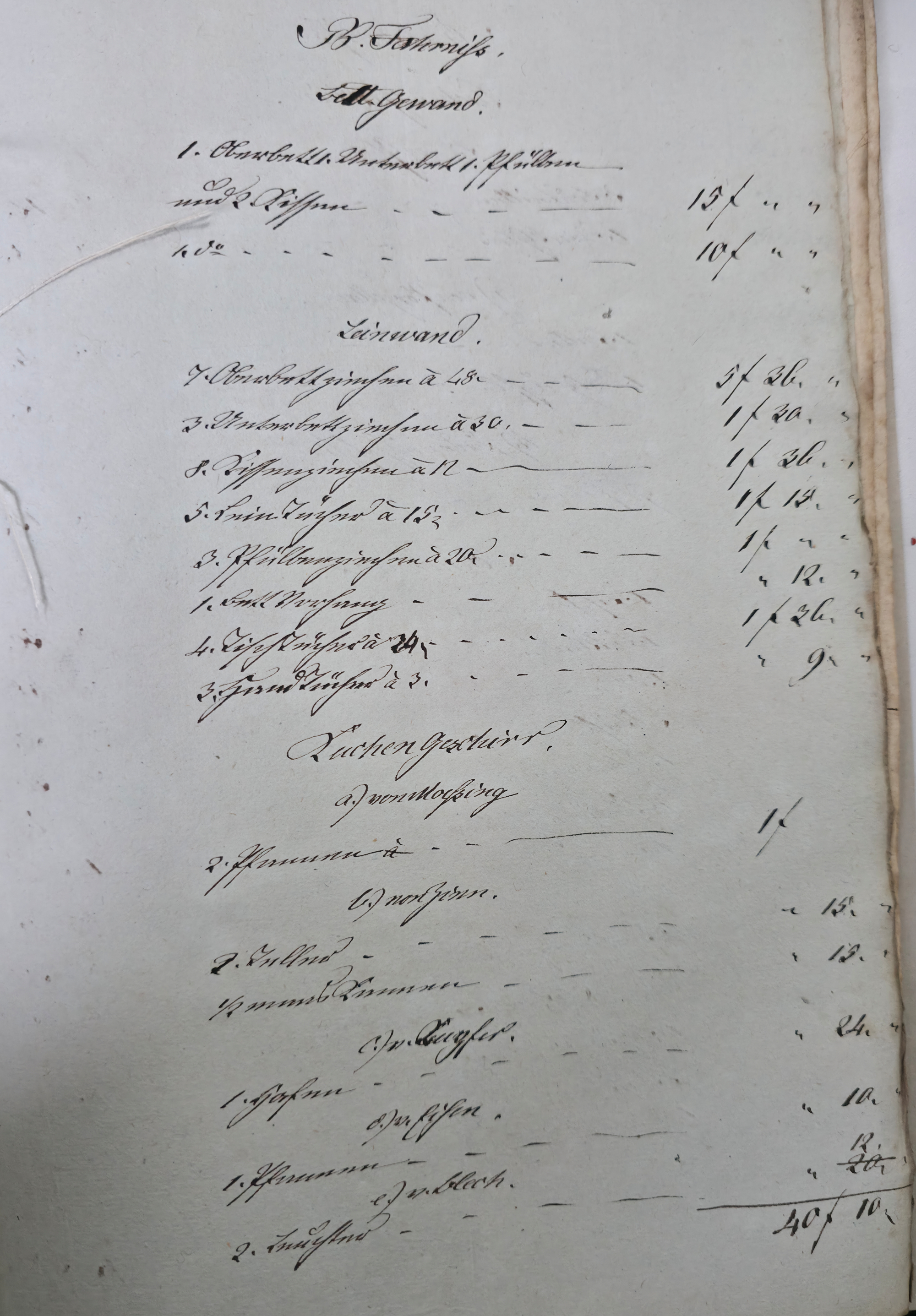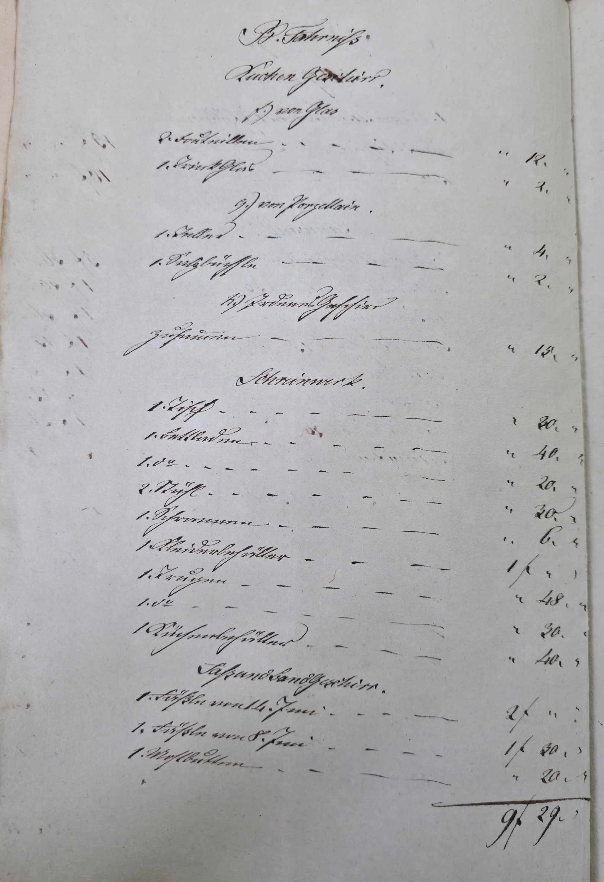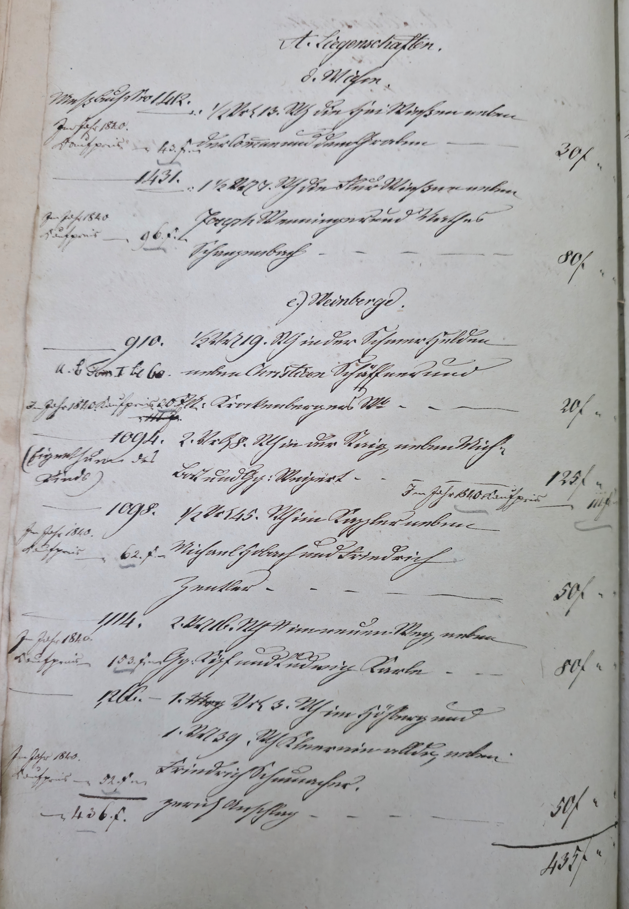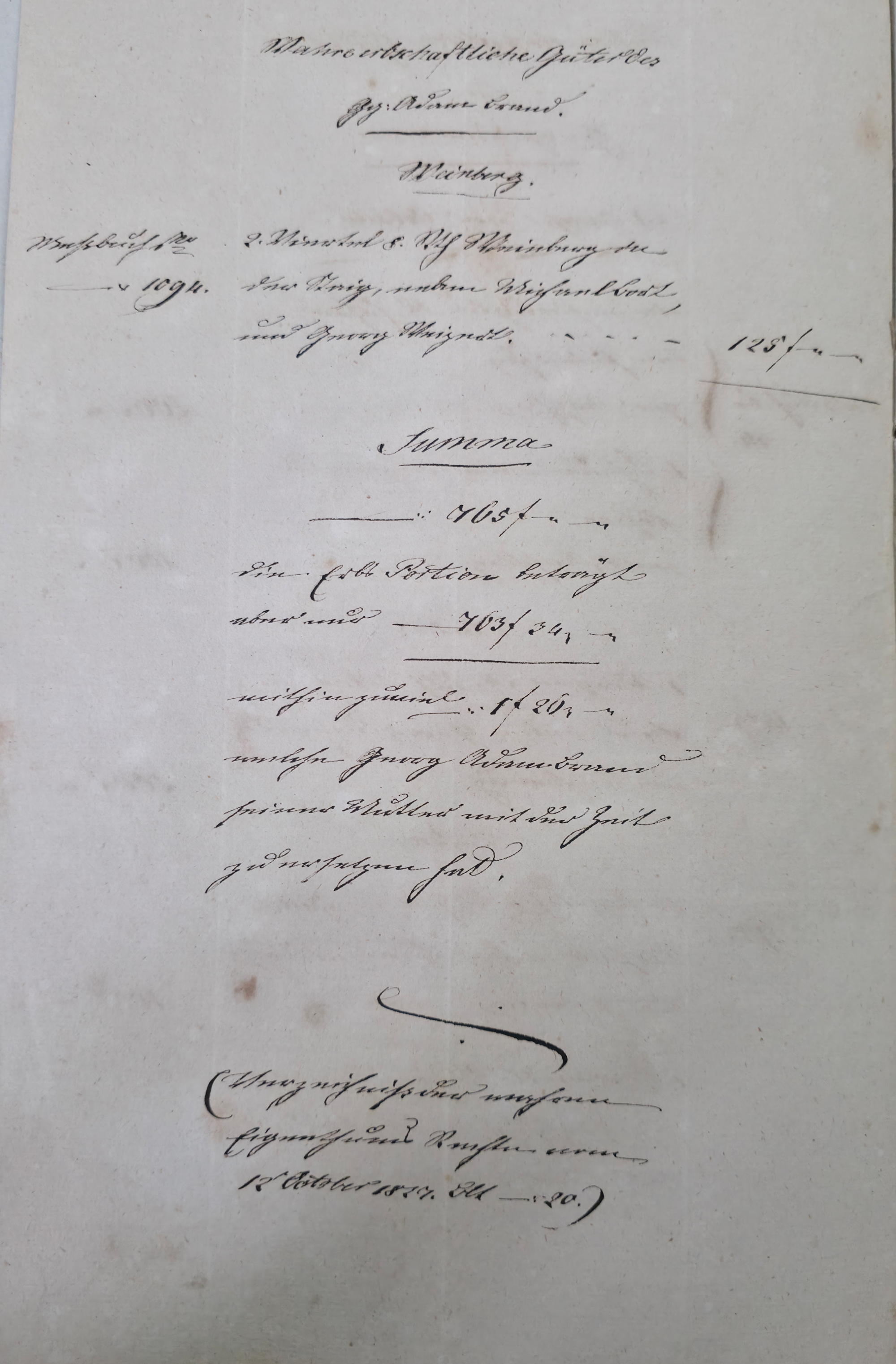 In dieser Eventualteilung vom 28.04.1836 / 02.01.1837 findet sich das folgende: Die gesetzlichen Erben sind: I. Die Wittwe Christina Catharina eine geborene Häffele II. ein mit dem Verstorbenen erzeugtes Kind, Georg Adam 7. Jahre alt Für das minderjährige kind wurde Mathes Kraft als Pfleger verpflichtet. A. Liegenschaften a) Häußer und Gebäude Meßbuch No 44. 1 einstockiges Wohnhauß neben Peter Ilg 200 fl. 1 Scheuer neben obigem Anstößer 100 fl. b) Gärten 38 fl. c) Aecker 1.865 fl. d) Wiesen 110 fl. e) Weinberge 400 fl. f) Wald 60 fl. Summe Liegenschaften 3.773 fl. B. Fahrniß Baar Geld 0 fl. Bücher 1. Gesang buch 15 x. 1. Predigtbuch 30 x. Manns Kleider 13 fl. 12 x. Frauen Kleider 12 fl. 17 x. Bett Gewand 25 fl. Leinwand 12 fl. 54 x. Küchen Geschirr von Messing 1 fl. von Zinn 30 x. von Kupfer 24 x. von Eisen 10 x. von Blech 12 x. von Glas 14 x. von porzellan 6 x. Irdenes Geschirr 15 x. Schreinwerk 5 fl. 4 x. Faß und Bandgeschirr 3 fl. 50 x. Allerlei Hausrath 4 fl. 7 x. Feld und Handgeschirr 4 fl. 19 x. Getränk 0 fl. Vieh 1 Kuh 33 fl. 2 Räupling 30 fl. 1 Gans 30 x. 2 Hühner 18 x. Fahr und Bauren geschirr 1 Wagen samt Zugschirr 25 fl. 1 Pflug u Eggen 3 fl. Früchten 5 Scheffel Dinkel 15 fl. 1 Scheffel Korn 5 fl. 1 1/2 Scheffel Gersten 6 fl. Activa 0 fl. Summe des gemeinschaftlichen Vermögens 2.975 fl. 7 x. Schulden 563 fl. 30 x. Unter Abzug der Schulden besteht das reine Vermögen anhin 2.411 fl. 37 x. Es zeigt sich mithin einen eheliche Errungenschaft von 823 fl. 44 x. Hiervon gebührt jedem Ehegatten die Hälfte mit 411 fl. 52 x. Die Verlassenschaft des Verstorbenen besteht also: a) in einem Beibringen mit 733 fl. 29x. b) in der Hälftigen Errungenschaft mit 411 fl. 52 x. Zusammen in 1.145 fl. 21 x. Hiervon trifft es: I. die Wittwe mit 381 fl. 47 . II. dem Sohn Georg Adam a 2/3 763 fl. 34 x. Es haben also zu fordern: I. die Wittwe a) Beibringen 854 fl. 24 x. b) hälftigen Errungenschaft 411 fl. 52 x. c) Erbs Portion 381 fl. 47 x. II. der Sohn Georg Adam Brand Erbs Portion 763 fl. 3 x. Sämtliche Liegenschaften wurden während der Ehe erworben, und sind gerichtlich angeschlagen zu 2.773 fl. Wovon zunächst der Ehefrau die Hälfte gebührt mit 1.386 fl. 30 x. dann 1/3 an der anderen Hälfte mit 462 fl. 10 x. Der Sohn Georg Adam Brand ad 2/3 an der andern hälfte mit 924 fl. 20 x. Die Erbs Portion desselben trägt aber nur 763 fl. 34 x. Es folgen weitere Aufzählungen