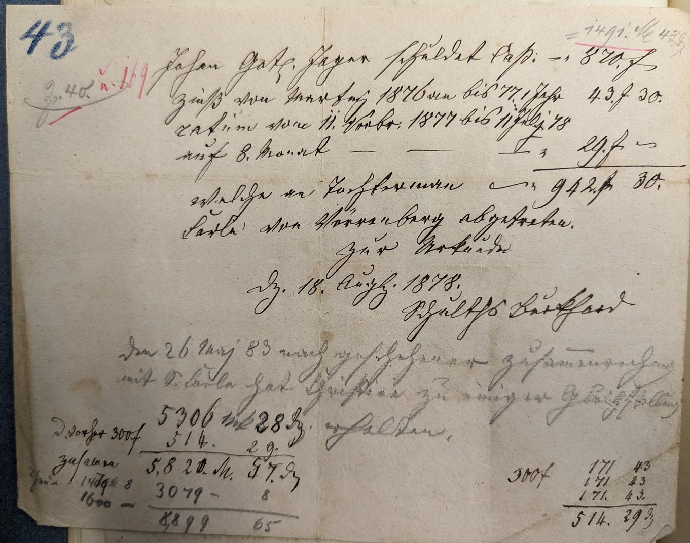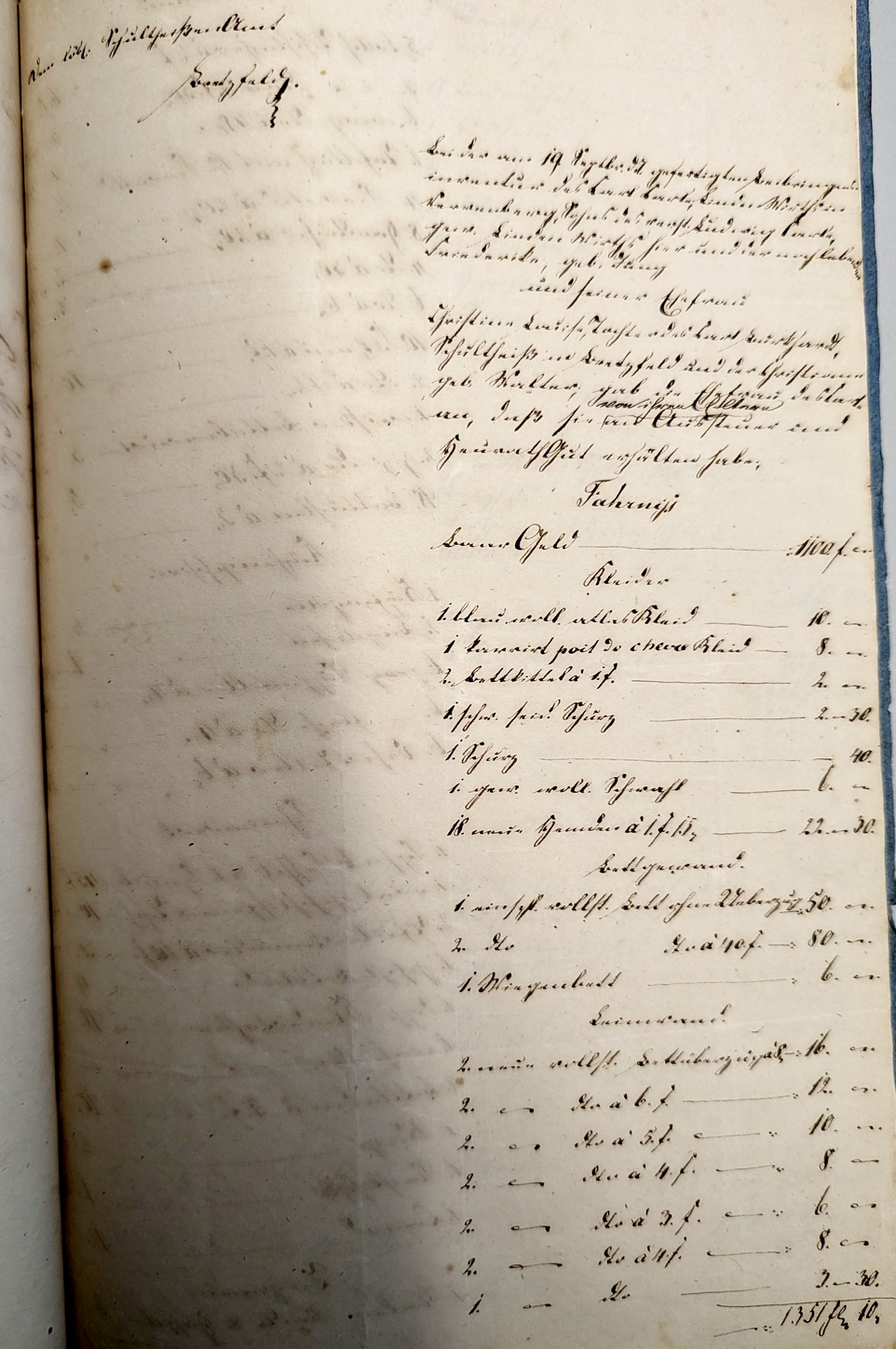 Im Ruggericht von 1884 Fol.123a steht: "§.6. Registratur Diese befindet sich in 5 Kästen und Repositorien im Gemeinderatszimmer im Haus des Schultheißen Carle. Die Bemerkungen vom letzten Ruggericht haben eine Verbesserung nicht herbeigeführt und ist vielmehr der Zustand der Registratur nur um 4 Jahre älter geworden. Dieselbe ist binnen zwei Jahren neu zu ordnen, es sind die wertlosen und platzraubenden Papiere auszuscheiden. Die Fascikel und Abtheilungen sauber herzustellen mit passenden Umschlägen u diese mit Ueberschriften bzw. mit Schildern zu versehen u über das Ganze ein Reportarium zu fertigen. Die alten Zehnt Ablösungsakten und Rechnungm... wohl am besten in der Kammer neben der Schule - welche zur alten Registratur oder zum Archiv eingerichtet ist aufbewahrt." |