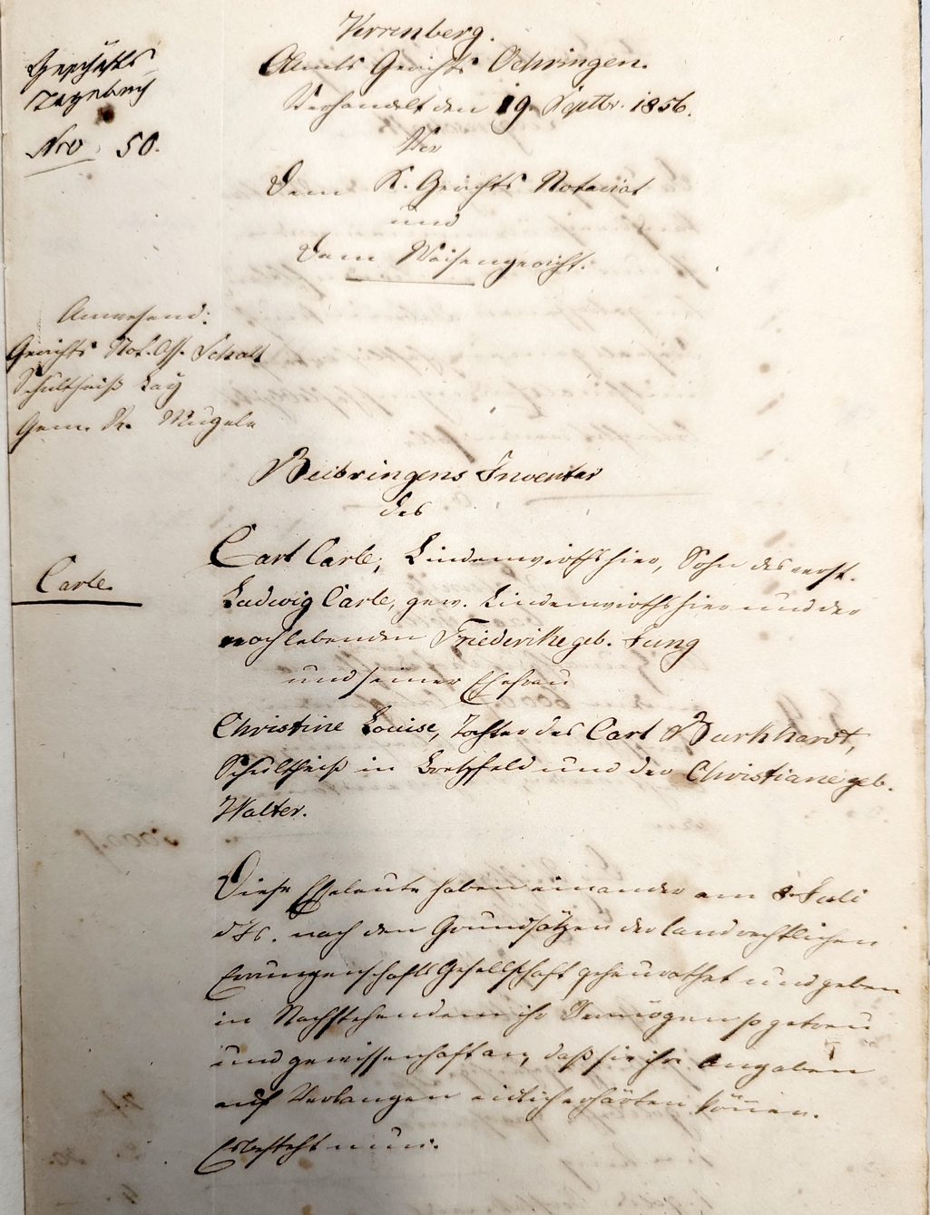 Carl Christian Carle erwirbt das aktive Bürgerrecht durch Heirat - 1856 In der Liste zum aktiven Bürgerrecht im Ortsarchiv findet sich folgendes: Art der Erwerbung des Bürgerrechts: 31.Mai Geburt Art und Zeit des Eintritts in das aktive Bürgerrecht: den 24.Juni 1856 durch Verehlichung Bemerkung: 11.März 73 Schultheiß |