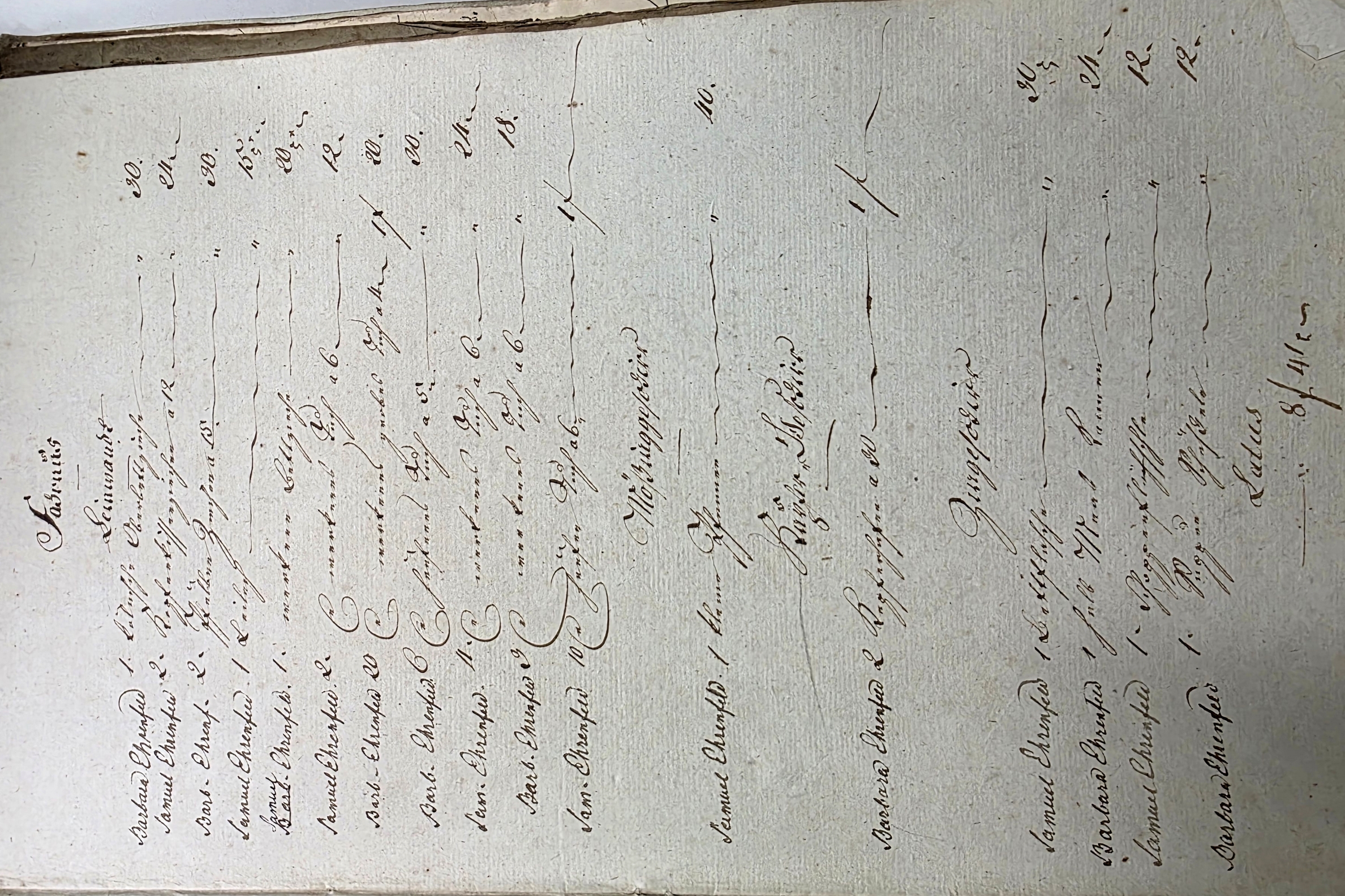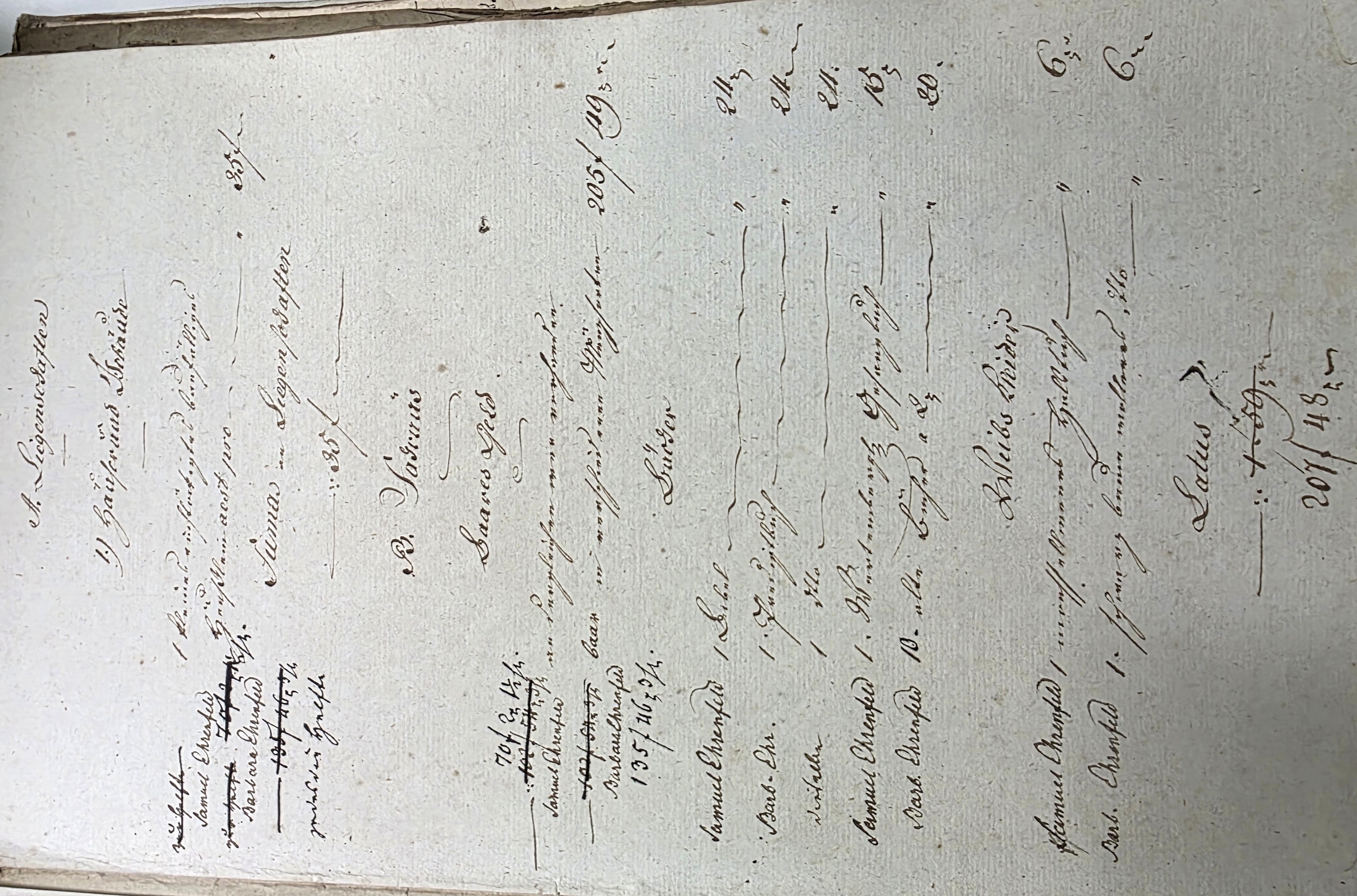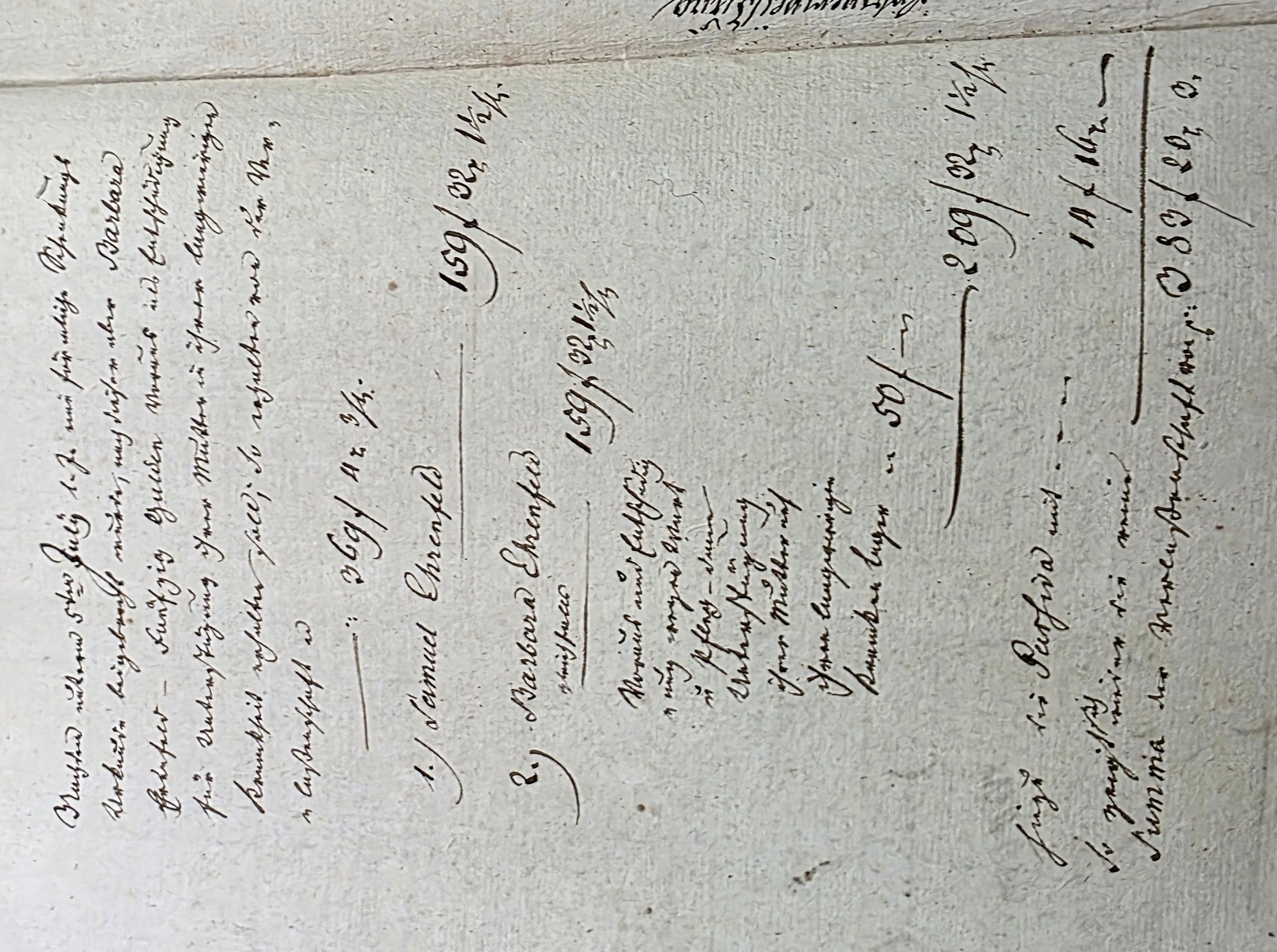 In diesem Verlaßenschafts Inventur und Realteilung vom 07.06.1827 findet sich das folgende: Die gesetzlichen Erben sind: Simon Ehrenfeld Bürgerl. Inwohner zu J....berg, Königlichem Oberamts Gerichts Künzelsau, Bruder der Verstorbenen dessen zwey leibliche Kinder a) Samuel Ehrenfeld Dienstknecht bey Schultheiß Käppler dahier 38 Jahre alt. b) Barbara Ehrenfeld dermalen im Dinsten bey Adlerwirth ... zu Niederstetten Oberamts Gerabronn, 36 Jahre alt. Erklären aber daß ihr Vater ihnen diese Verlassenschaft abgetretten haben und daß sie ohne Verzug deßfals eine .... Urkunde beibringen würden. Der Nachlass von Maria Dorothea Ehrenfeld bestand u.a. aus: A Liegenschaften 1) Häuser und Gebäude 1 kleines einstöckiges baufälliges Häuslein 35 fl. [Haus 10a] Nachtrag links: zur Hälfte Friedrich Samuel Ehrenfeld zur Hälfte Barbara Ehrenfeld B. Fahris baares Geld 205 fl. 49 x. Bücher - Bibel 24 x. - Predigtbuch 24 x. - Predigtbuch 24 x. - Württemb. Gesangbuch 15 x. - 10 alte Bücher 20 x. Weibs Kleider 1 fl. 32 x. Bettgewandt 17 fl. 30 x. Leinwandt 6 fl. 03 x. Mößinggeschirr 40 x. Kupfer Geschirr 1 fl. Zurgeschirr 1 fl. 18 x. Eisenbäckergeschirr 18 x. Schreinwerk 1 fl. 42 x. Gemeiner Hausrat 42 x. Summe Fahrniß 238 fl. 21 x. Activis 109 fl. 59 x. Schulden 14 fl. 16 x. Rest des Vermögens 369 fl. 4 x. "Nachdem unterm 5ten July d.J. einfür ... Schenkungs Urkunde beigebracht wurde, nach dieser aber Barbara Ehrenfeld - Fünfzig Gulden voraus als Entschädigung für Unterstützung ihrer Mutter in ihrer langwierigen Krankheit erhalten soll; So erhalten von der Verlaßenschaft 369 fl. 4 x. 1. Samuel Ehrenfeld 159 fl. 32 x. 2. Barbara Ehrenfeld 159 fl. 32 x. und 50 fl."