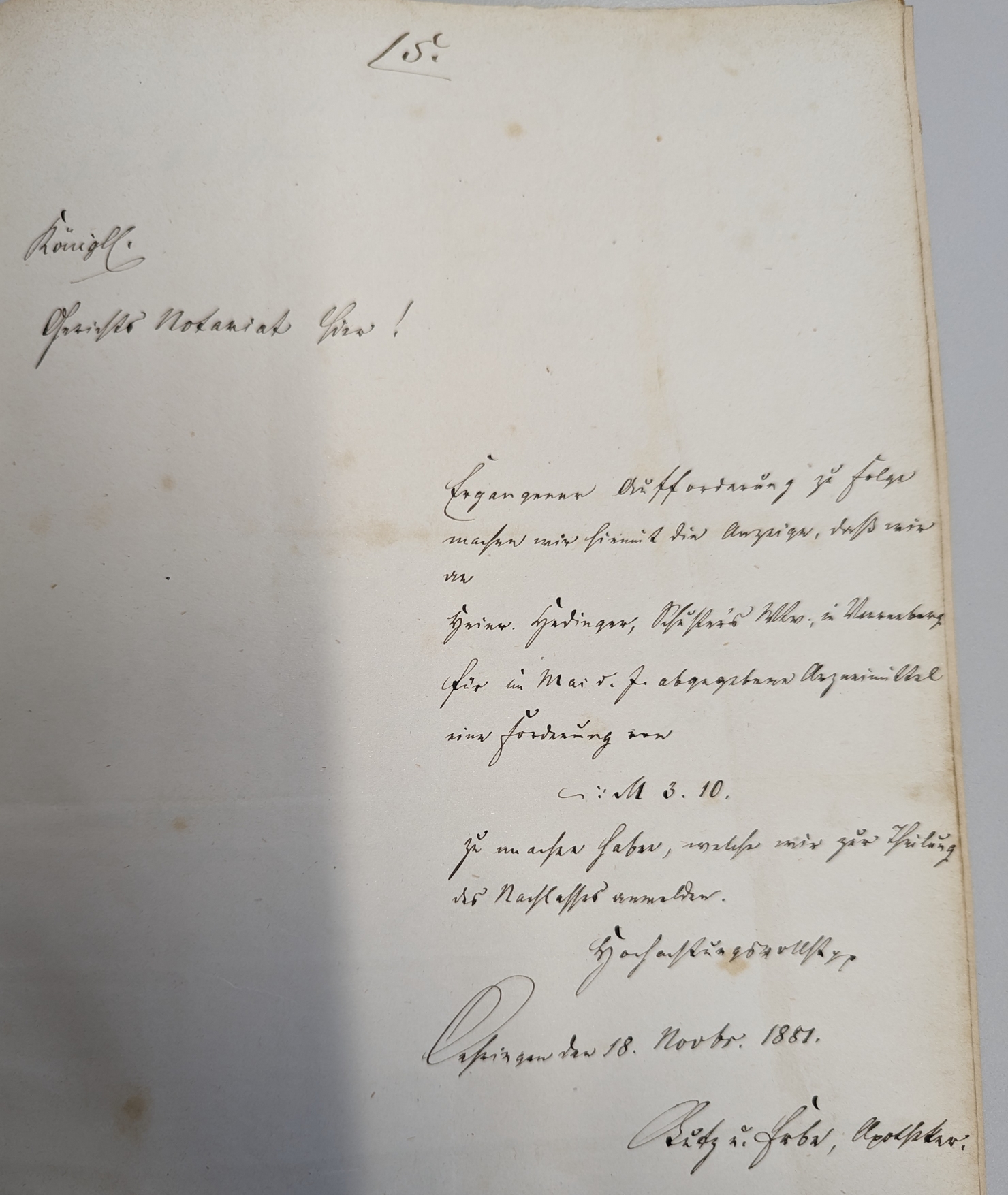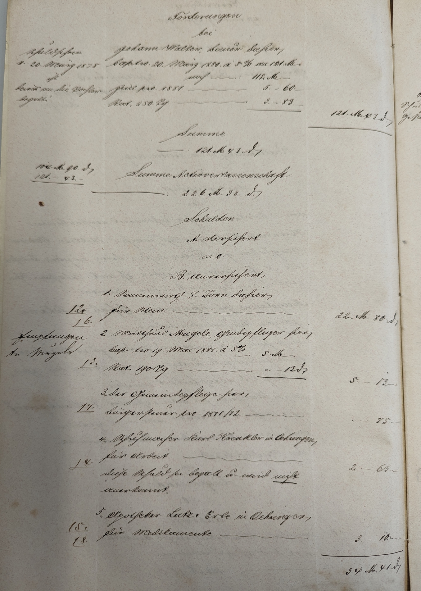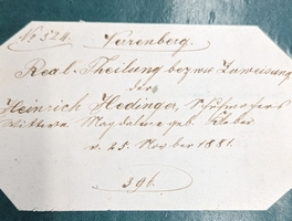 In dieser Realteilung vom 25.11.1881 findet sich das folgende: Die Witwe des Heinrich Hedinger hat kein Testament hinterlassen. Der einzige Intestamenterbe ist ihre Tochter Magdalena geb. Schanzenbach Ehefrau des Johann Jäger aus ihrer 1.Ehe. Der Nachlass wird so angegeben: Liegenschaft 0 M. Fahrniß 104 M. 90 d. Forderungen 121 M. Schulden 34 M. 41 d. bezahlte Leichenkosten 65 M. Es steht noch eine Forderung von 2 M. 63 d. vom Schumacher Kark Krenkler im Raum, die aber laut Johann Christoph Jäger und seiner Frau bereits bezahlt ist.
