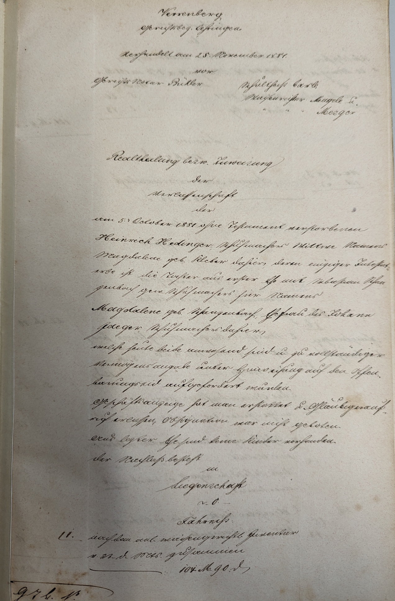 Im Verrenberger Gemeinderatsprotokoll vom 27.Dezember 1873 heist es: Verhandlung zwischen Heinrich Hedinger Schumacher hier Kläger und Gottlieb Jäger hier Beklagter Ausgeding und Dingrecht betreffend. Nachtrag links: Beil. 12. |
