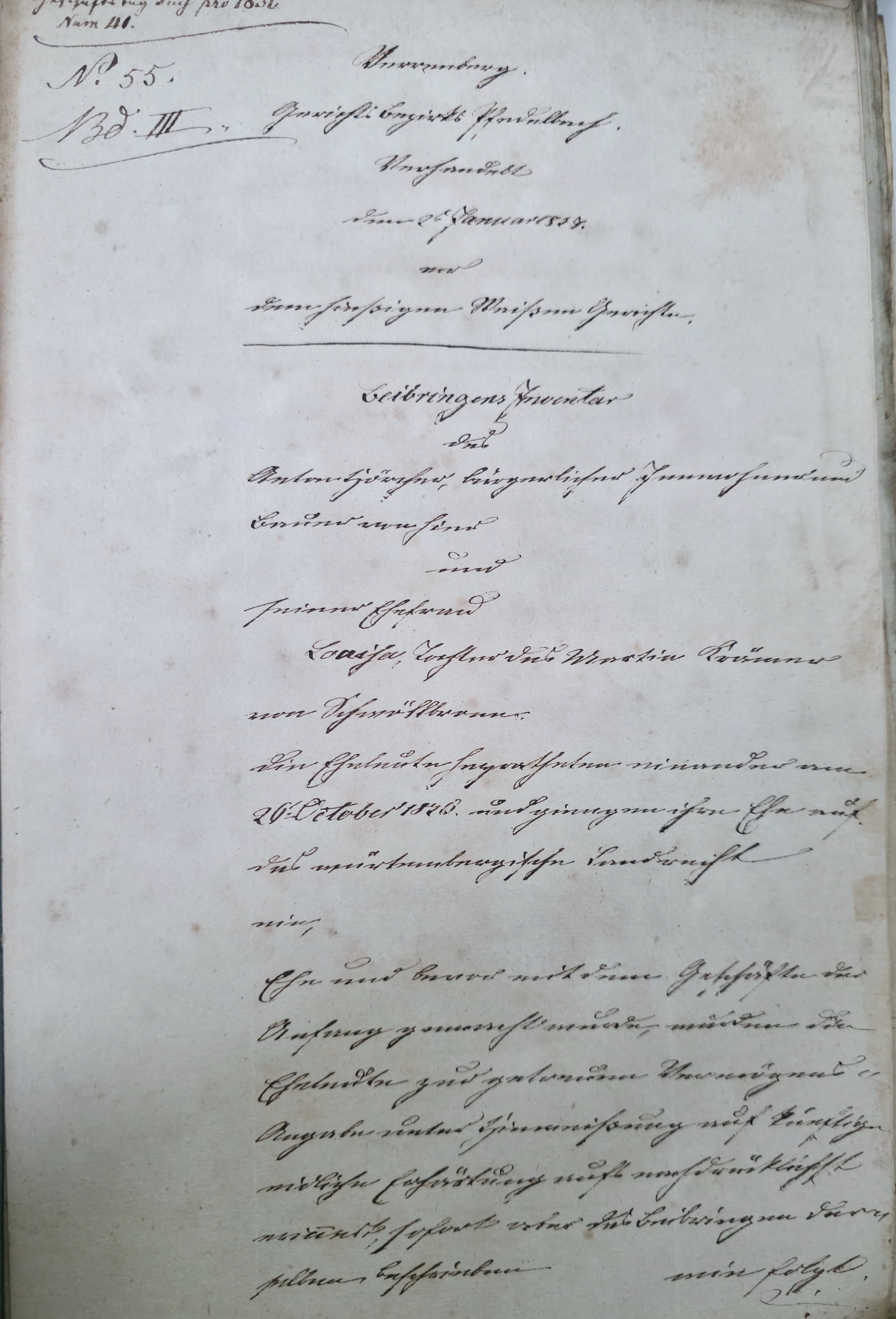 Im "Schultheißenamt Protokoll" von 23.Januar 1857 heist es: In der Klagsache zwischen Anton Hörger Kläg. und Jacob Meßer Speisewirth in Unterohrn Beklagt. Schadenersatz betreffend hat man heute Tagforth zur ersten Mündlichen Verhandlung festgesezt und beide Partheien vorgeladen worauf der Beklagte Jacob Messer in Persohn erschien Kläg aber nicht. Dem Bekl wurde veranlaßt aber nicht geneigt wäre dem Kläger die Einsichts Sporteln von 30x nebst 40x Schadenersatz ersezen zu wollen gibt hierauf an. Ich bin geneigt daß ich dem Kl. 40x Schadenersatz erseze mit dem Bemerke wenn d.... auf sein Tragrecht welches er auf meinem Aker ausübt verzichte das gleiche ich auch thun will auserdem erkenne ich aber nichts an und zwar aus dem Grund den ich habe da ich dem Kl. den Haber abgemeht gehabt habe ihm sogleich eine Offerte gemacht daß ich ihm von meinem Reifen Haber geradeso viel als ich ihm unreifen abgemacht ersezen wolle Kläger habe aber darüber erwiedert er nehme dieses gemachte Offerte nicht an er verlange eine Einsicht. Hierauf habe ich gesagt Kläger könne seinetwegen 2. Einsichten ..sten. Ferner hat hiemit der Beklagte erklärt daß er einen von dem hies. Gemeinderath gefällte Urtheilung nicht annehmen weil der Kläg auf Gemeinderaths ...... ist, weshalb ich beantrage daß die Sache bei dem kl. Oberamts Gericht wenn der Kläger nicht zufrieden sein will entschieden werden Beschluß Die Angabe des Beklagten zu eröffnen |