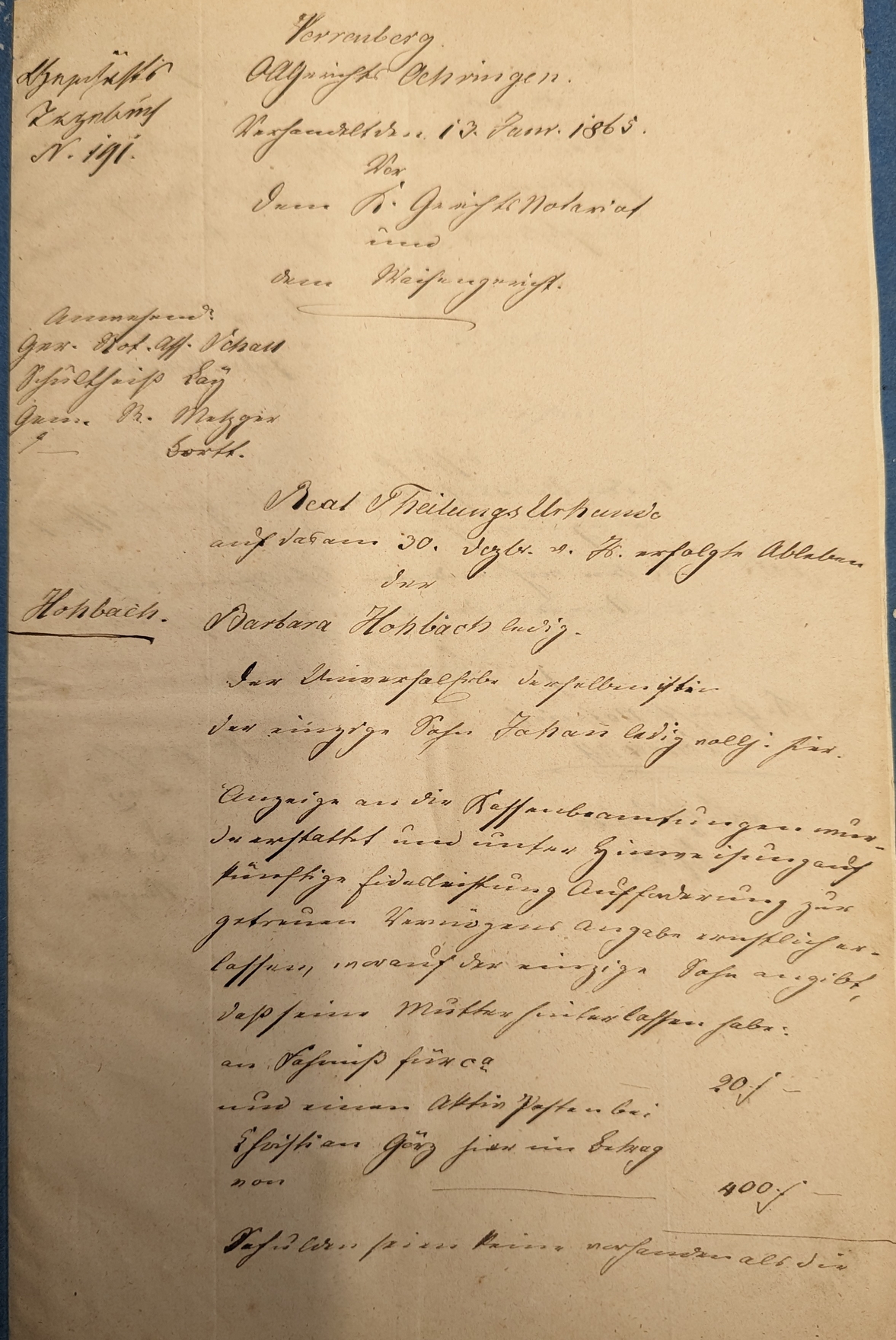 Im Verrenberger Gemeinderatsprotokoll vom 10.April 1873 findet sich folgendes: Auf Grund einer Klage des Abraham Kuhn von Affaltrach vom 22.Merz d.J. wurde heute nachdem die betheiligten vorgeladen wurden zu einer Verhandlung geschritten. Es erschien der Kläger Kuhn und mit ihm der gegenwärtige Pächter Friedrich Christ von hier für die Beklagte Elisabetha Hohbach dessen Schwager Christian Görz von hier. Nachdem die Partheien ihre Gründe vorgetragen hatten, wurde ein Vergleichs Vorschlag gemacht welcher auch wirklich dahin gelungen war, daß der Pächter Friedrich Christ die Elisabeth Hohbach für jetzt und so lange die Pachtzeit zwischen ihm und dem Besitzer Kuhn dauert ihren Aufenthalt in der Wohnstube nehmen darf auch von dem Holz welches Christ anschaft ihre Speisen in gemeinschaft mit Christian Görz kochen zu dürfen welches heute Namentlich den Streitgegenstand bildet. Der Pächter Christ erhält für diese Leistung eine Entschädigung von jährlich 4fl. hiebei werden noch für die schon verfloßenen 3.Jahre im vergleichsweg 8fl. Entschädigung festgesetzt. Die Entschädigung welche verfallen ist mit 8fl. ist bis 15.Mai d.J. zu bezahlen, die von heute an genahnt zu bezahlenden 4fl. sind vierteljährlich mit je 1fl. zu bezahlen. Vorstehender Vertrag wird von beiden seiten als richtig anerkannt mit dem Bemerken daß der Pächter Christ diese Entschädigung zu beziehen hat der Besitzer Kuhn gibt aber hiezu seine Genehmigung. |