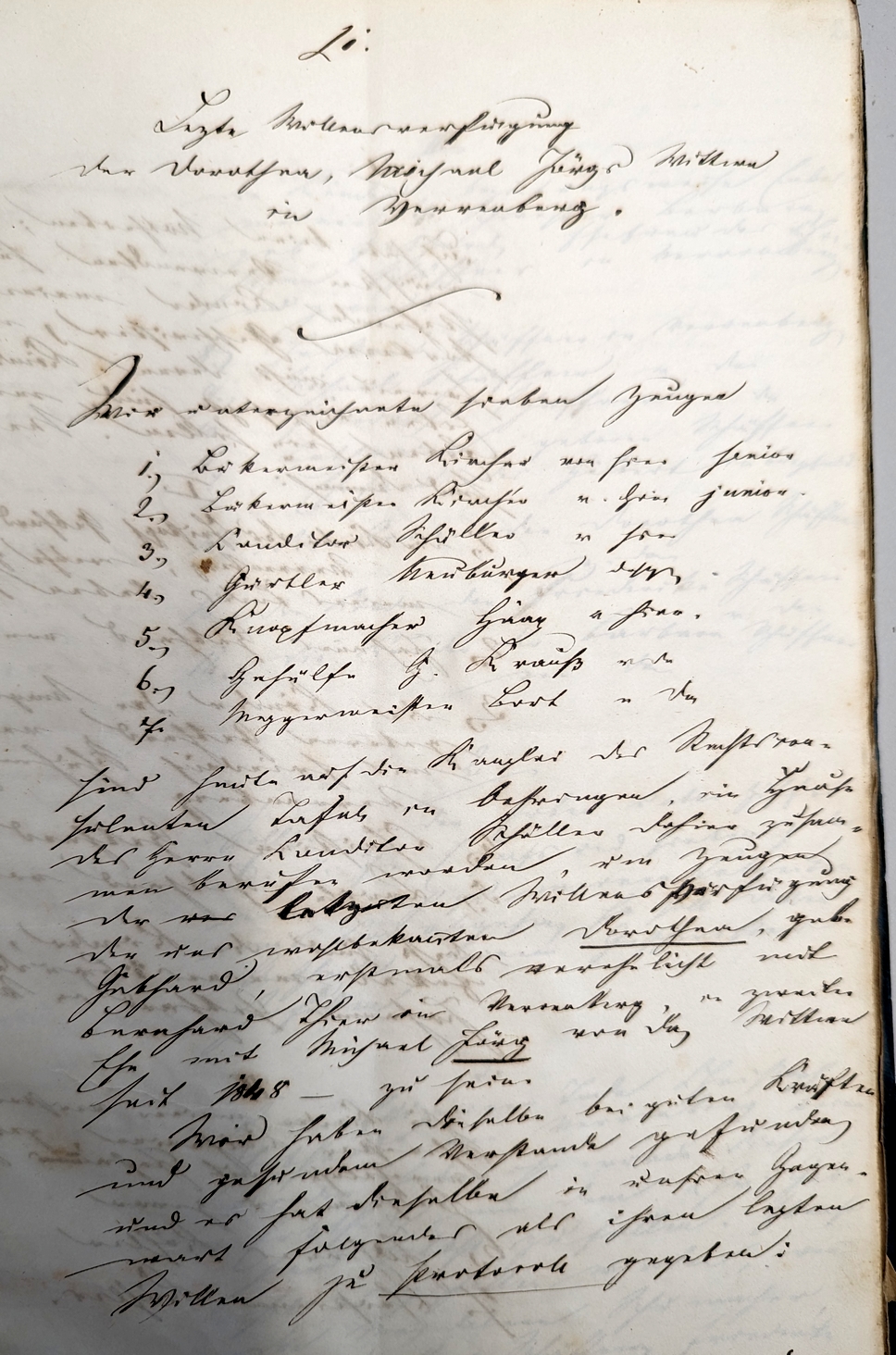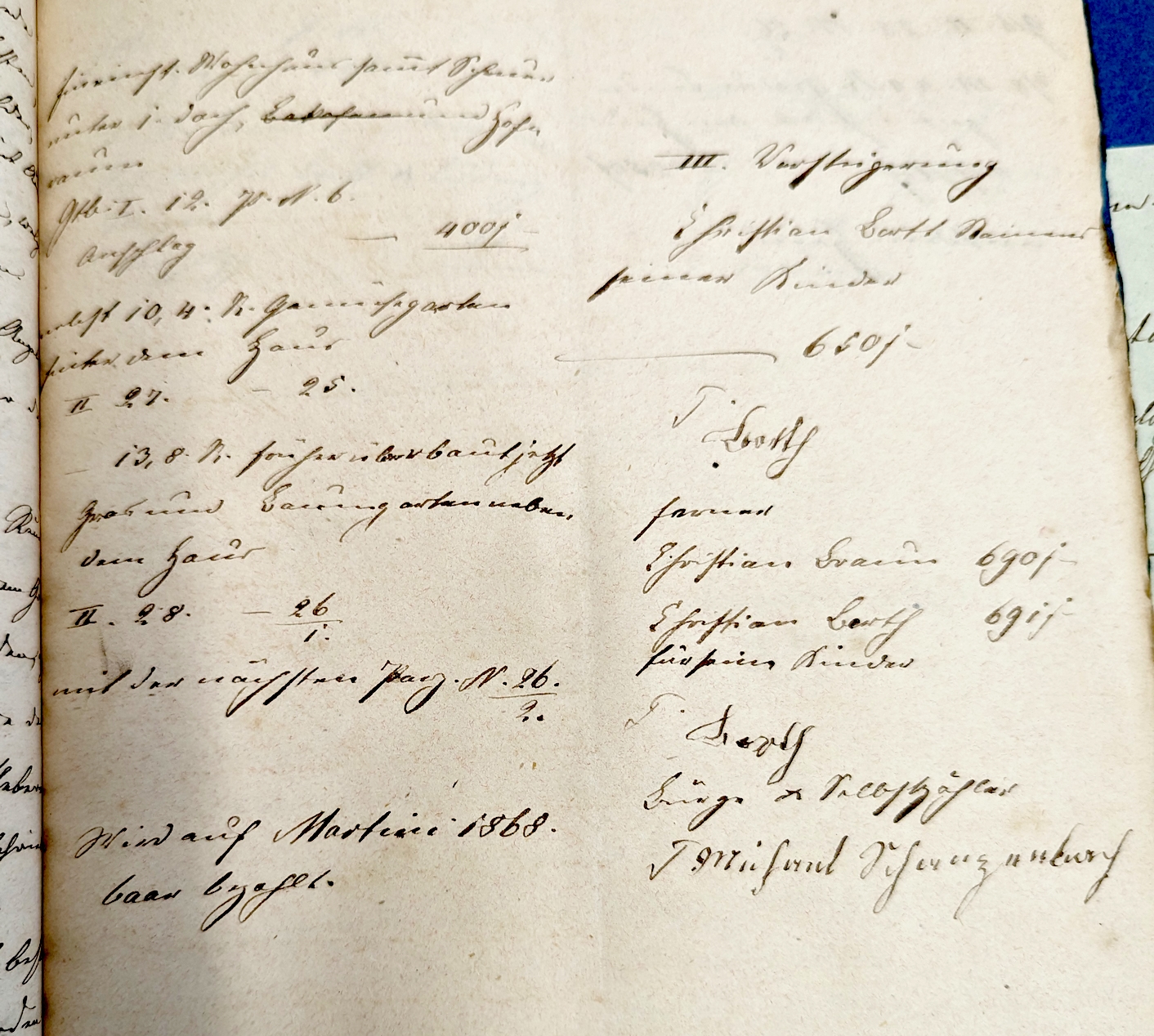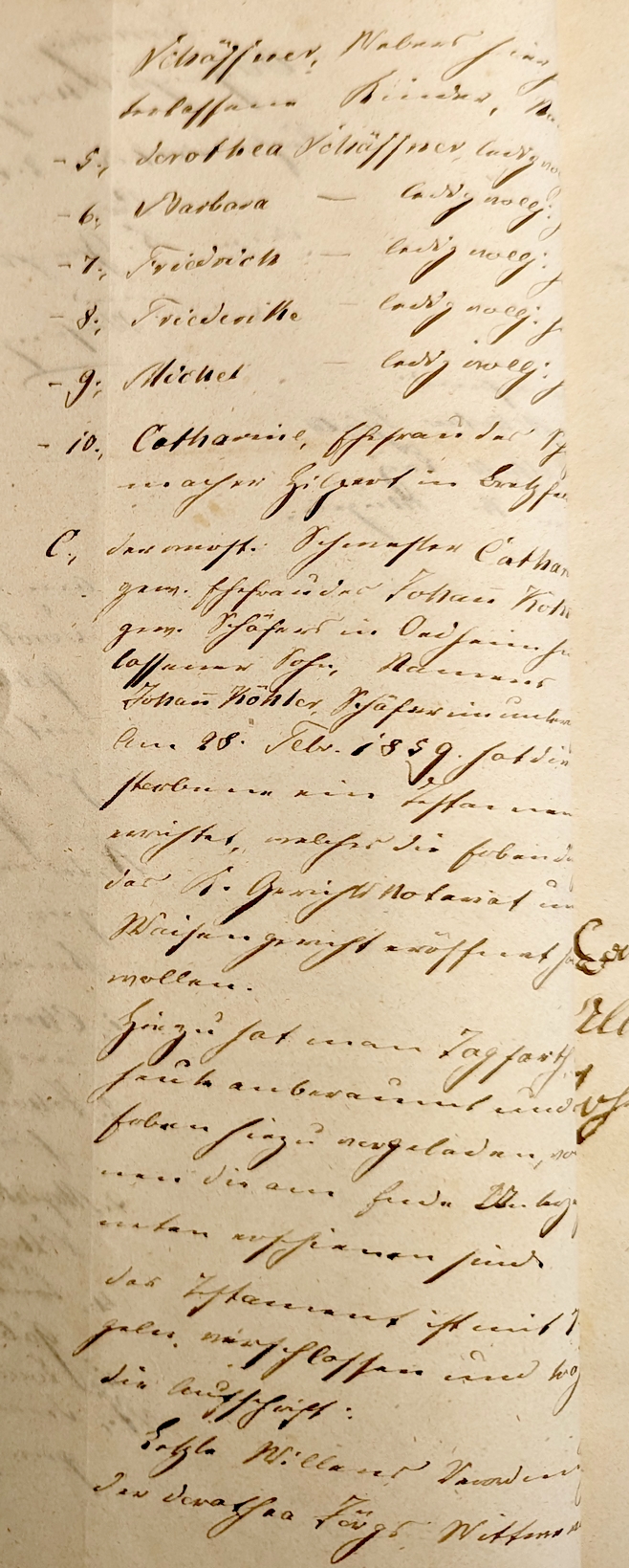 Nach dem Tod von Georg Michael Jörg wurde am 27.11.1850 diese "Kognitions Urkunde statt Real Theilung" erstellt. Als "Testat Erben" werden genannt: I. Die Wittwe Dorothea geb. Gebhardt II. vollbürtige Geschwister a) Eva, Wittwe des Christoph Braun gewesener Bürgers u Schneiders dahier b) Christine geb. Jörg, Ehefrau des Friedrich Walter, Taglöhner in Espig, Gemeindebezirk Untersteinbach c) Christian Jörg, ledig, volljährig Bauernknecht auf dem Klingenhof, Gemeindebezirk Neuenstein Eigentlich hatten die Eheleute in ihrem Ehe- und Erbvertrag vereinbart, dass beim Tod eines Ehegatten, der zurückbleibende alles erben soll.