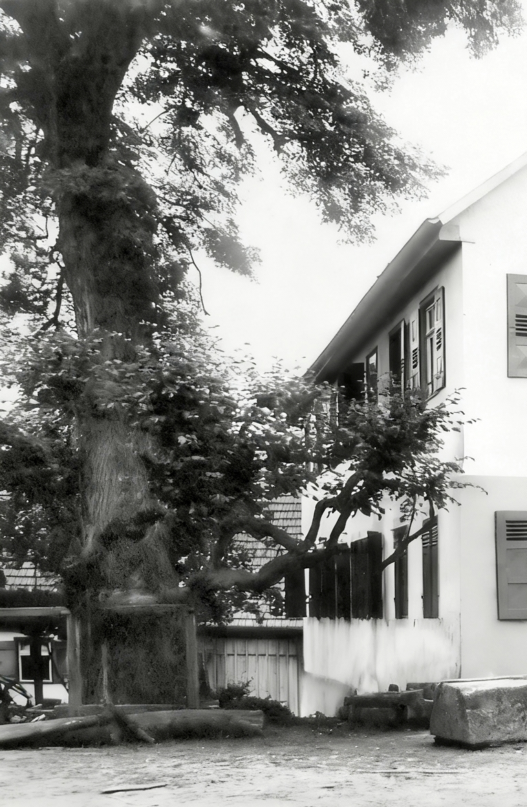 "13. Merkwürdigkeiten An solchen ist eines schönen großen Lindenbaums zu erwähnen, welcher Oben im Dorf, an der Straße, auf einem früher der Gemeinde gehörigen, im Jahr 1837/38 aber gegen den jezigen Schulhausbauplaz an den Bauern Franz Atz vertauschten freyen Platz steht, und von welchem das daneben stehende Gasthaus zur Linde seinen Namen entlehnt hat. Derselbe soll, wie man sich hier erzählt, vor ungefähr 200 Jahren durch einen Ortsangehörigen, welcher solchen aus dem Erlenbacher Wald geholt hat, gesezt worden seyn. Eine besondere Veranlassung hiezu ist nicht bekannt, wahrscheinlich war es eine Nachahmung der großen Linde zu Neuenstadt am Kocher, wie dies in andern Orten der Umgegend der Fall ist." |