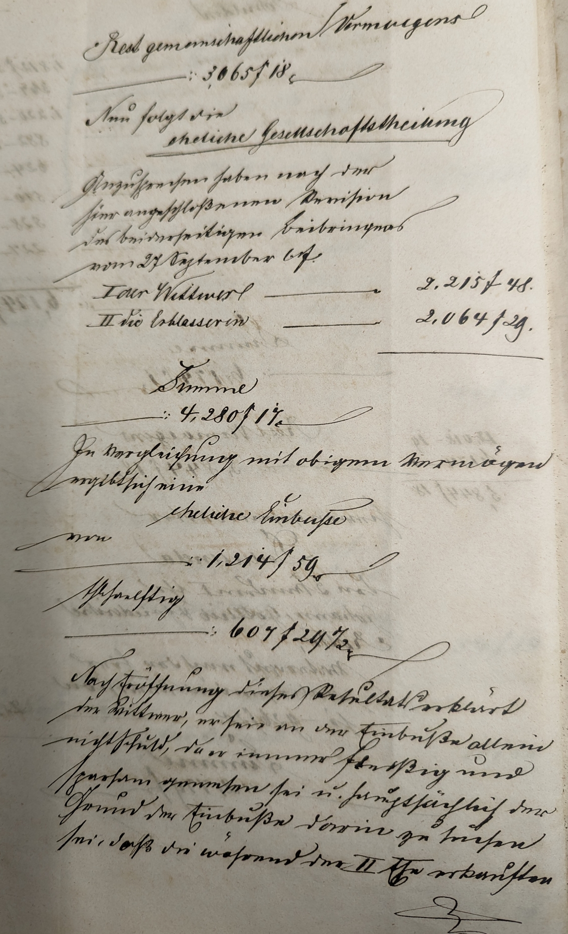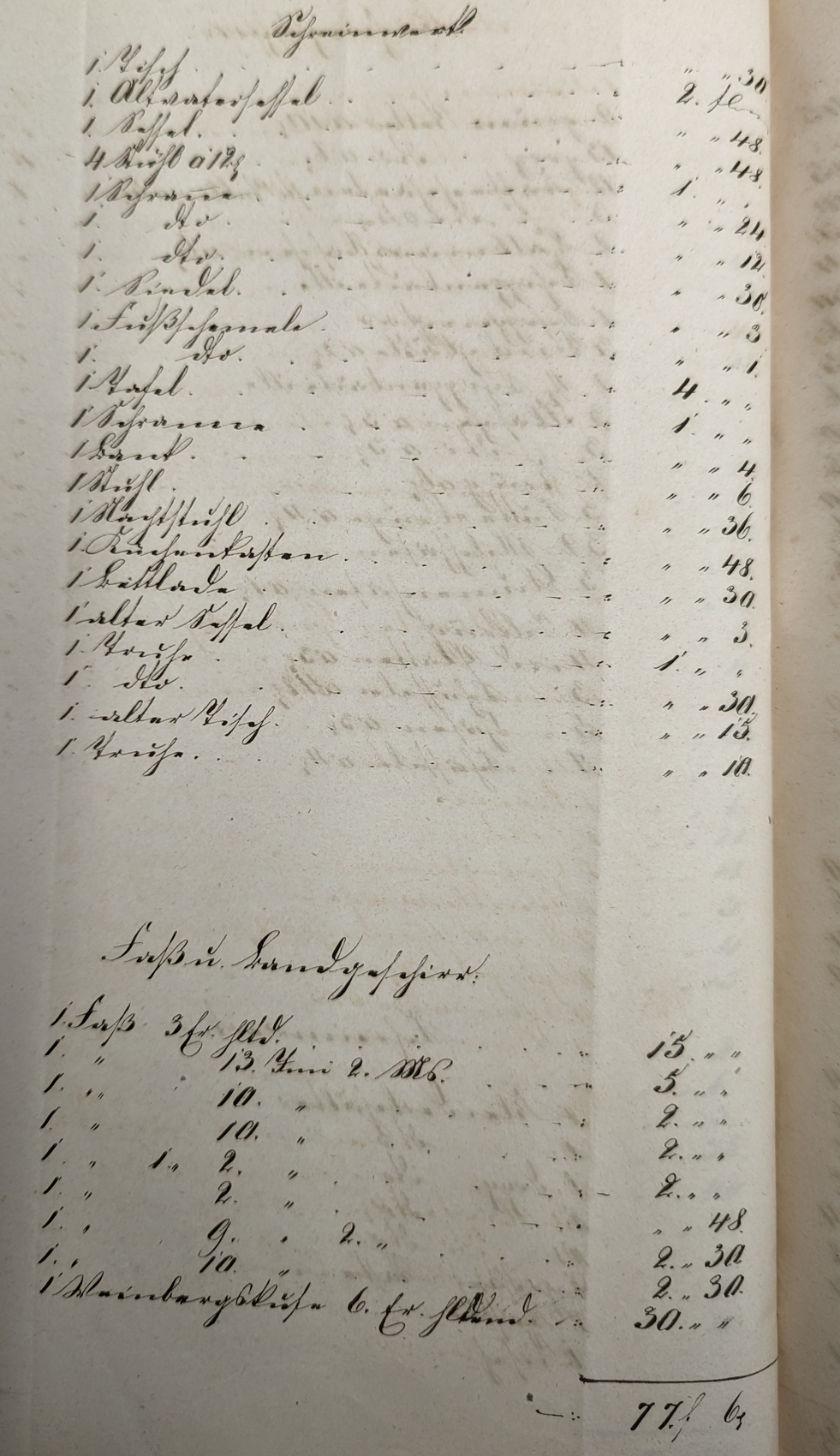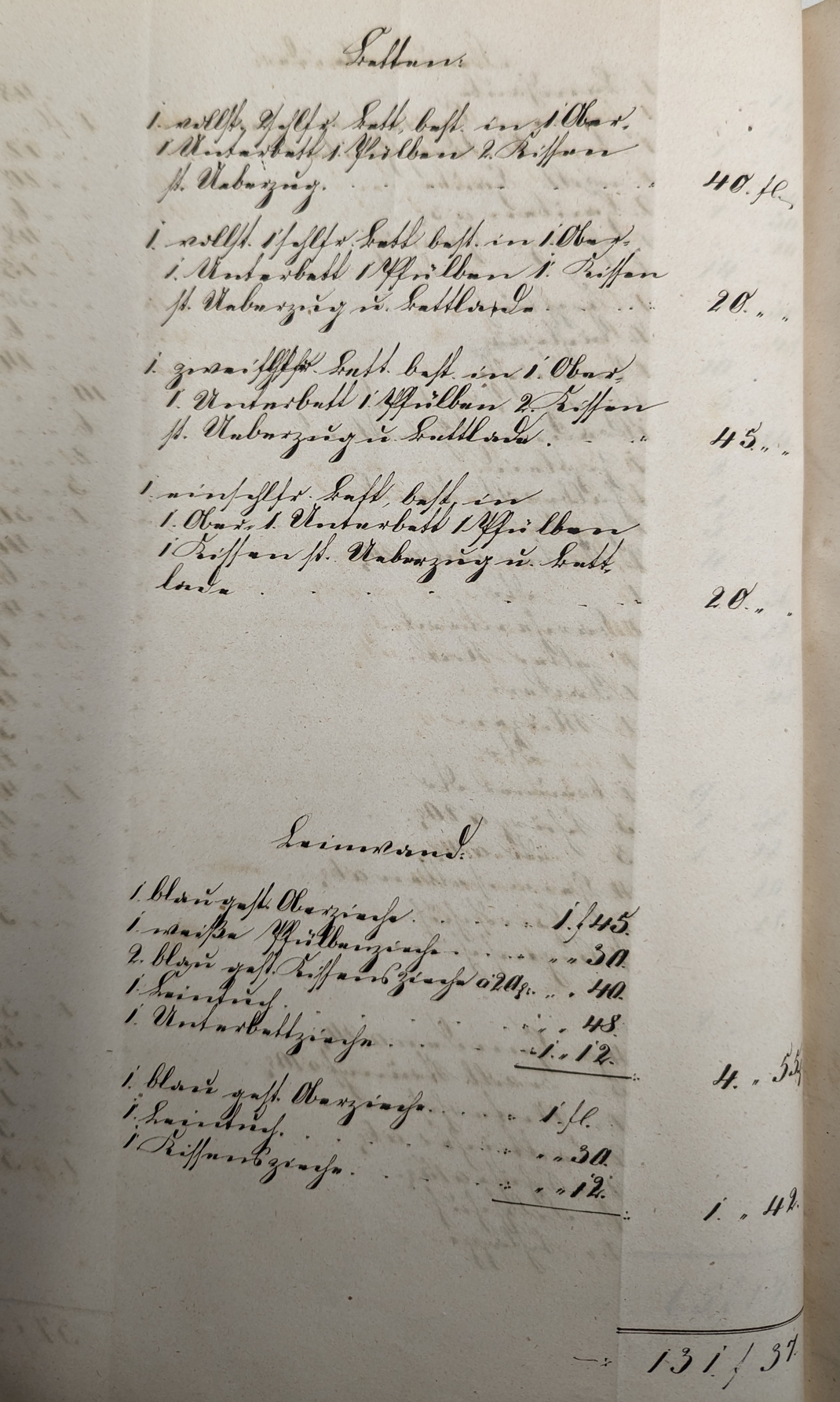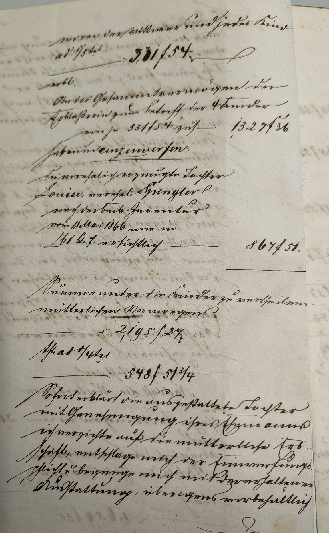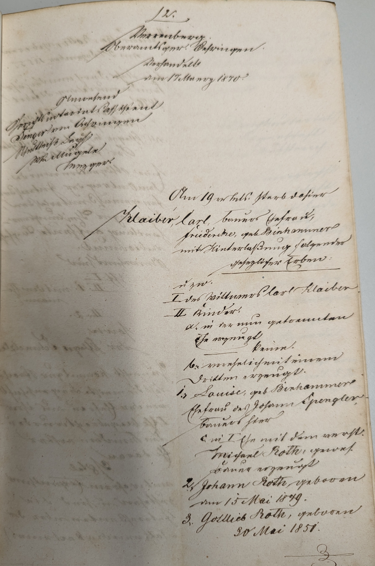 Leinwand 39 fl. 14 x. Mannskleider 63 fl. 17 x. 1 Flinte 2 fl. Nachlaß der verstorbenen Ehefrau: Gold und Silber 6 fl. Bücher: Predigtbuch v. Brastberger 1 fl. 30 x. 1 Morgen u. Abendsegenbuch 1 fl. 1 Paradies Gärtlein 45 x. 1 Bibel 40 x. 1 Gesangbuch 15 x. 1 Gebetbuch von Starck 12 x. 1 Gesangbuch 20 x. Die Tochter Louise Spengler verzichtet auf ihren Erbteil. Die drei Kinder aus 1.Ehe bekommen je 926 fl. 20 x. => gesamt 2.779 fl. Leider liegen nicht alle Seiten der Realteilung vor! 19.Februar 1870