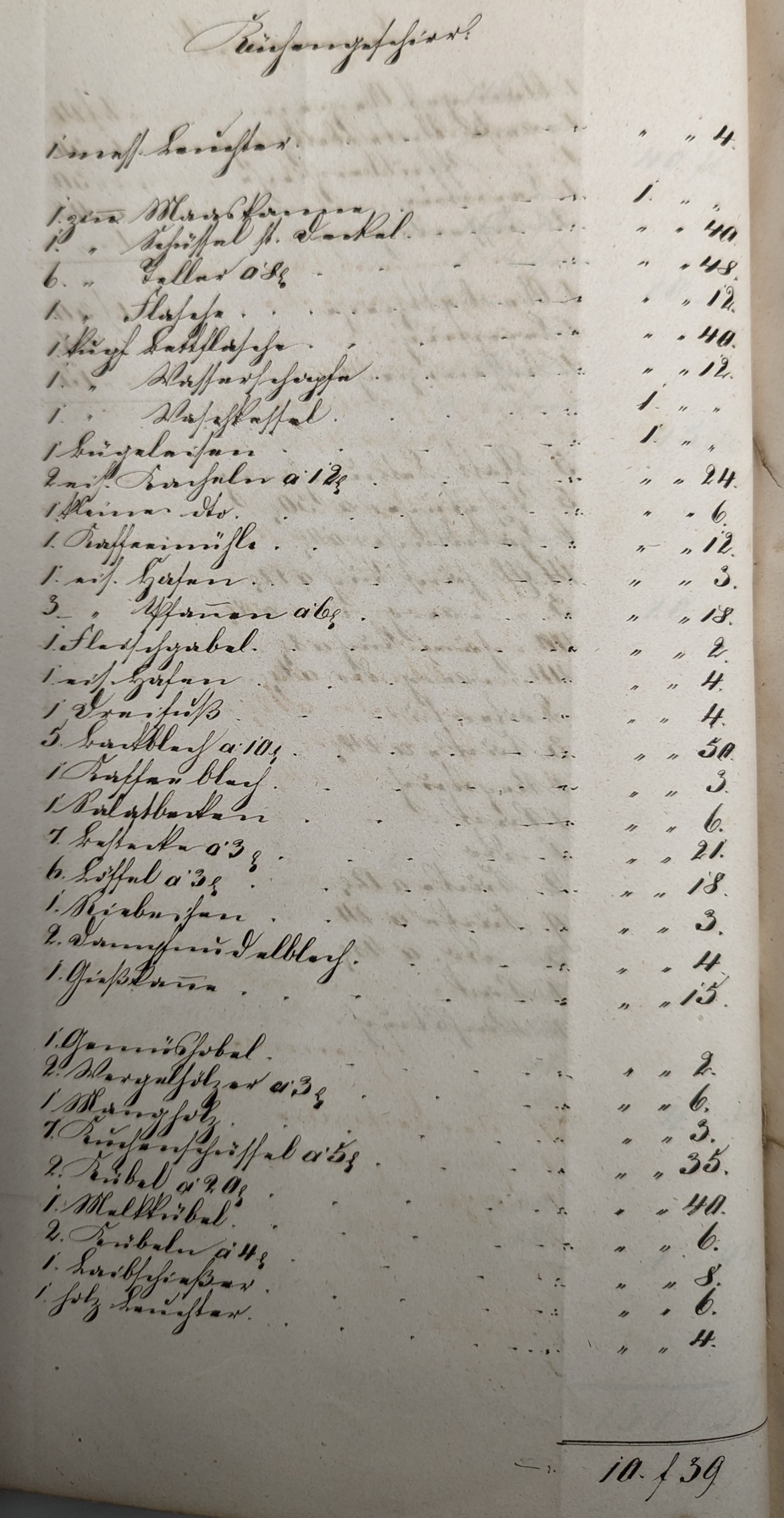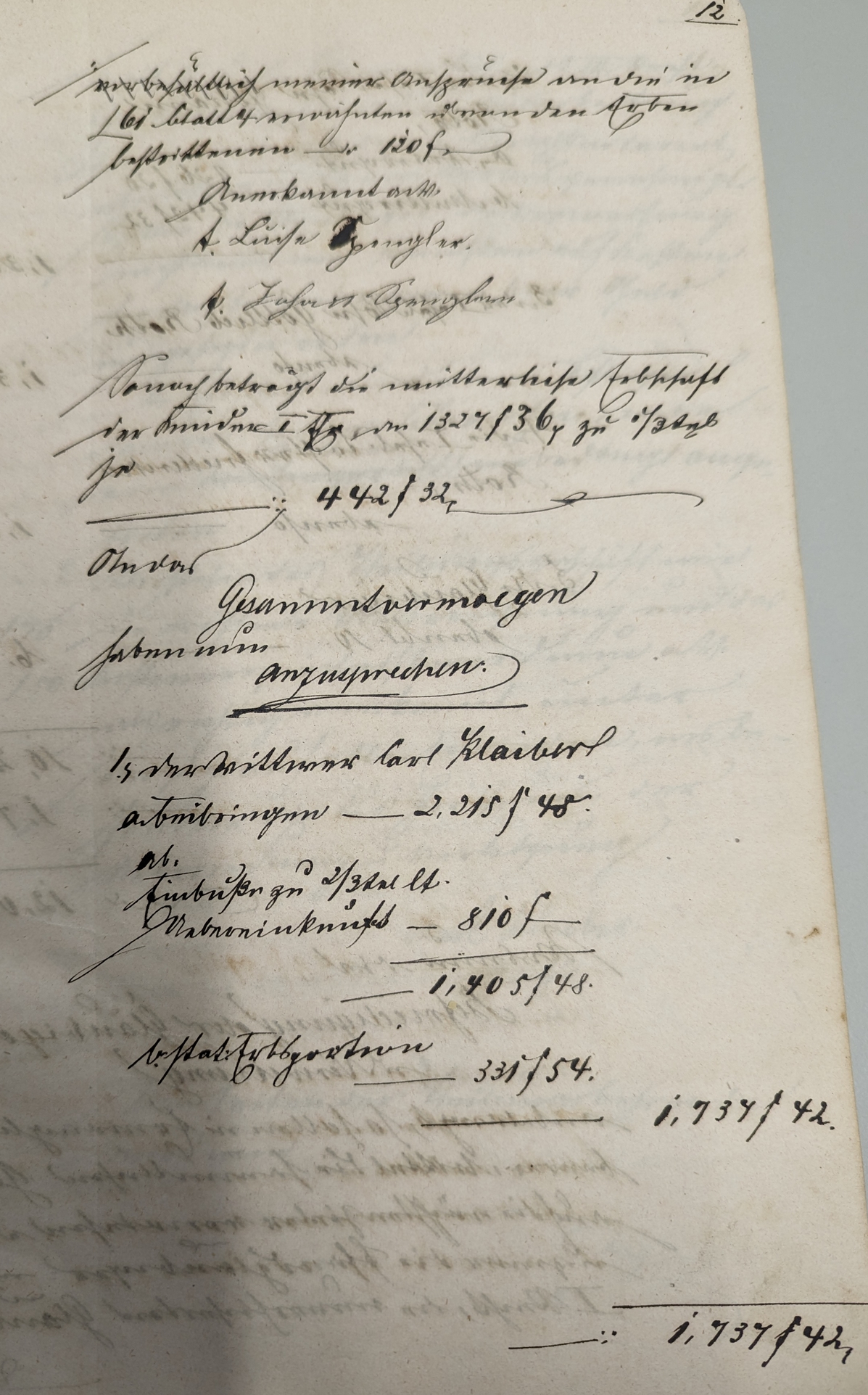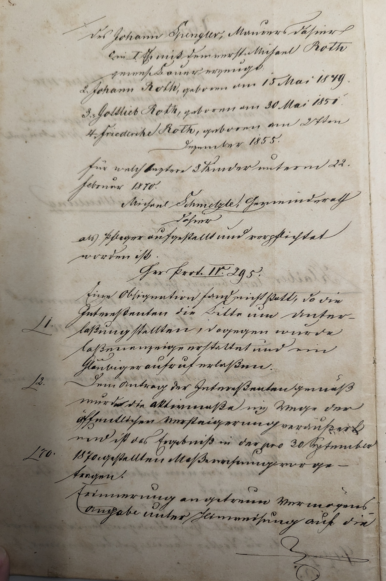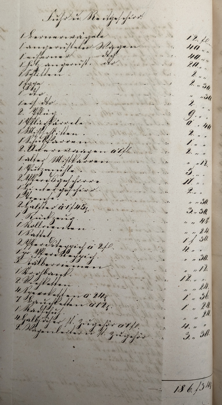 Leinwand 39 fl. 14 x. Mannskleider 63 fl. 17 x. 1 Flinte 2 fl. Nachlaß der verstorbenen Ehefrau: Gold und Silber 6 fl. Bücher: Predigtbuch v. Brastberger 1 fl. 30 x. 1 Morgen u. Abendsegenbuch 1 fl. 1 Paradies Gärtlein 45 x. 1 Bibel 40 x. 1 Gesangbuch 15 x. 1 Gebetbuch von Starck 12 x. 1 Gesangbuch 20 x. Die Tochter Louise Spengler verzichtet auf ihren Erbteil. Die drei Kinder aus 1.Ehe bekommen je 926 fl. 20 x. => gesamt 2.779 fl. Leider liegen nicht alle Seiten der Realteilung vor! 19.Februar 1870