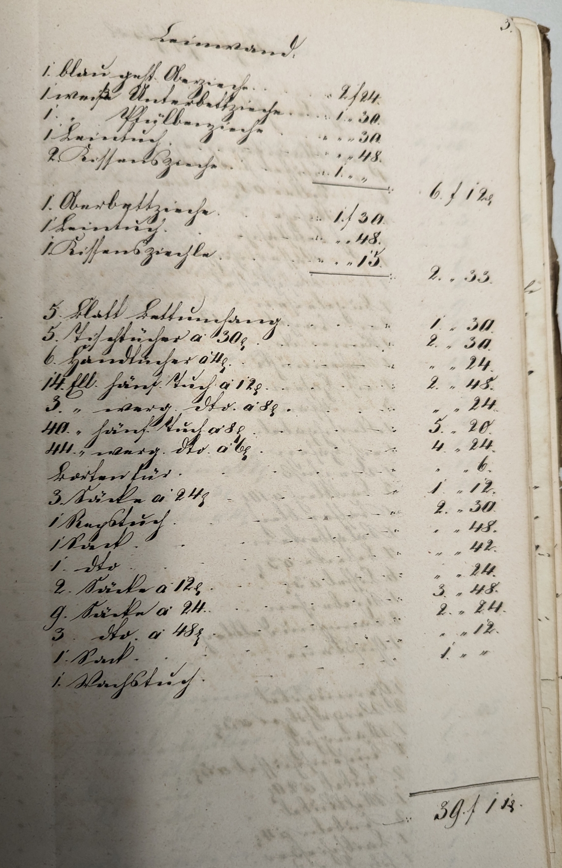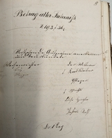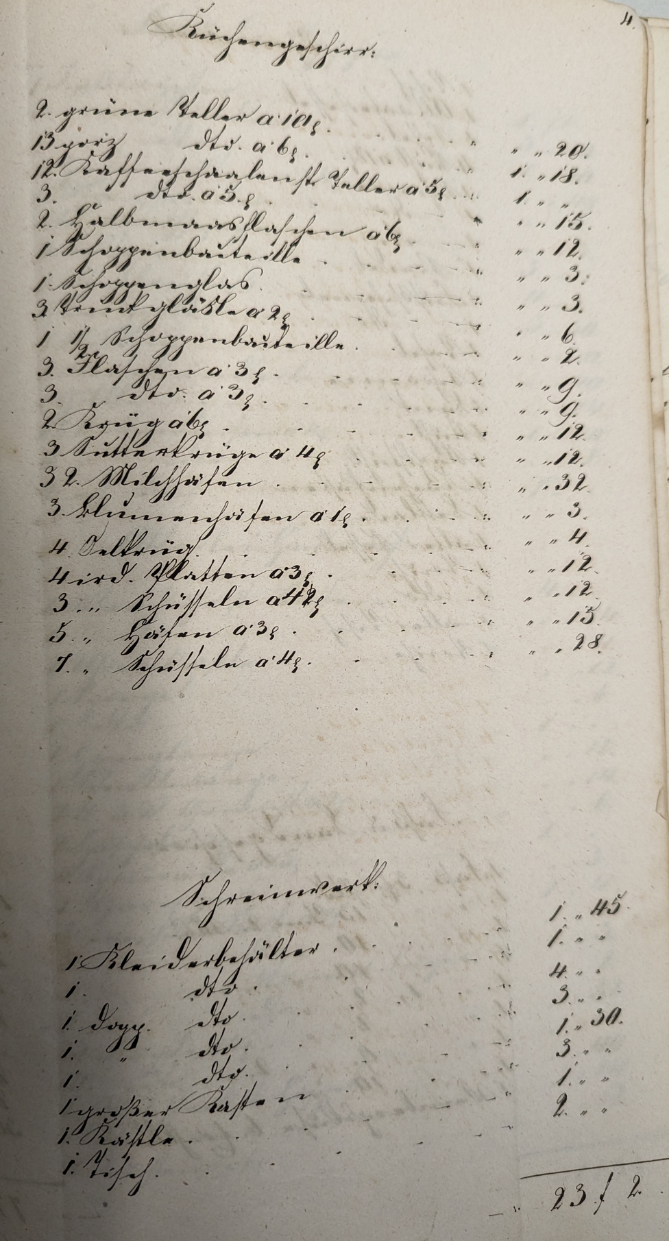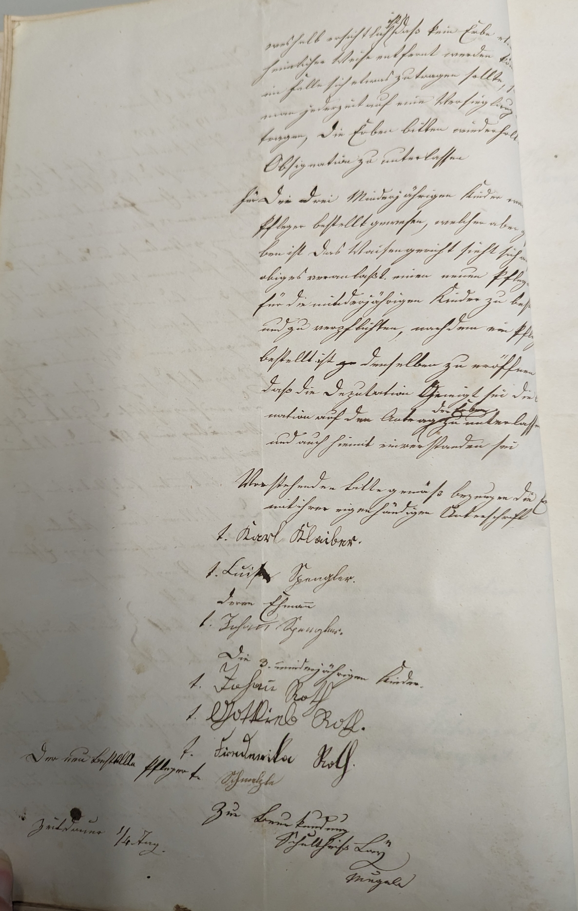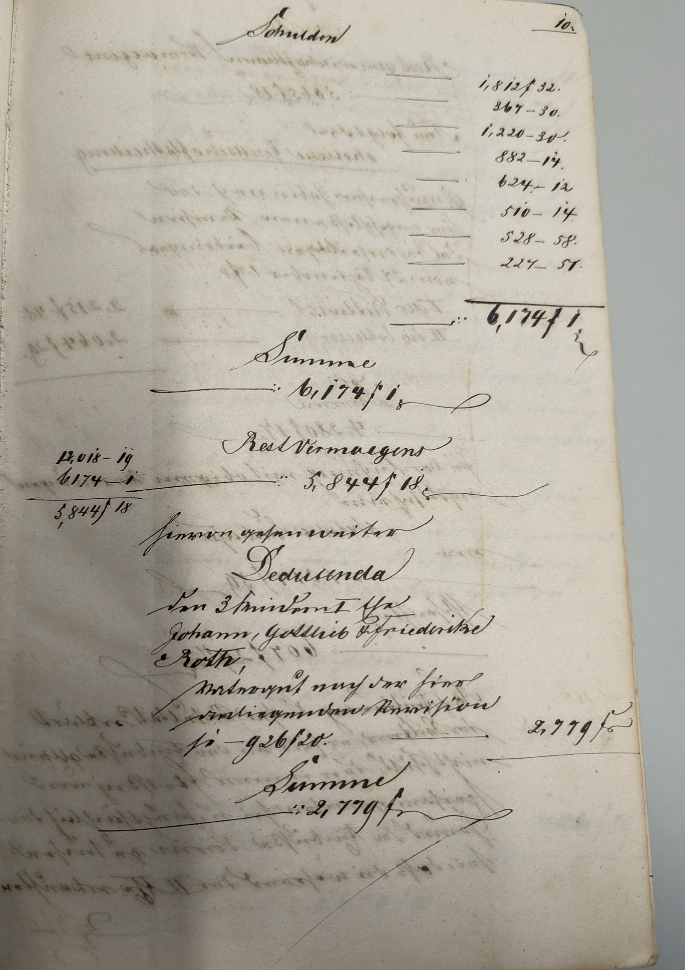 Leinwand 39 fl. 14 x. Mannskleider 63 fl. 17 x. 1 Flinte 2 fl. Nachlaß der verstorbenen Ehefrau: Gold und Silber 6 fl. Bücher: Predigtbuch v. Brastberger 1 fl. 30 x. 1 Morgen u. Abendsegenbuch 1 fl. 1 Paradies Gärtlein 45 x. 1 Bibel 40 x. 1 Gesangbuch 15 x. 1 Gebetbuch von Starck 12 x. 1 Gesangbuch 20 x. Die Tochter Louise Spengler verzichtet auf ihren Erbteil. Die drei Kinder aus 1.Ehe bekommen je 926 fl. 20 x. => gesamt 2.779 fl. Leider liegen nicht alle Seiten der Realteilung vor! 19.Februar 1870