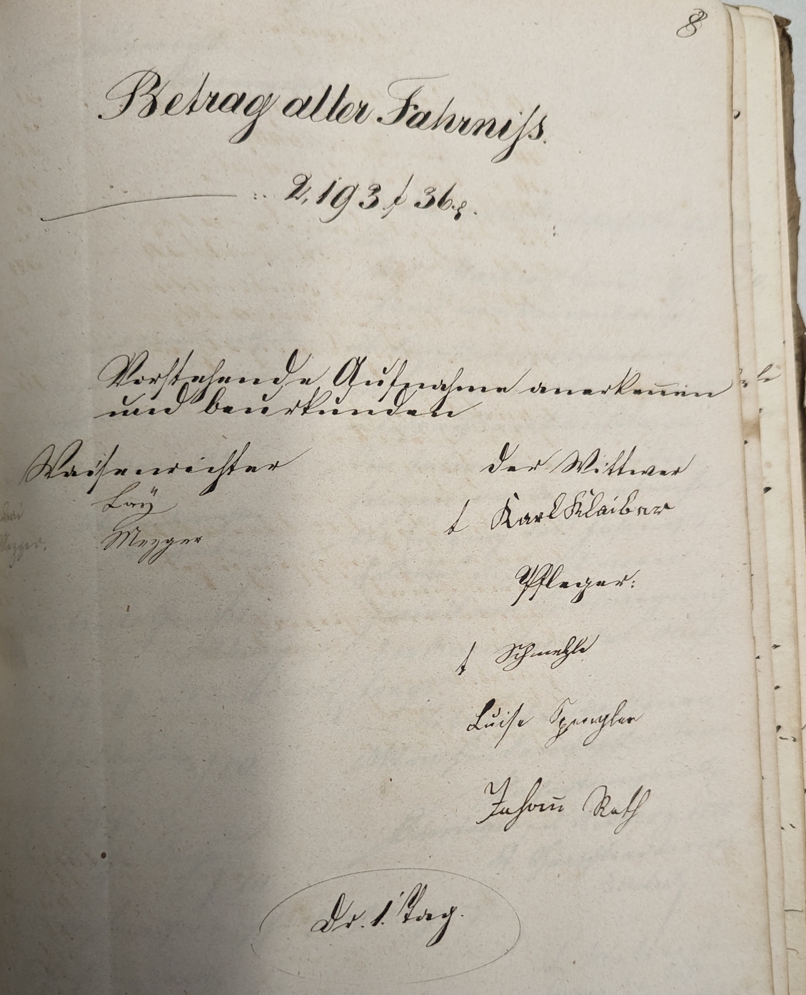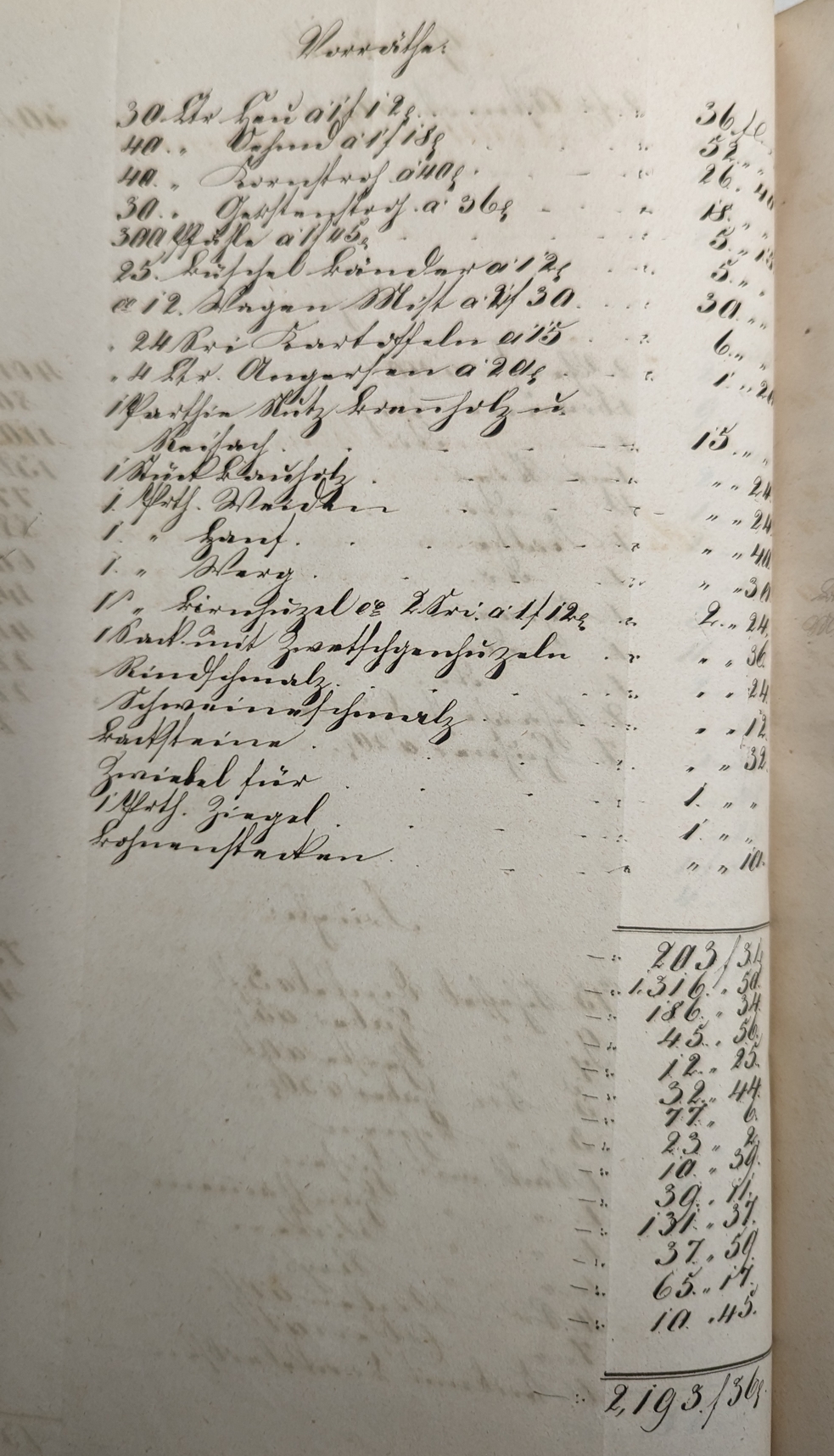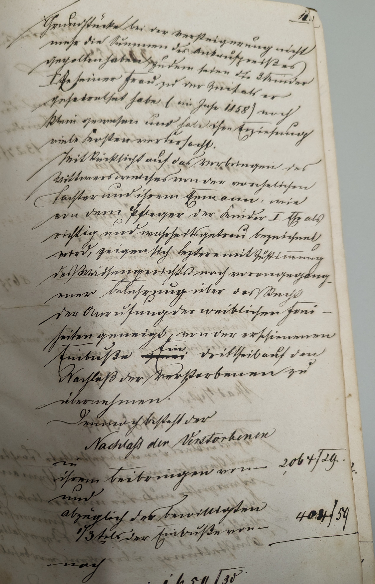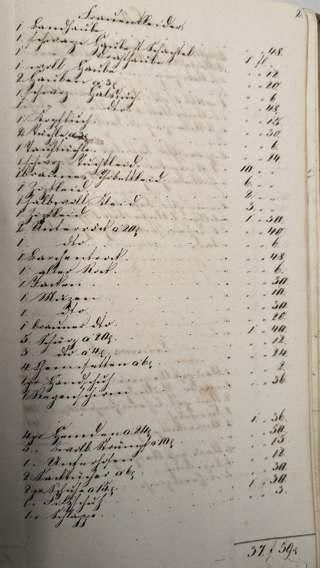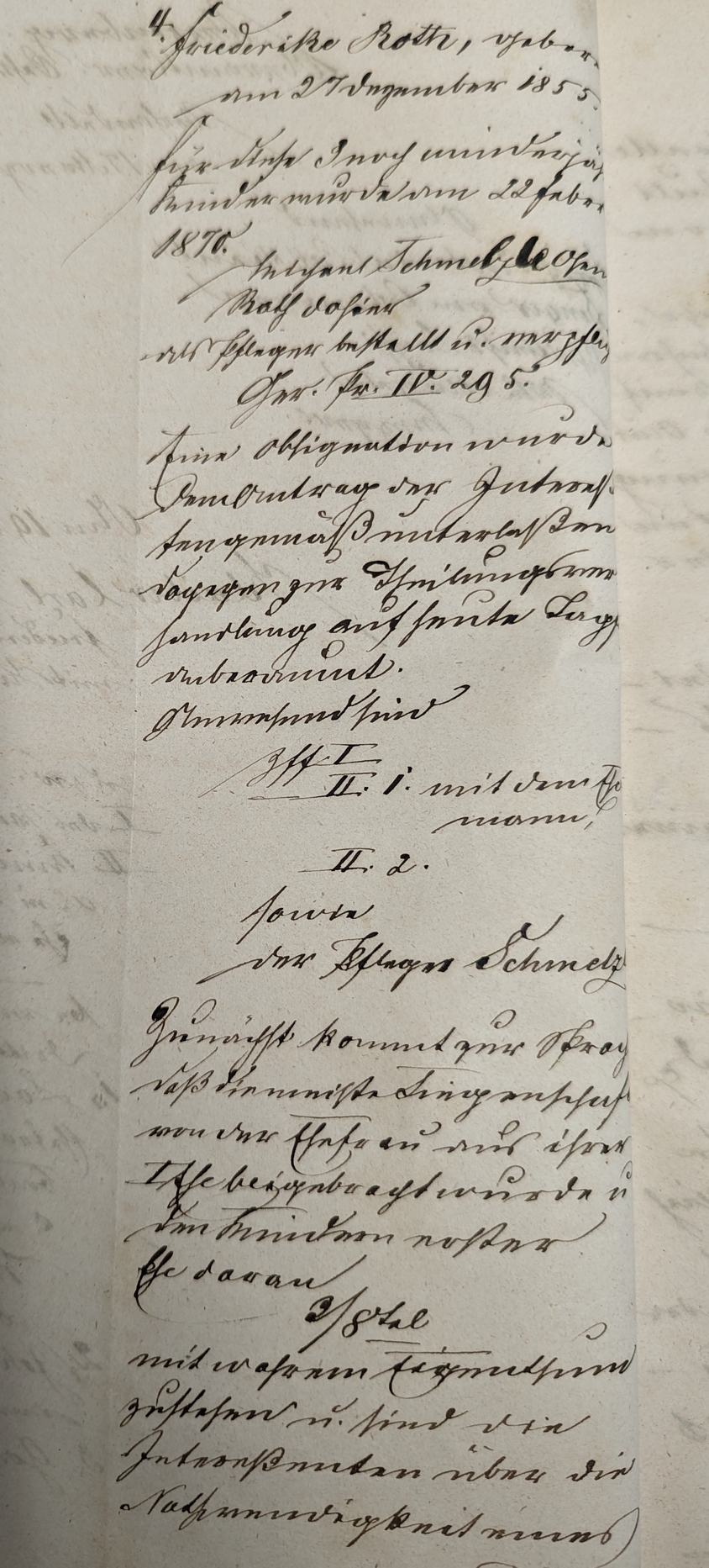 Leinwand 39 fl. 14 x. Mannskleider 63 fl. 17 x. 1 Flinte 2 fl. Nachlaß der verstorbenen Ehefrau: Gold und Silber 6 fl. Bücher: Predigtbuch v. Brastberger 1 fl. 30 x. 1 Morgen u. Abendsegenbuch 1 fl. 1 Paradies Gärtlein 45 x. 1 Bibel 40 x. 1 Gesangbuch 15 x. 1 Gebetbuch von Starck 12 x. 1 Gesangbuch 20 x. Die Tochter Louise Spengler verzichtet auf ihren Erbteil. Die drei Kinder aus 1.Ehe bekommen je 926 fl. 20 x. => gesamt 2.779 fl. Leider liegen nicht alle Seiten der Realteilung vor! 19.Februar 1870