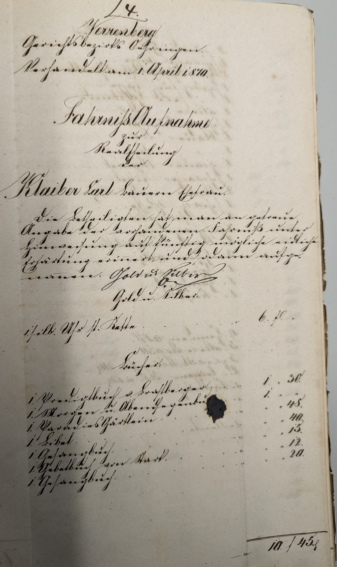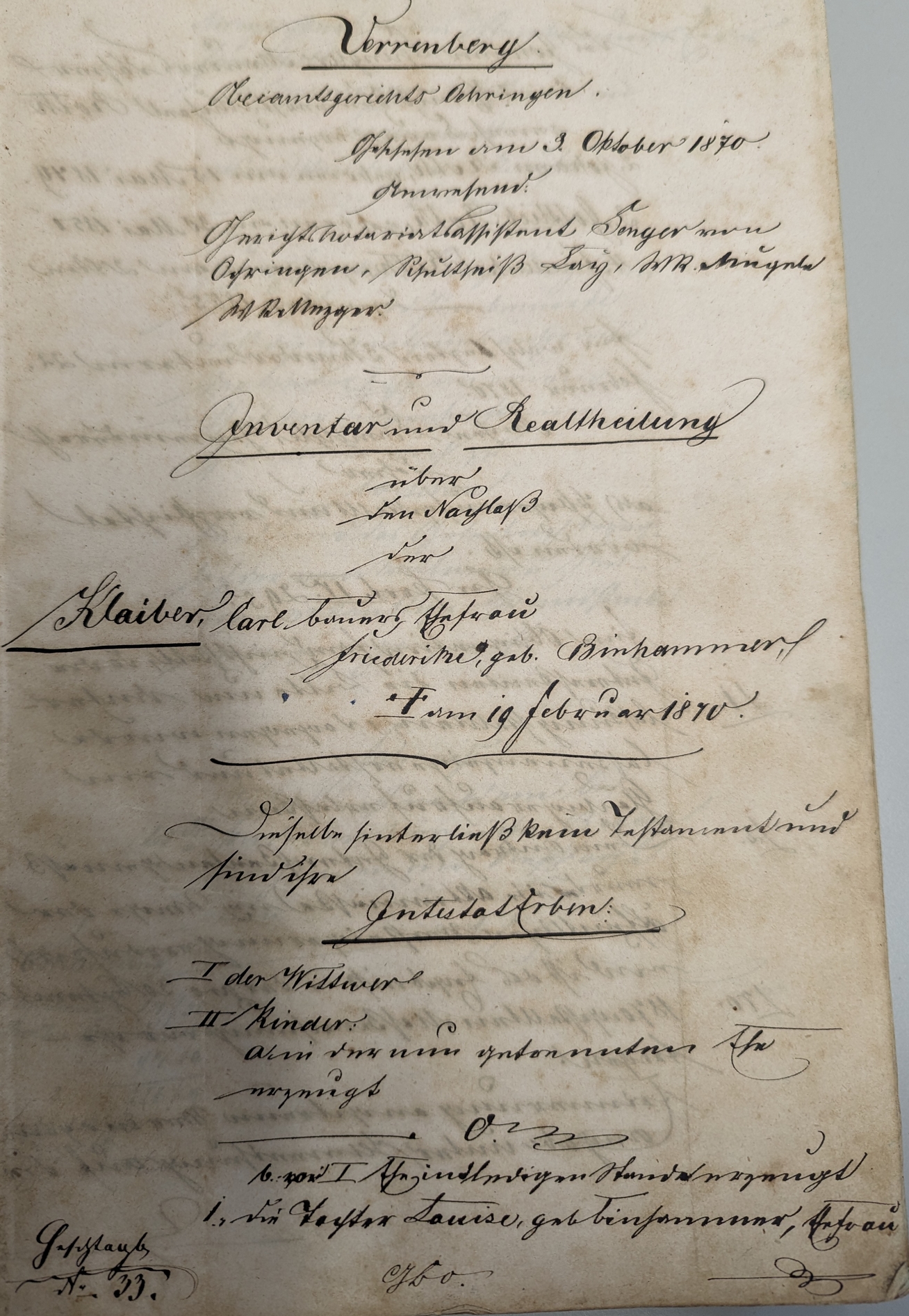 | In dieser Realteilung der Witwe des Karl Klaiber vom 03.10.1870 findet sich das folgende: Die Intestat Erben sind: I. der Wittwer II. Kinder: aus dieser Ehe gibt es keine (überlebenden) Kinder. 1. voreheliche Tochter Louise Binhammer, Ehefrau des Johann Spengler 2. Johann Roth, geboren am 15.05.1849 3. Gottlieb Roth geboren am 30.05.1851 4. Friederike Roth, geboren am 26.12.1855 für die drei "Roth Kinder" wurde Michael Schmelzle als Pfleger eingesetzt. Liegenschaft 0 fl. (Verkauf ist bereits erfolgt) Fahrniß 226 fl. 9 x. Obstmost 30 fl. Vieh: 2 Pferde a 200 fl. 400 fl. 1 braune Kuh 80 fl. 1 braune Kuh 110 fl. 1 gr. Stier 132 fl. 1 Stier 77 fl. 1 Kalbe 88 fl. 1 Kalbe 60 fl. 1 Schwein 44 fl. 1 Schwein 44 fl. 1 Schwein 22 fl. 2 Schaafe Lämmer 22 fl. 7 Hühner 2 fl. 20 x. Früchte