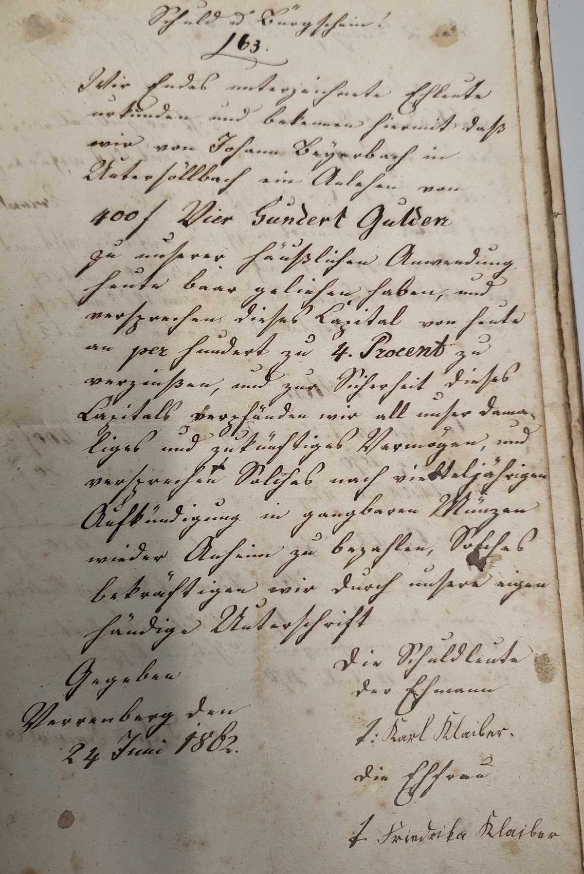 | Im Verrenberger Gemeinderatsprotokoll vom 28.August 1858 findet sich folgendes: Es erschien Carl Klaiber Sohn des Christoph Klaiber von Bretzfeld und trägt vor. Ich habe mich mit der Michael Roths Witwe Friederika geborne Binhammer von hier Ehlich versprochen und Bitte daher mir das hiesige Gemeinde und Activ Bürgerrecht zu ertheilen. Zur Begründung dieses Gesuchs hinterlegte Bittsteller einen von dem Gemeinderath Brezfeld gefertigten Geburtsbrief nebst Pfarr Amtlich beglaubigten Taufschein vor, worauf Bittsteller ein gutes Prädikat und an Vermögen 1200f. besizt. Worauf nichts in Nuznießung steht und keine Schulden haften. Dessen Verlobte besizt selbst ein Vermögen welches ihr bei der Eventhualtheilung .... erster Ehe zugefallen ist ca. 800f. weshalb bei beiden Verlobten der Nahrungsstand für gesichert erscheint. Da also der Fall hierin nicht zutrifft in welchem der Bürgerausschuß um sein gutächerliche Äußerung zu vernehmen wäre, so wurde einstimmig Beschlossen Den Bittsteller in das hies. Gemeinde und Activ Bürgerrecht aufzunehmen und Heurathserlaubniß zu ertheilen und anzusezen