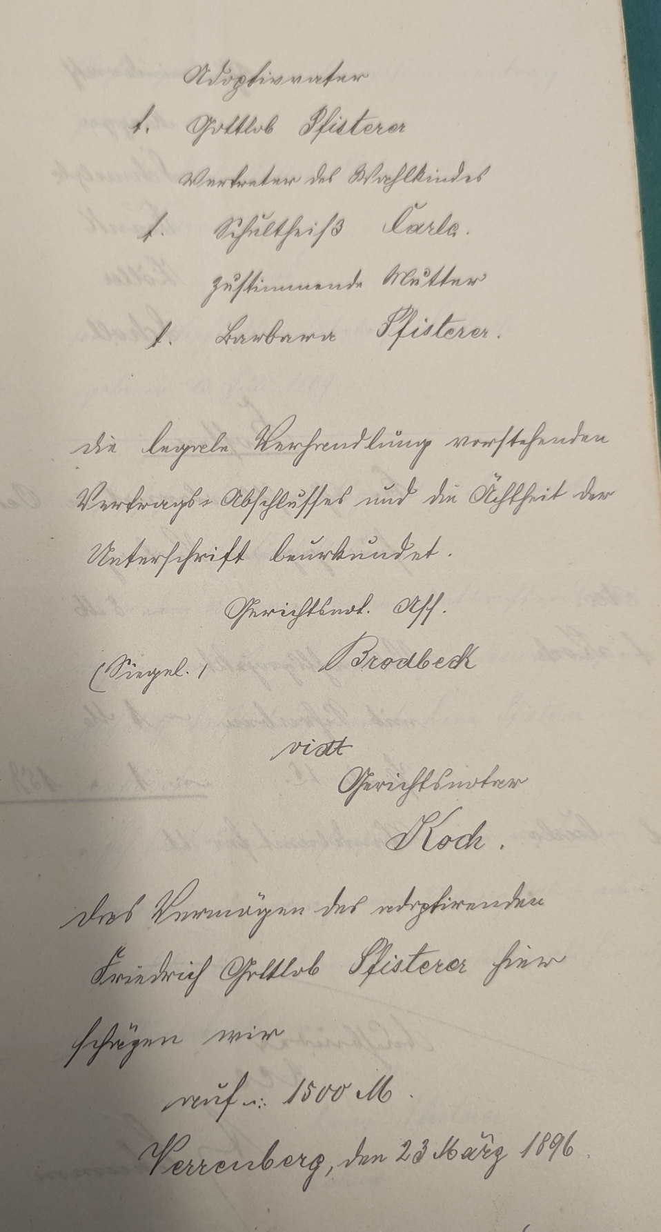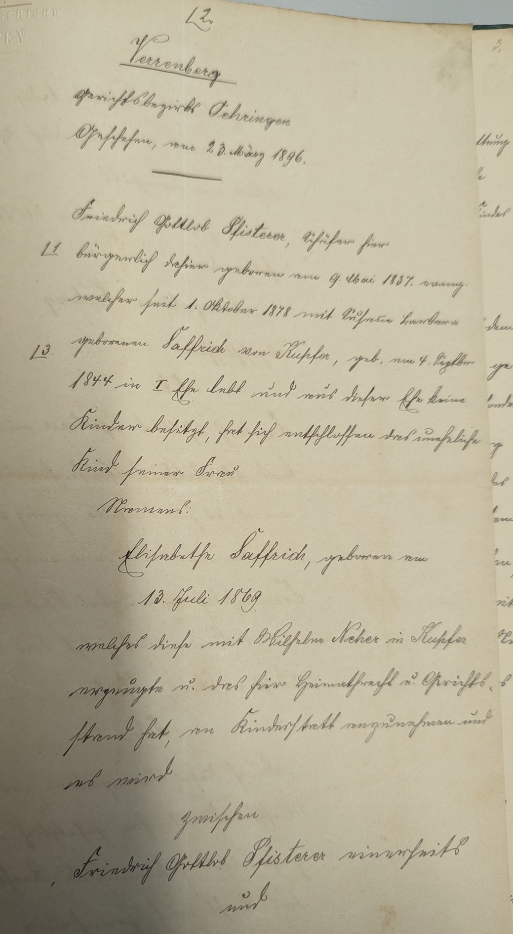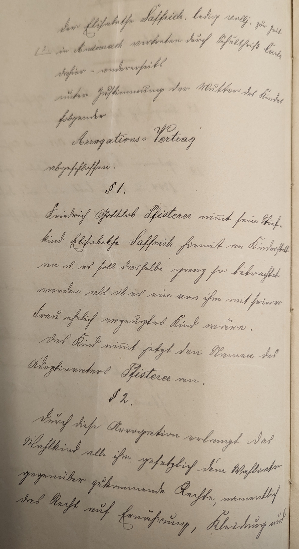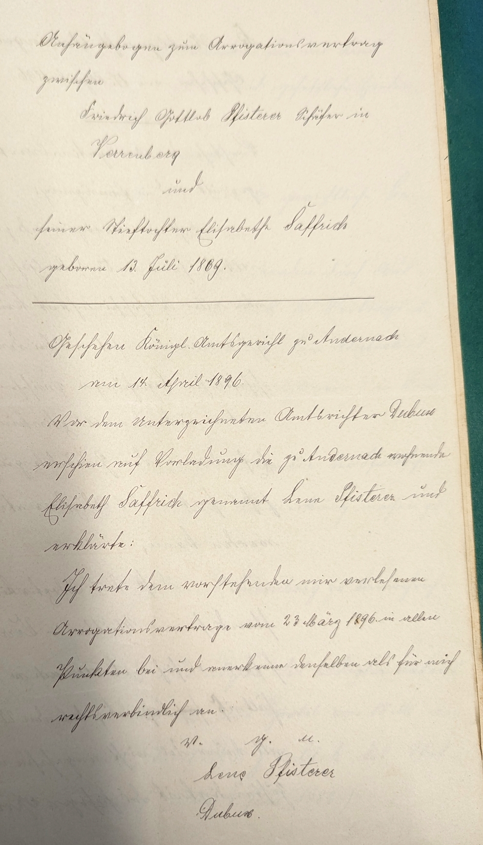 In diesem Dokument vom 23.03.1896 findet sich das folgende: Es gab drei Geburten in dieser Ehe, aber keines der Kinder wurde älter als einen Tag. Daher hatte er sich nun entschlossen das uneheliche Kind seiner Frau, Elisabeth Saffrich "... an Kinderstadt anzunehmen." Dazu wurde zwischen beiden ein Arrogations-Vertrag abgeschlossen. Sie bekommt alle Rechte eines ehelichen kindes an und übernimmt den Familiennamen Pfisterer |