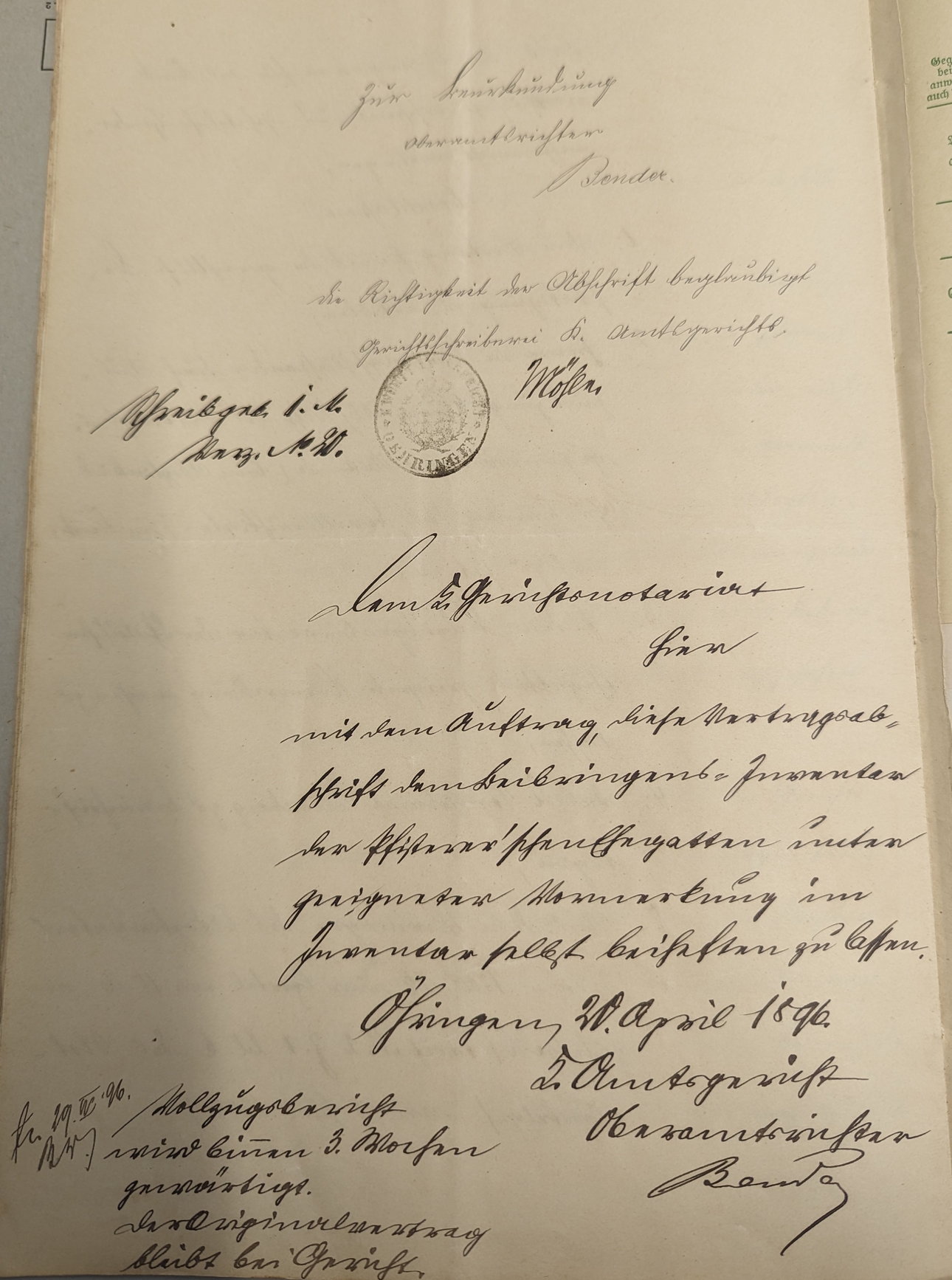 Friedrich Gottlob Pfisterer nimmt Elisabet Saffrich als leibliches Kind an - 1896 | ||||||||||