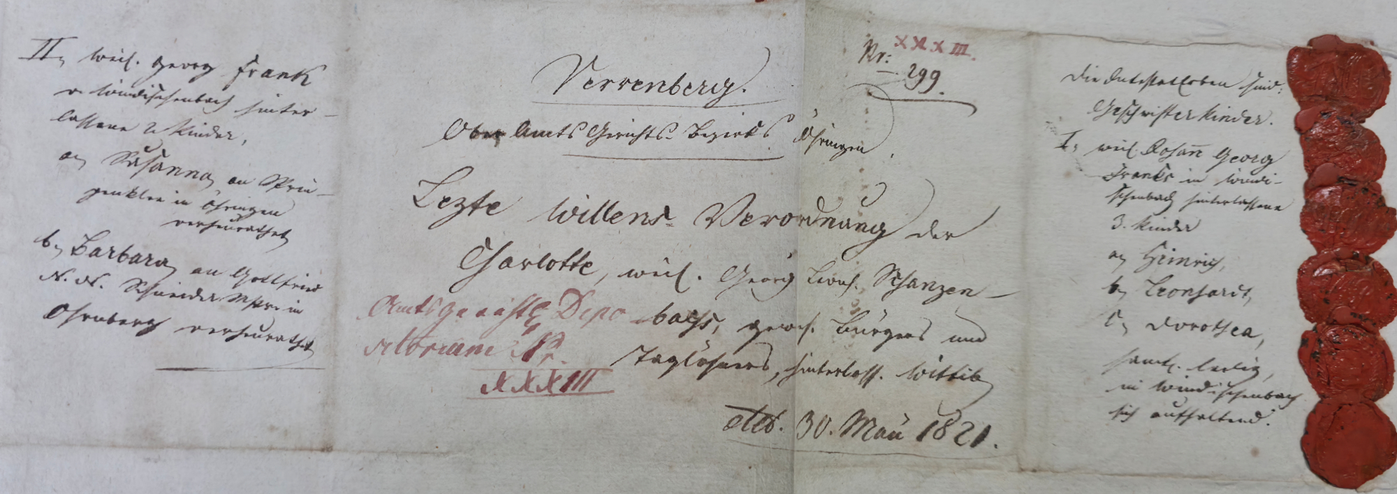 In dieser Realteilung vom 12.02.1833 findet sich das folgende: Es fällt auf, dass sie als Erben nicht ihre Stiefkinder Johann Georg und Georg Michael Schanzenbach einsetzt, sondern die Kinder ihrer verstorbenen Brüder! Das beigefügte Testament stammte vom 30.05.1821.