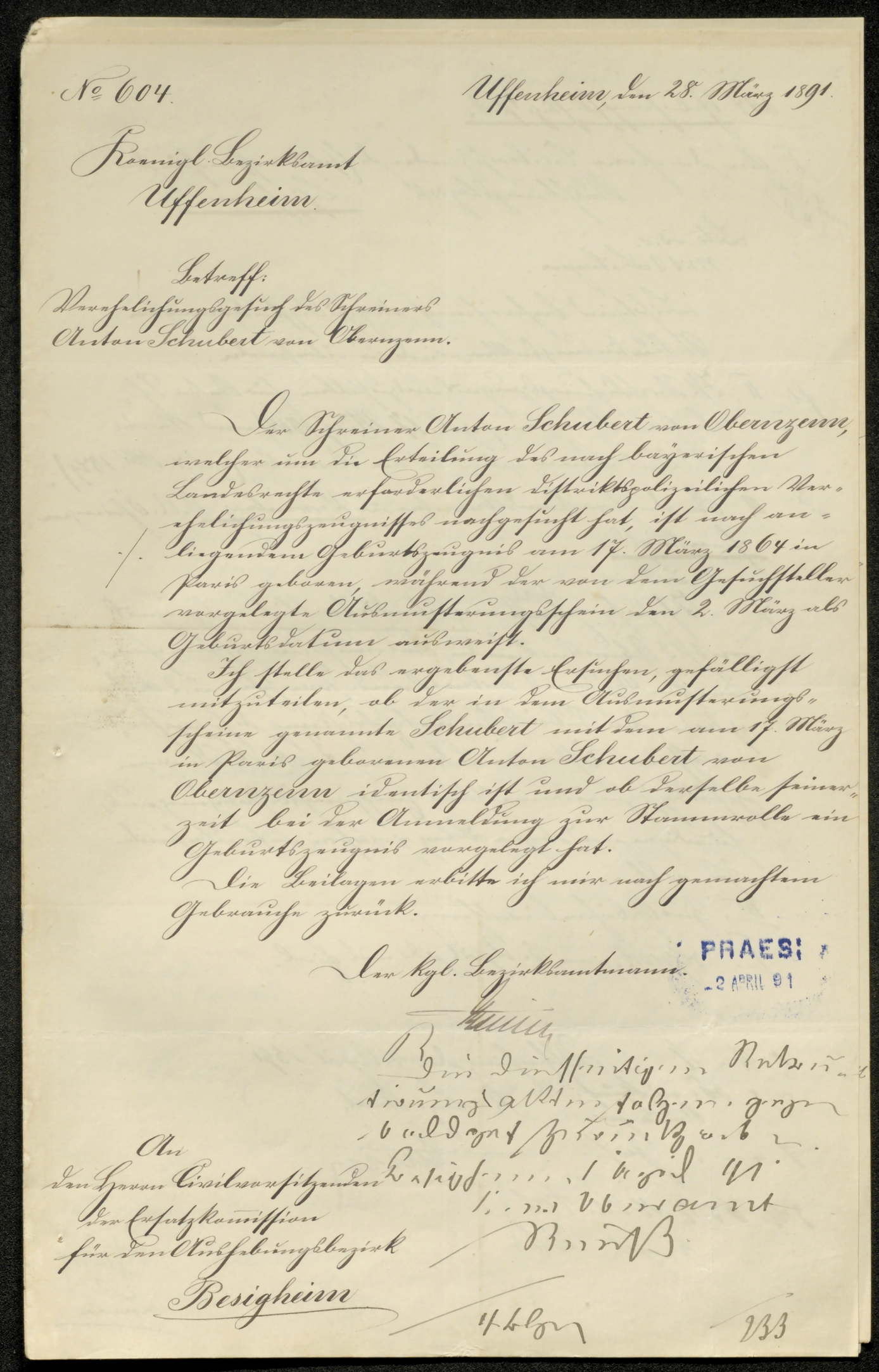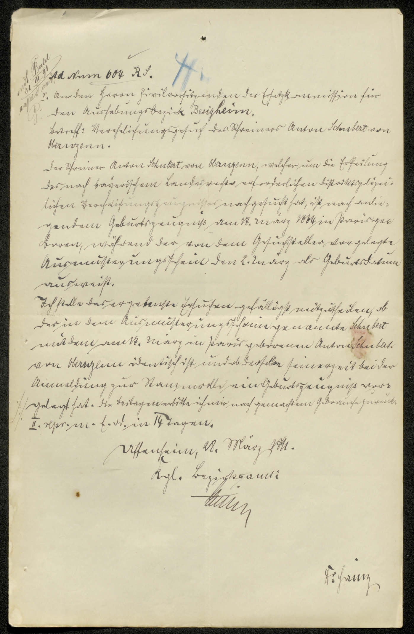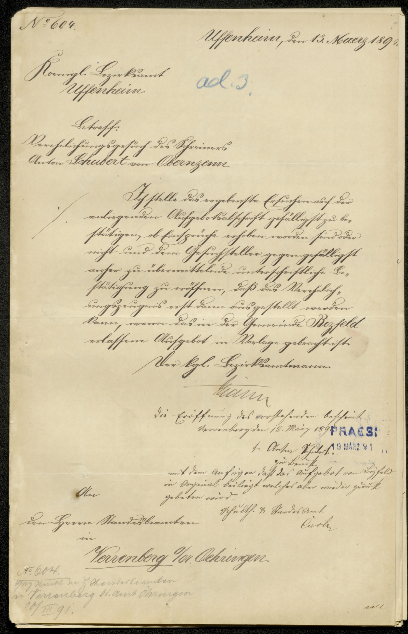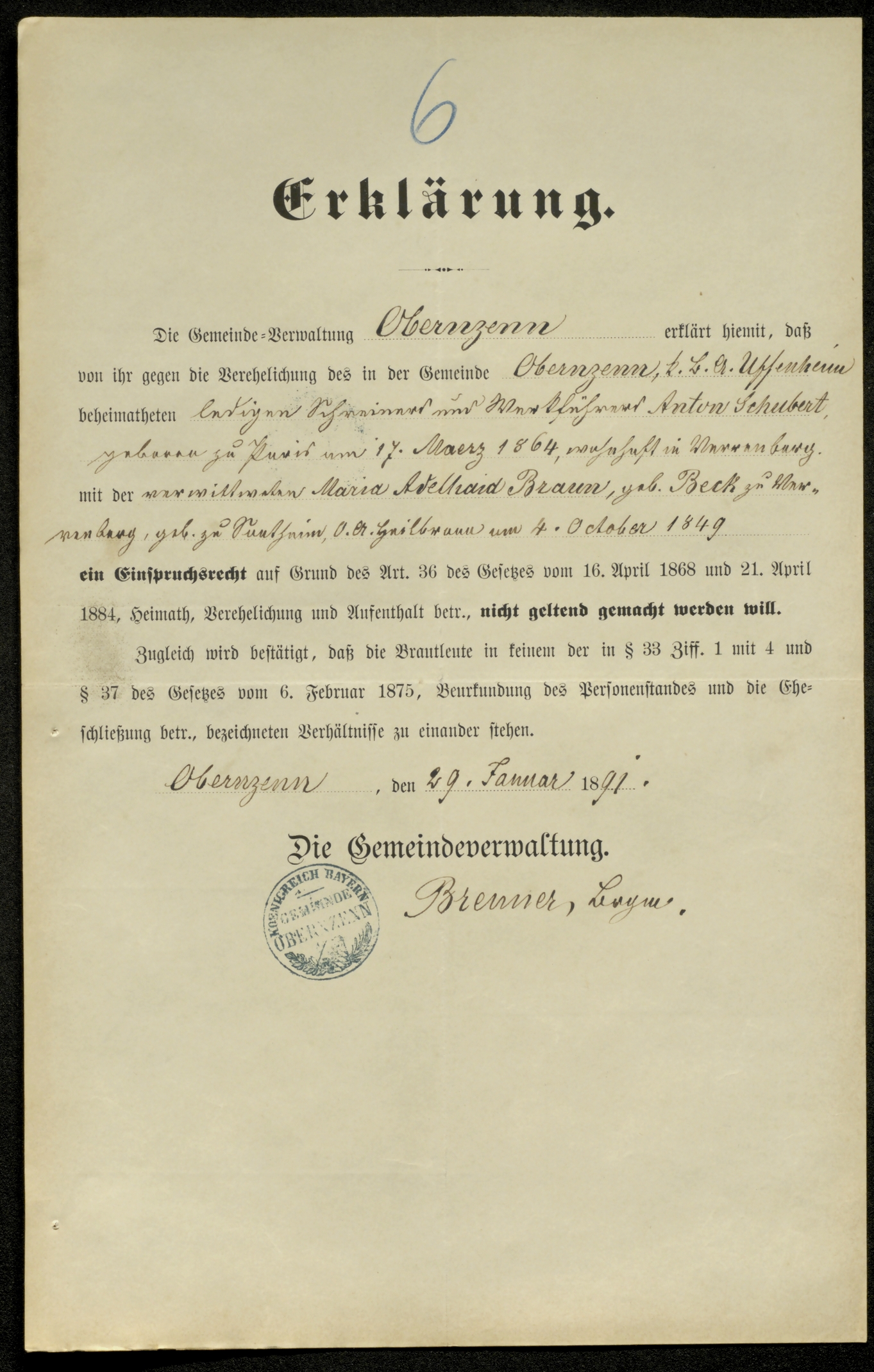 Der ledige Anton Schubert möchte die Witwe Maria Adelheid Braun geb Beck heiraten. Dazu gab es den folgenden Schriftverkehr.