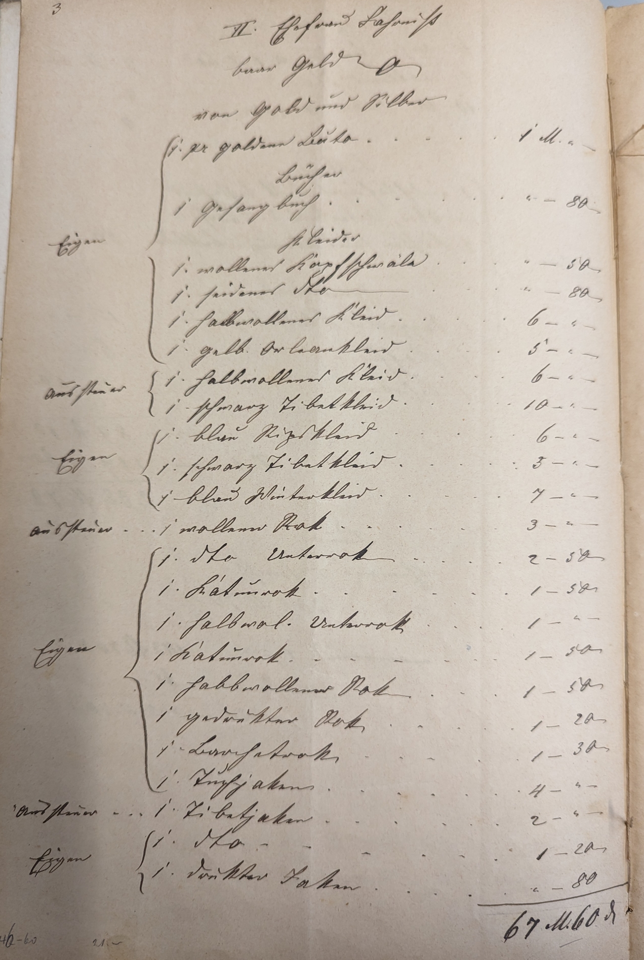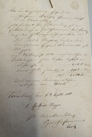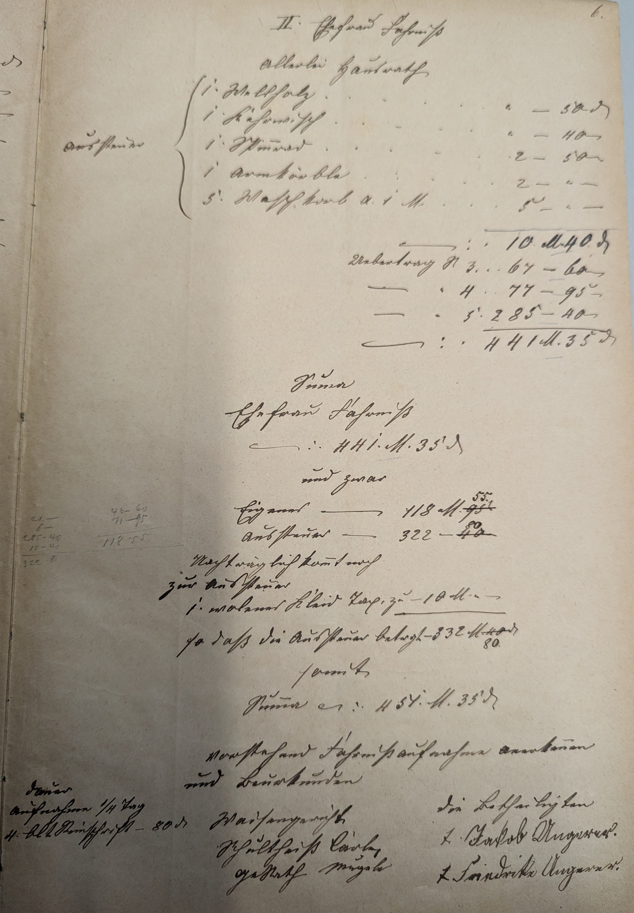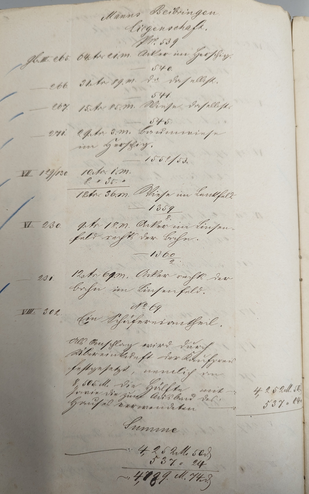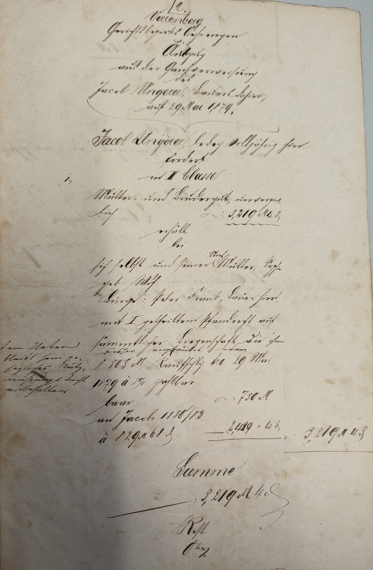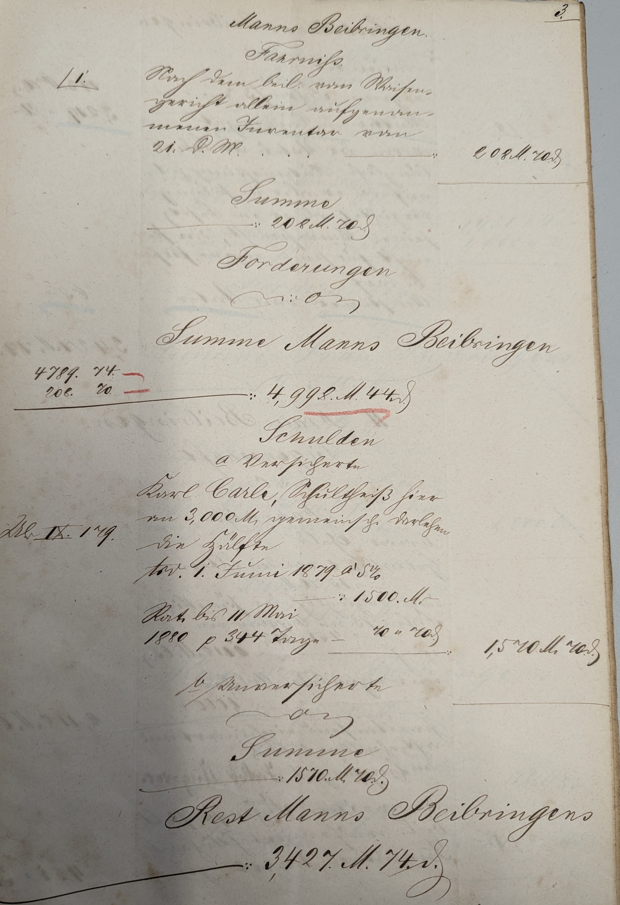 | In dieser Beibringinventur vom 23.08.1880 findet sich das folgende: Manns Beibringen: Liegenschaft: "die unabgetheilte Hälfte an folgeder in Gemeinschaft mit der Stiefmutter Sophie Wolf, Ehefrau des Jacob Ungerer, Bauershier aus der Gantmasse des Vaters erkauften Liegenschaft Geb. No.33 ...." Hinzu kommen Gras- und Baumgarten, Wiesen, Äcker, Weinberge und ein Schäfereianteil. 4.252 M. 50 d. Fahrniß 208 M. 70 d. Forderungen 0 M. Summe Manns Beibringen 4.998 M. 44 d. Schulden: 1.570 M. 70 d. Rest Manns Beibringen 3.427 M. 74 d. Frau Beibringen Liegenschaft 0 M. Fahrniß baar Geld 2.118 M. 65 d. Fahrniß 451 M. 35 d. Forderungen 0 M. Summe Frau Beibringens 2.570 M. "Den Eltern, unverzinsliches Darlehen dessen 1/4jährlige Aufkündigung sie sich vorbehalten 1.000 M." Rest Frau Beibringens 1.570 M. "Uebereinkunft 1. Die Ehefrau wird Miteigenthümerin der vom Mann im ledigen Stande aus der Gantmasse seines Vaters erkauften Liegenschaft wie sie oben Bl... beschrieben ist und es soll dieselbe wie während der Ehe erkauft und zur Erzeugenschaft gehörig betrachtet werden. 2. Der Mann tritt diese Liegenschaft um den Ankaufspreis u. die zum Ausbau des Hauses verwendete Summe, zusammen also für 4.789 M. 74 d. an die Errungenschaftsgesellschaft ab. Die darauf haftende Schuld wird Socialschuld 3. die Contrahenten verzichten auf alle Einrede gegen diese Übereinkunft namentlich die des Irrthums, der Überredung und der Verletzung."
