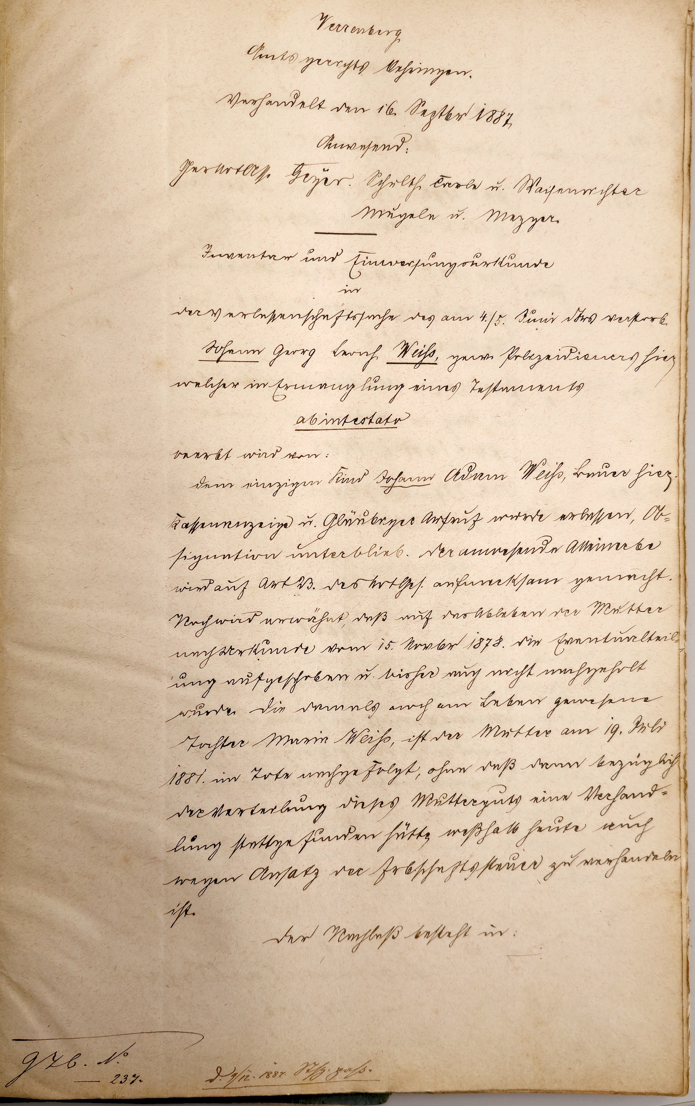 Im Verrenberger Gemeinderatsprotokoll vom 12.August 1850 liest sich das so: Wirdt der Pfleger Johann Weiß vor das Kindt des Leonhard Gerbig von dem Weisen Gericht und Gemeinderath Bestädigt, und wirdt heute sogleich nach der Vorschrift verpflichtet |