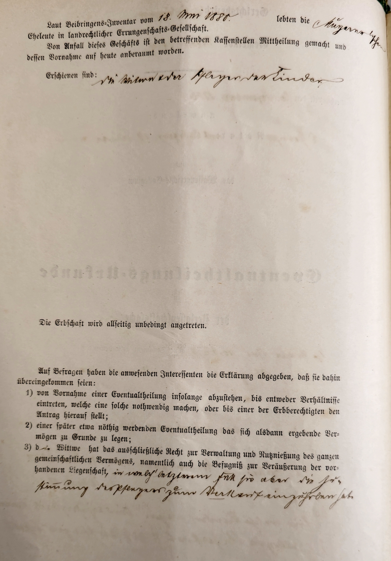 | In dieser Beibringinventur der Christian Bort Eheleute vom 10.04.1872 findet sich das folgende: Manns Beibringen: Liegenschaft: Äcker und die Hofstelle Nr.6 1050 M Fahrniß baar Geld 50 fl. Gold u Silber 0 fl. Bücher: Gesangbuch 30 x. Kleider 30 fl. 12. x. Bettgewand 15 fl. Leinwand 2 fl. 30 x. Küchengeschirr 0 fl. Schreinwerk 2 fl. 30 x. Allerlei Hausrath 6 fl. Feld-Handgeschirr 1 fl. 30 x. Forderungen 359 fl. 5 x.  Summe 359 fl. 5x. = 615 M 57 d. Summe der ganzen Mannsbeibringens 1.035 fl. 53 x. Weibs Beibringen Liegenschaft: Fahrniß baar Geld 0 fl. Gold u Silber 0 fl. Bücher: Gesangbuch 24 x. Weibkleider: 54 fl. 24 x. Bettgewand 46 fl. Leinwand 2fl. 24 x. Schreinwerk 13 fl. 38 x. Summe 116 fl. 26 x. = 203 M 2 d. Forderungen 200 fl. 342 M 85 d. Weibs beibringen 316 fl. 26 x. Beiderseitiges beibringen der Eheleute 1.352 fl. 19x.