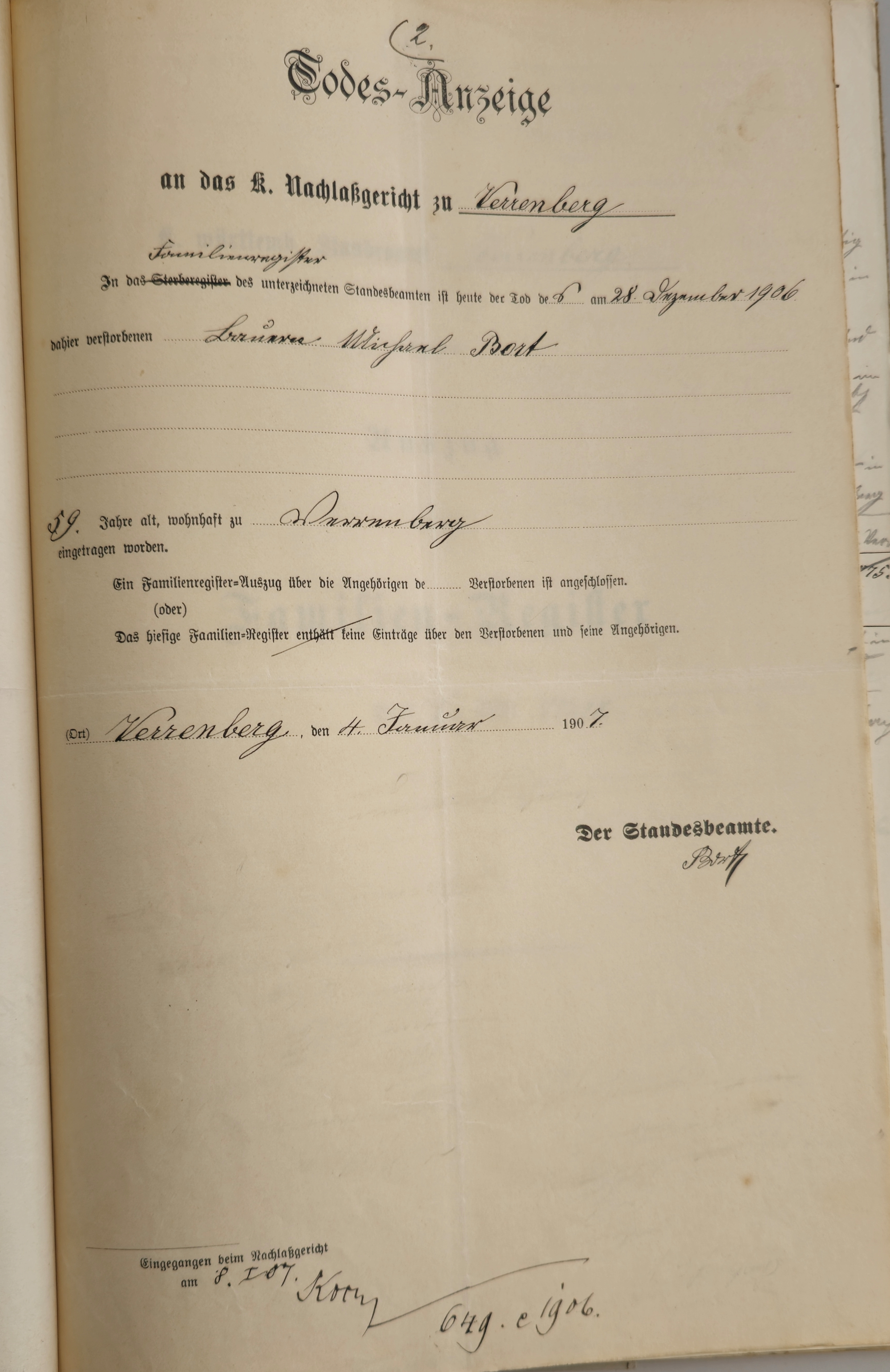 | Nachlassakten Johann Michael Peter Bort, 1906-1907 | ||||||||||||||||||||