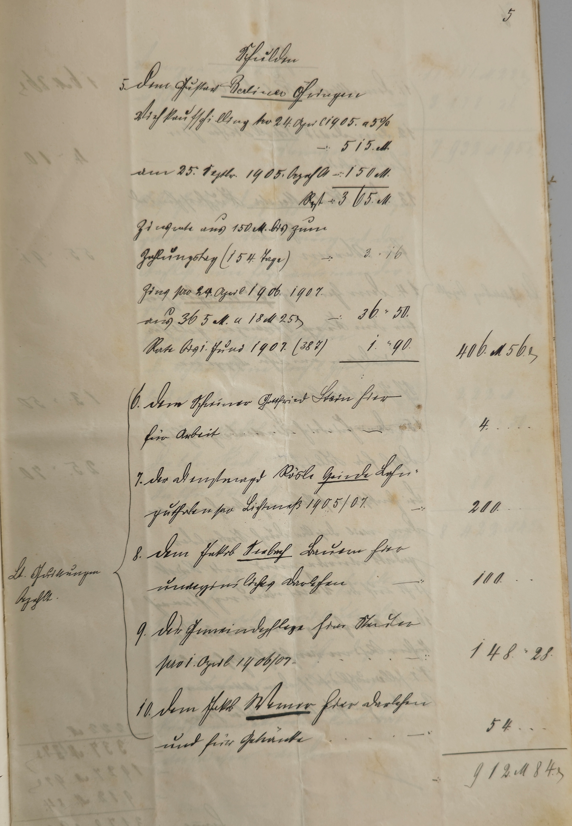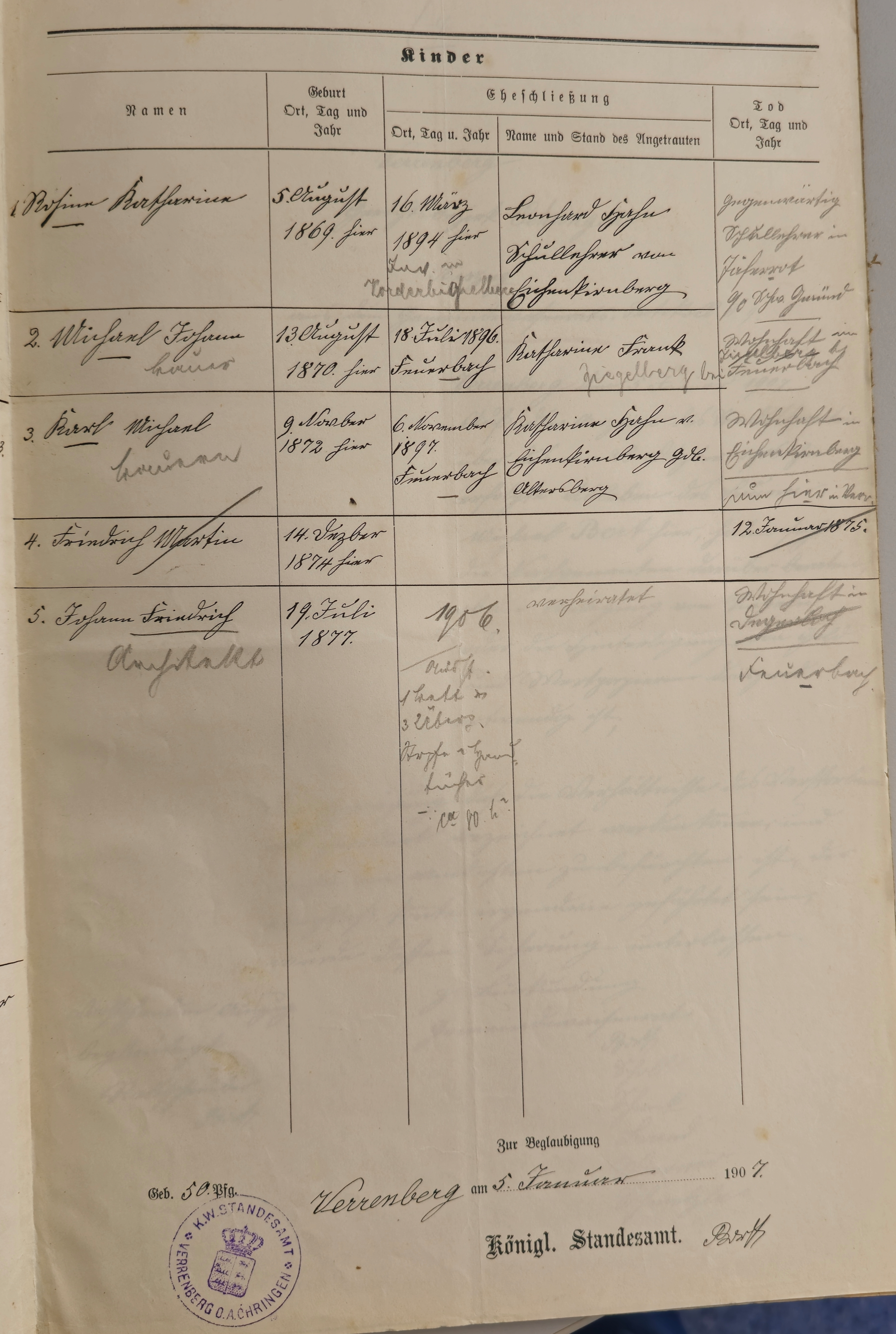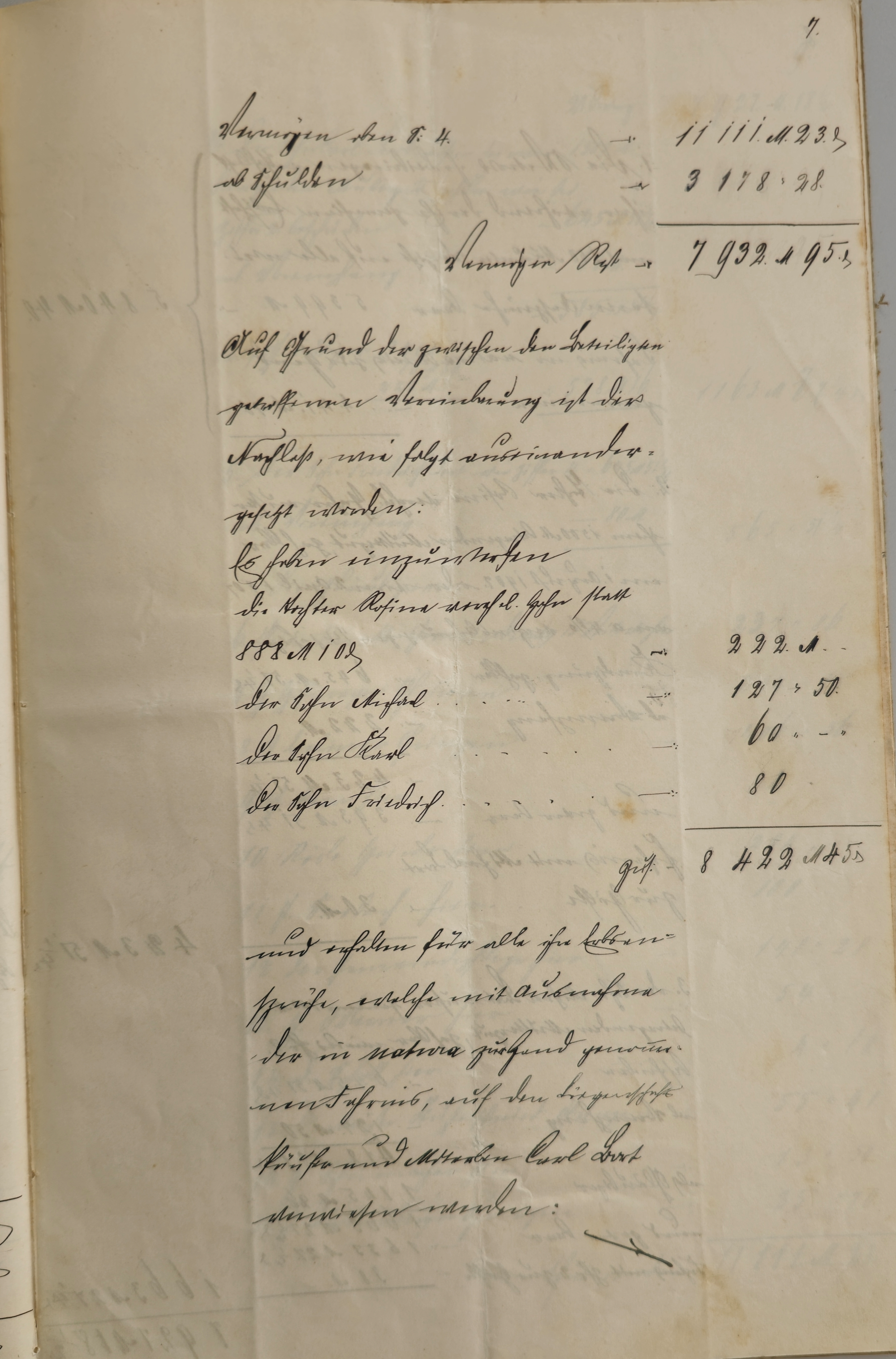 In diesen Nachlassakten vom 28.12.1906 - 06.07.1907 findet sich das folgende: Die gesetzlichen Erben sind: 1. Die Witwe Christiane geb. Steinbrenner ... Kinder aus der getrennten Ehe sind nicht am Leben, dagegen aus der I.Ehe des Verstorbenen mit Katharina Weippert 2. Rosine geb. Bort, Ehefrau des Leonhard Hahn Schullehrer 3. Michael Bort Bauer in Feuerbach 4. Karl Bort Bauer in Verrenberg und 5. Friedrich Bort Architekt in Degerbach Liegenschaft. welche von den unter Ziffer 1-5 aufgeführten Erben nebst dem gesamten Zubehör und Inventar § 91 u. 98 Lit. G. B. [Grundbuch] und aller Haushaltungsfahrniß, soweit letztere nicht Eigentum der Witwe ist und mit Ausnahme 1 Kiste mit u. 1 doppelte Bettst. [Bettstatt], bestehend aus Ober- Unterbett, Pfühl und 2 Kissen, am 27.04.1907 an den Miterben Carl Michael Bort verkauft und aufgelassen worden ist um — — 31 000 Mk. a. Die Hypothek des Sparvereins Kasse Östringen Z. v. d. G. bis 1. Oktbr. 1906. a 4 1/2 % 15000 M. Rata bis 2 April 1907 auf 153 Tage ... 259 M 37 (Summe:) 15 259 M 37 b. Sicherungshypothek der Miterbin Rosine- ... .... ... 1500 M. von 2 April 1907. a 4% Zinsen Zins an den Schwag. Carl Bort dessglich: 1500 M. " " Friedrich " " 1500 M. " " Richard " " 700 M. (Summe:) 5200 M. (Zwischensumme rechts:) 20 459 M 37 Ab 2 April 1907 hat der Käufer die Zinsen selbst zu vertreten (verrechnet auf d. Kaufschilling d. gegenwärtigen Verkaufs) (Rechts:) 10 540 M 63 (Einfügung: Abtragend aus d. Kaufsch. vom 1. Aug 1907 laut Quittung erfolgt) An v. g. restlich vom 2 April 1907 mit 4% und zahlbar gegen ½ jährige Kündigung Rata bis 1 Juni 1907 auf 60 Tage ... 69 M 80 Fahrniß Diese besteht in den Beilegungen der Witwe und ist stammvatergemäß hier sämmtlich aufzunehmen mit dem eingeschriebenen Wert von ... 441 M 40 ferner 1. Kasten und ein vollständiges Bett (vergl. oben S. 2) im Wert von ... 60 M. Es werden noch offene Forderungen aufgelistet in Höhe von insgesamt 1.927 M. 97 d.. Ebenso die offenen Schulden in Höhe von 3.178 M. 28 d. Vermögen Rest 7.932 M 95 fl. Es haben anzutreten: