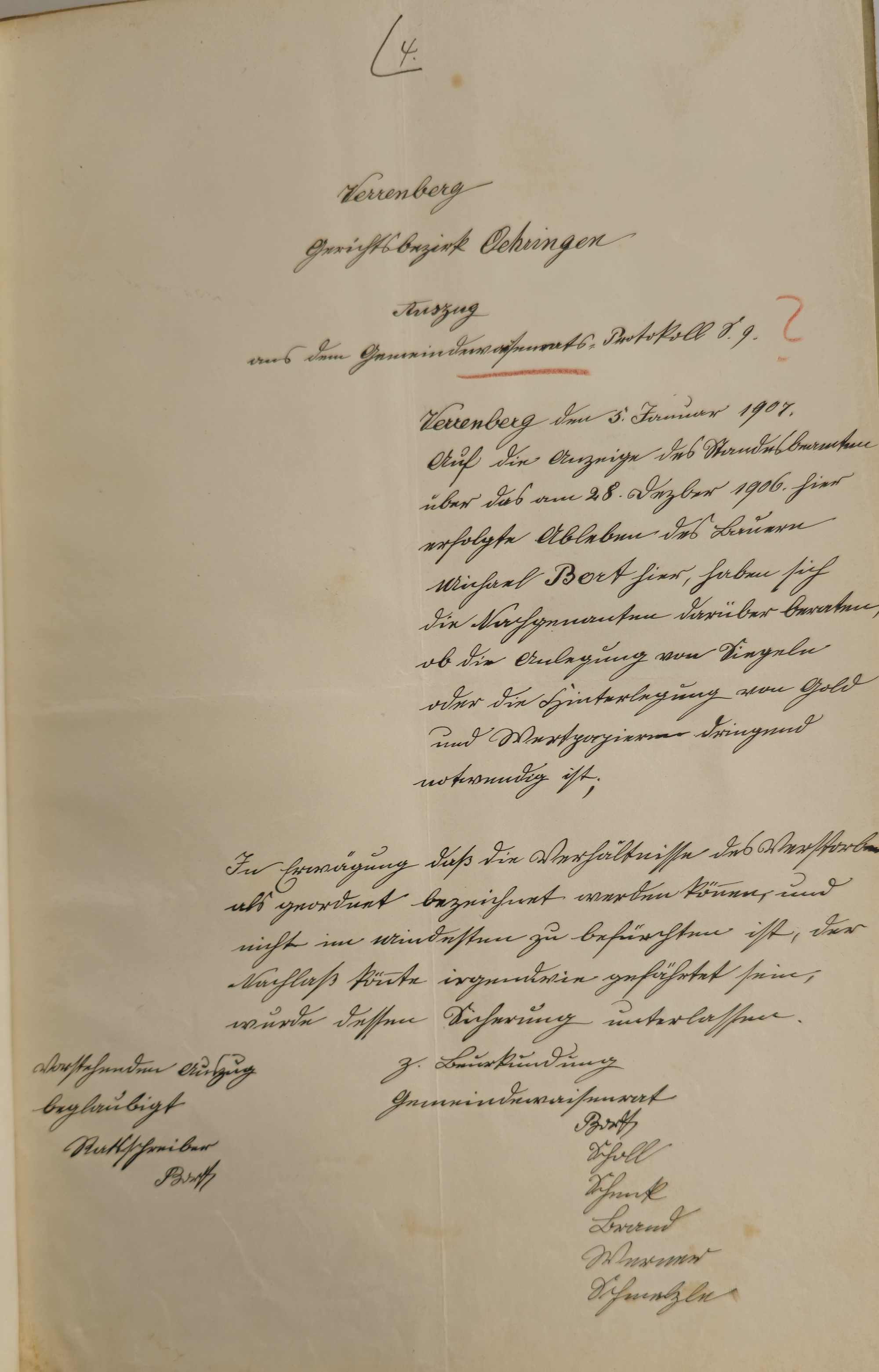 Im Verrenberger Gemeinderatsprotokoll vom 24.Mai 1877 findet sich folgendes: Verhandelt vom 24.Mai bis 16. Oktober 1877 Streitsache des Christian Scheuerman von Bitzfeld Kl. Gegen Michael Bort jun. hier Bekl. Schadensersatz weggetragener Erde betreffend. Nachdem am 29.Mai 1877 durch GeRäthl. Augenschein erhoben wurde, daß zunächst die fehlenden Grenzsteine zu ersetzen sind, wurden am heutigen den 16.Okt. diesel. durch den Hl. Oberamts Geometer und hies. Untergang ergänzt und hernach der Streitfall zu einem Vergleich gebracht. Beilage No.55 |