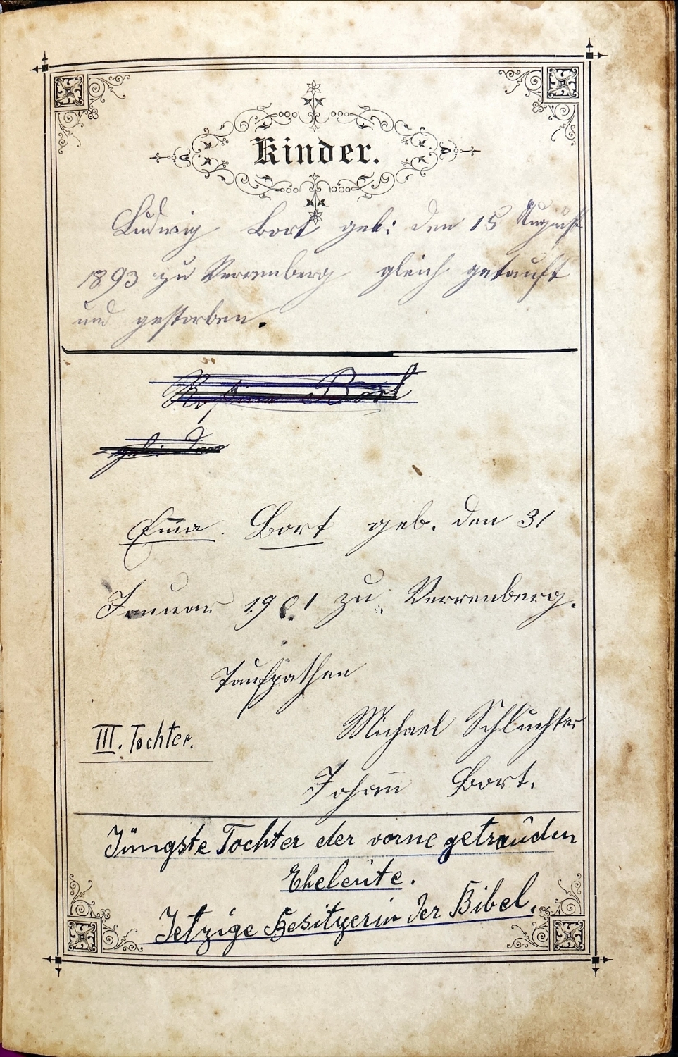 Im Verrenberger Gemeinderatsprotokoll vom 16.August 1893 findet sich folgendes: Dem Ludwig Bort wurde Zeugniß ausgestell 1) Leumund gut 2) Vorstrafen seit seinem hiersein 1889 keine 3) Vermögen ca. 500M. |