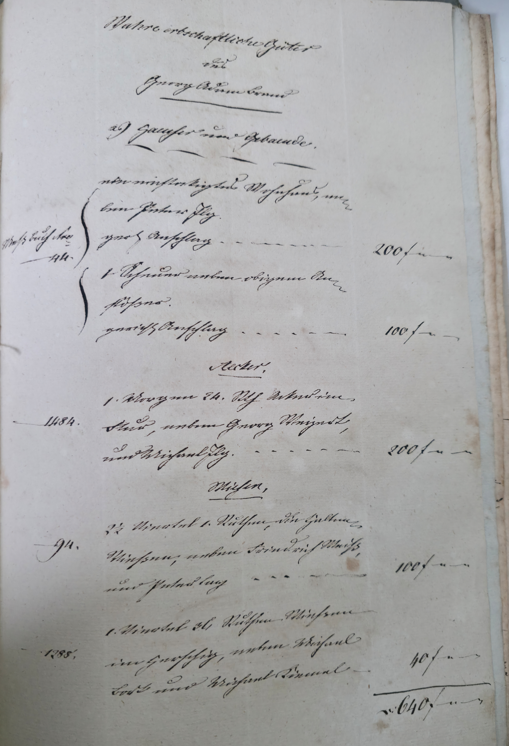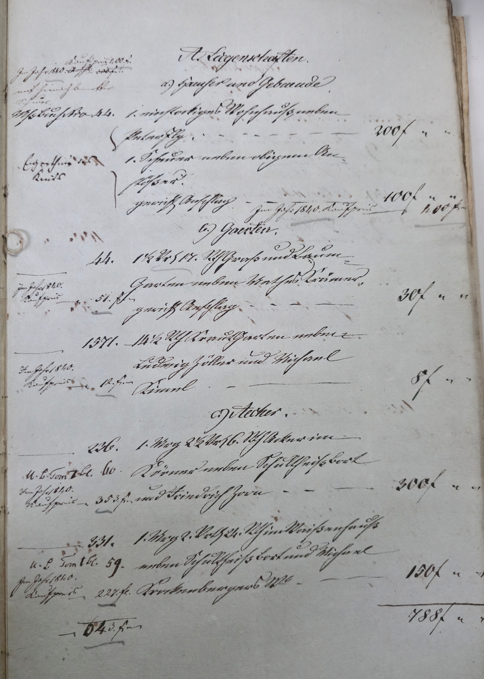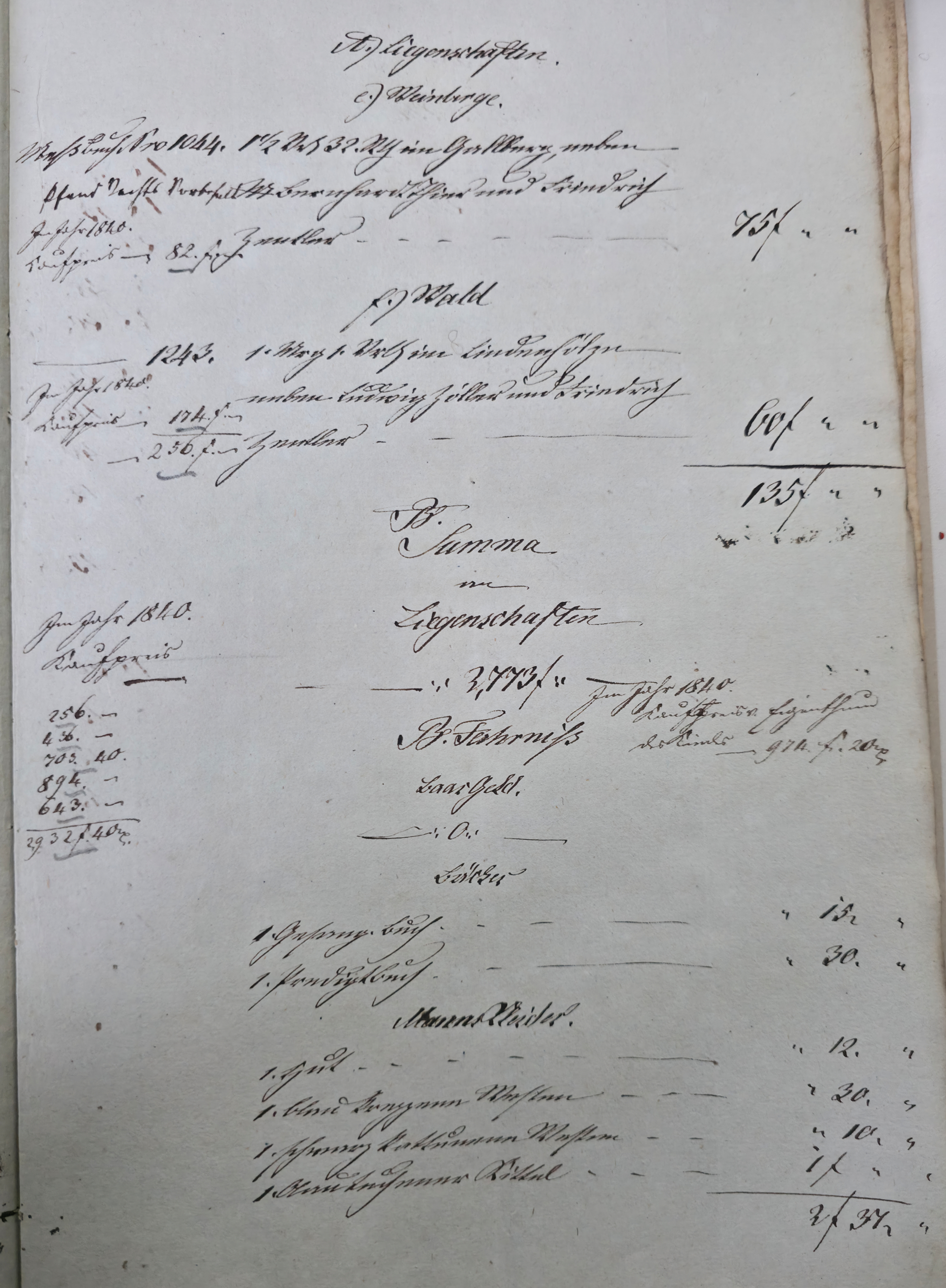 In dieser Eventualteilung vom 28.04.1836 / 02.01.1837 findet sich das folgende: Die gesetzlichen Erben sind: I. Die Wittwe Christina Catharina eine geborene Häffele II. ein mit dem Verstorbenen erzeugtes Kind, Georg Adam 7. Jahre alt Für das minderjährige kind wurde Mathes Kraft als Pfleger verpflichtet. A. Liegenschaften a) Häußer und Gebäude Meßbuch No 44. 1 einstockiges Wohnhauß neben Peter Ilg 200 fl. 1 Scheuer neben obigem Anstößer 100 fl. b) Gärten 38 fl. c) Aecker 1.865 fl. d) Wiesen 110 fl. e) Weinberge 400 fl. f) Wald 60 fl. Summe Liegenschaften 3.773 fl. B. Fahrniß Baar Geld 0 fl. Bücher 1. Gesang buch 15 x. 1. Predigtbuch 30 x. Manns Kleider 13 fl. 12 x. Frauen Kleider 12 fl. 17 x. Bett Gewand 25 fl. Leinwand 12 fl. 54 x. Küchen Geschirr von Messing 1 fl. von Zinn 30 x. von Kupfer 24 x. von Eisen 10 x. von Blech 12 x. von Glas 14 x. von porzellan 6 x. Irdenes Geschirr 15 x. Schreinwerk 5 fl. 4 x. Faß und Bandgeschirr 3 fl. 50 x. Allerlei Hausrath 4 fl. 7 x. Feld und Handgeschirr 4 fl. 19 x. Getränk 0 fl. Vieh 1 Kuh 33 fl. 2 Räupling 30 fl. 1 Gans 30 x. 2 Hühner 18 x. Fahr und Bauren geschirr 1 Wagen samt Zugschirr 25 fl. 1 Pflug u Eggen 3 fl. Früchten 5 Scheffel Dinkel 15 fl. 1 Scheffel Korn 5 fl. 1 1/2 Scheffel Gersten 6 fl. Activa 0 fl. Summe des gemeinschaftlichen Vermögens 2.975 fl. 7 x. Schulden 563 fl. 30 x. Unter Abzug der Schulden besteht das reine Vermögen anhin 2.411 fl. 37 x. Es zeigt sich mithin einen eheliche Errungenschaft von 823 fl. 44 x. Hiervon gebührt jedem Ehegatten die Hälfte mit 411 fl. 52 x. Die Verlassenschaft des Verstorbenen besteht also: a) in einem Beibringen mit 733 fl. 29x. b) in der Hälftigen Errungenschaft mit 411 fl. 52 x. Zusammen in 1.145 fl. 21 x. Hiervon trifft es: I. die Wittwe mit 381 fl. 47 . II. dem Sohn Georg Adam a 2/3 763 fl. 34 x. Es haben also zu fordern: I. die Wittwe a) Beibringen 854 fl. 24 x. b) hälftigen Errungenschaft 411 fl. 52 x. c) Erbs Portion 381 fl. 47 x. II. der Sohn Georg Adam Brand Erbs Portion 763 fl. 3 x. Sämtliche Liegenschaften wurden während der Ehe erworben, und sind gerichtlich angeschlagen zu 2.773 fl. Wovon zunächst der Ehefrau die Hälfte gebührt mit 1.386 fl. 30 x. dann 1/3 an der anderen Hälfte mit 462 fl. 10 x. Der Sohn Georg Adam Brand ad 2/3 an der andern hälfte mit 924 fl. 20 x. Die Erbs Portion desselben trägt aber nur 763 fl. 34 x. Es folgen weitere Aufzählungen