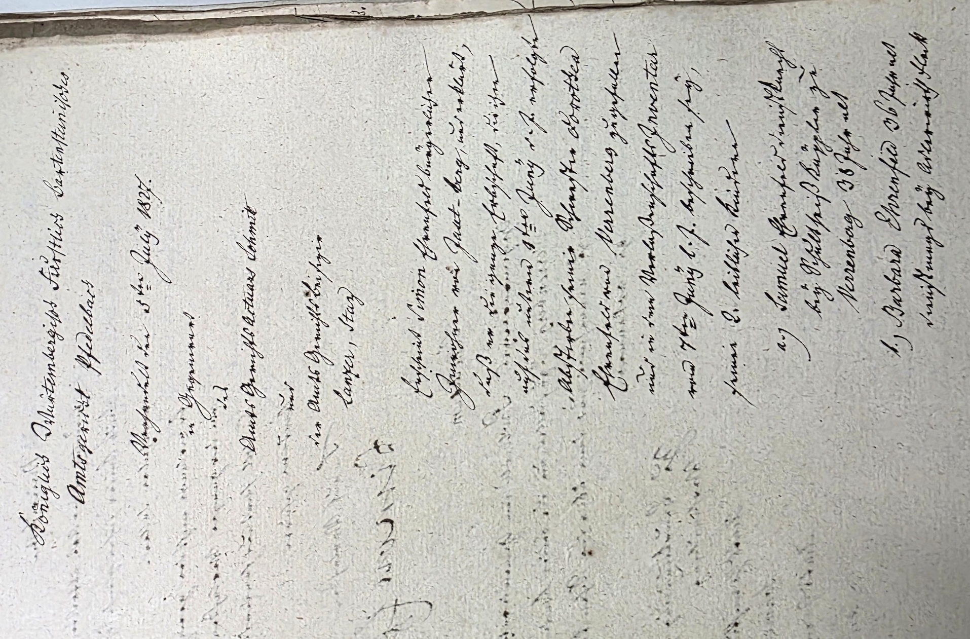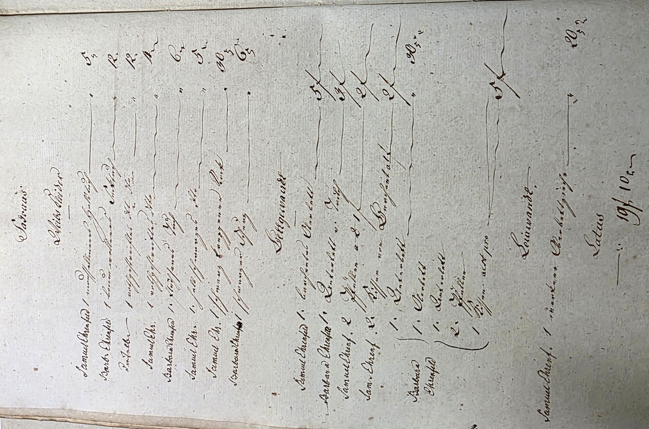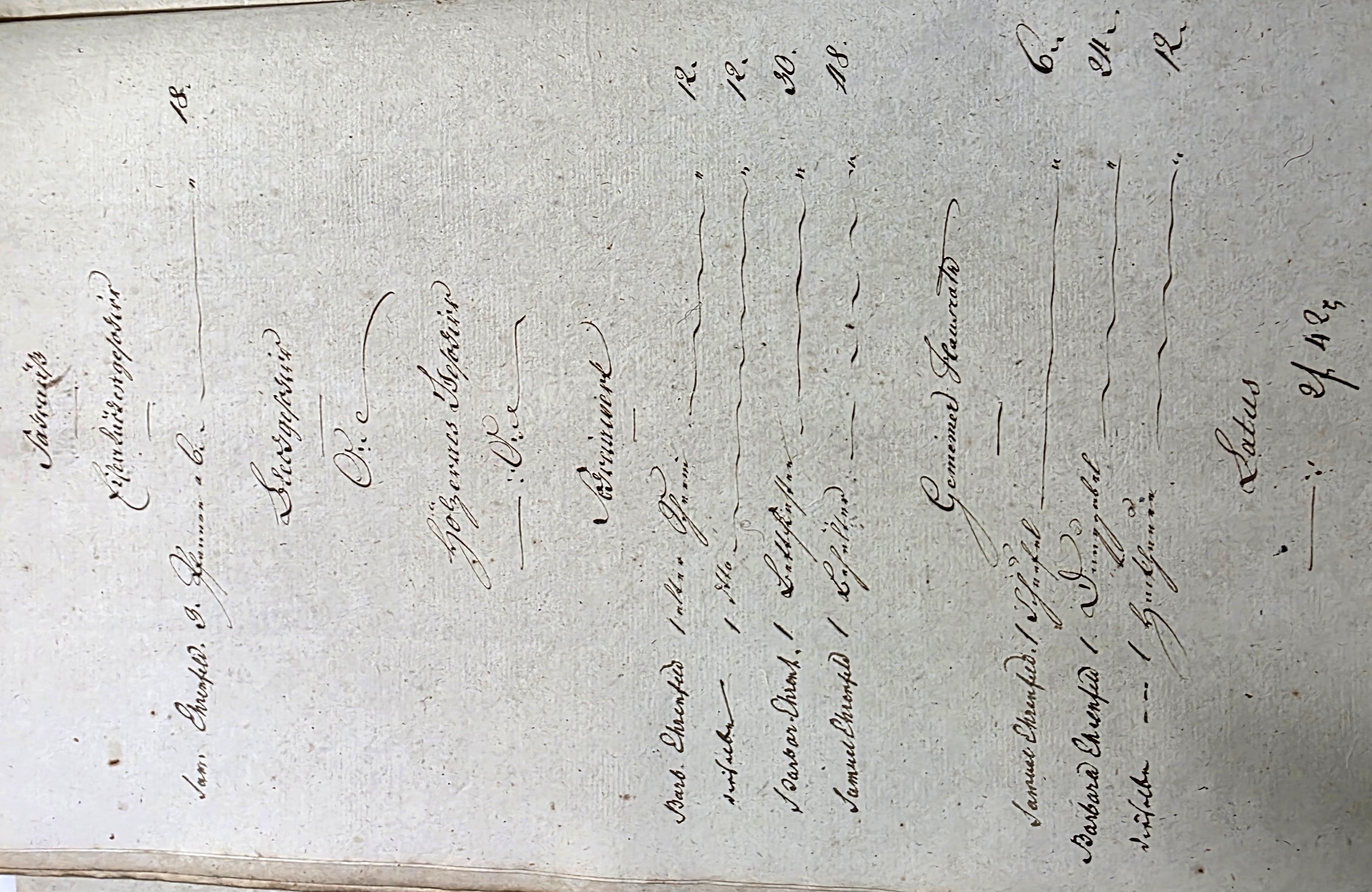 In diesem Verlaßenschafts Inventur und Realteilung vom 07.06.1827 findet sich das folgende: Die gesetzlichen Erben sind: Simon Ehrenfeld Bürgerl. Inwohner zu J....berg, Königlichem Oberamts Gerichts Künzelsau, Bruder der Verstorbenen dessen zwey leibliche Kinder a) Samuel Ehrenfeld Dienstknecht bey Schultheiß Käppler dahier 38 Jahre alt. b) Barbara Ehrenfeld dermalen im Dinsten bey Adlerwirth ... zu Niederstetten Oberamts Gerabronn, 36 Jahre alt. Erklären aber daß ihr Vater ihnen diese Verlassenschaft abgetretten haben und daß sie ohne Verzug deßfals eine .... Urkunde beibringen würden. Der Nachlass von Maria Dorothea Ehrenfeld bestand u.a. aus: A Liegenschaften 1) Häuser und Gebäude 1 kleines einstöckiges baufälliges Häuslein 35 fl. [Haus 10a] Nachtrag links: zur Hälfte Friedrich Samuel Ehrenfeld zur Hälfte Barbara Ehrenfeld B. Fahris baares Geld 205 fl. 49 x. Bücher - Bibel 24 x. - Predigtbuch 24 x. - Predigtbuch 24 x. - Württemb. Gesangbuch 15 x. - 10 alte Bücher 20 x. Weibs Kleider 1 fl. 32 x. Bettgewandt 17 fl. 30 x. Leinwandt 6 fl. 03 x. Mößinggeschirr 40 x. Kupfer Geschirr 1 fl. Zurgeschirr 1 fl. 18 x. Eisenbäckergeschirr 18 x. Schreinwerk 1 fl. 42 x. Gemeiner Hausrat 42 x. Summe Fahrniß 238 fl. 21 x. Activis 109 fl. 59 x. Schulden 14 fl. 16 x. Rest des Vermögens 369 fl. 4 x. "Nachdem unterm 5ten July d.J. einfür ... Schenkungs Urkunde beigebracht wurde, nach dieser aber Barbara Ehrenfeld - Fünfzig Gulden voraus als Entschädigung für Unterstützung ihrer Mutter in ihrer langwierigen Krankheit erhalten soll; So erhalten von der Verlaßenschaft 369 fl. 4 x. 1. Samuel Ehrenfeld 159 fl. 32 x. 2. Barbara Ehrenfeld 159 fl. 32 x. und 50 fl."