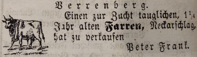 Im Verrenberger Gemeinderatsprotokoll vom 18.Januar 1850 findet sich folgendes: vor versammelten GemeindeRath. Johann Peter Frank v Pfedelbach geb. 13.Septr 1812 bittet um Aufnahme in das hiesige Bürgerrecht Behufs seiner Verheirathung mit Rosina geb. Benz. Durch Geburtsbrief vom 17. Jan 1850 weißt sich der Bewerber nicht nur über ein gutes Prädicat sondern über auch ein Vermögen von 400f. aus. Neben dem .... seiner Braut vermög vorliegenden Heirathsvertrag an einem Gutskauf 300f. als Heirathgut ab. Es sind somit die Bedinungen vorhanden welche Art. 20 seite 6. des revidirten Bürgerrechtsgesezes einen Rechts... zur Bürgerlichen Annahme gewähren und es ist bekannt, daß der BürgerRechtsbewerber ein sparsamer Mann ist. Beschluß den Johann Peter Frank in das hiesige Bürgerrecht aufzunehmen und anzusezen