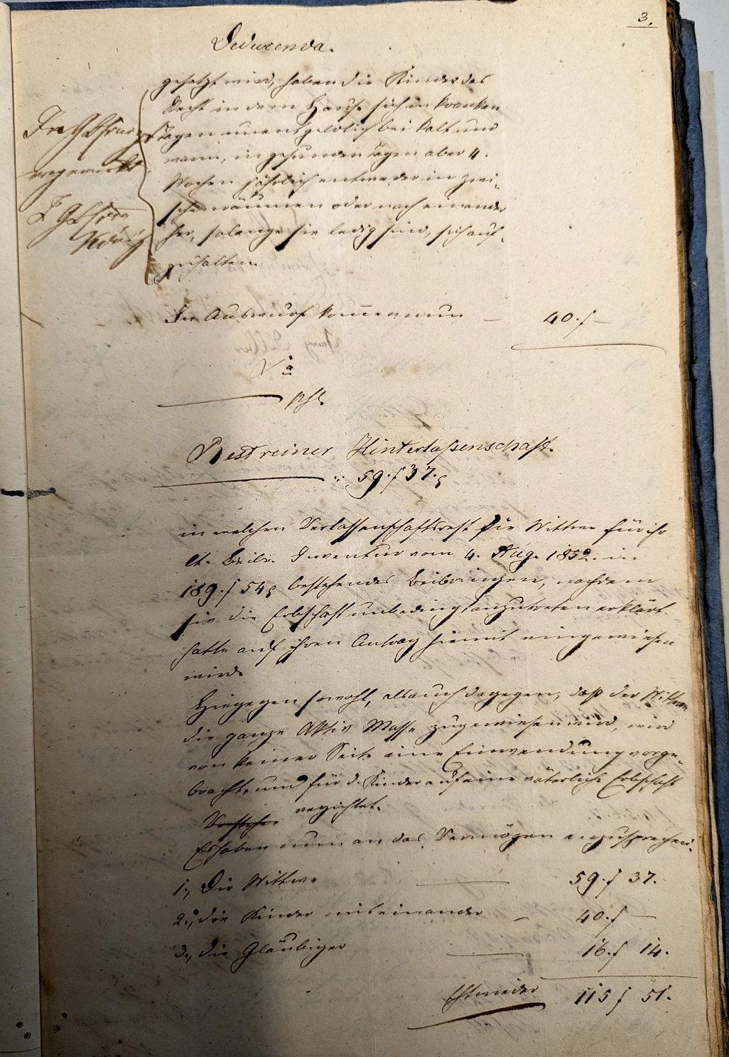 In dieser Realteilung vom 23.04.1856 findet sich das folgende: Die Erben sind: - 1. die Witwe Catharine geb. Hübner - 2. Friederika, ledig vollj. in Weißlensburg im Dienst - 3. Anna Dorothea geb. am 30. Merz 1832 - 4. Andreas geb. am 14. April 1836 - 5. Johann geb. am 22 Juli 1837 für die letzten drei Kinder wurde am 04.08.1842 Georg Dölber als Pfleger eingesetzt. (1) Es fällt auf, dass die hier angegebenen Geburtstage der Kinder von den Angaben im kirchl. Familienregister abweichen!! Laut dem Geburtsregister stimmen die Angaben im Familienregister. Liegenschaft: ein Wohnhaus 65 fl. ein Krautgarten 6 fl. Fahrniß: baar Geld -- Der Wert der gesamten Fahrniß beträgt 44 fl. 51 x Summe ganzes Activ Vermögen 115 fl. 51 x Passiva 99 fl. 31 x Es folgt einiges zum Muttergut der Kinder aus 1.Ehe.