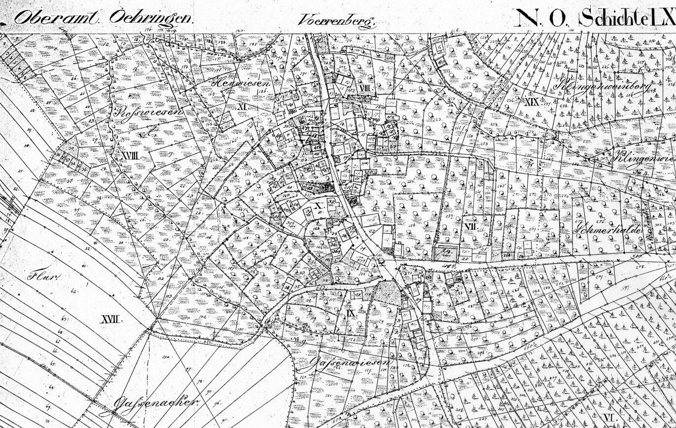 Im Verrenberger Gemeinderatsprotokoll vom 10.August 1870 liest sich das so: In folge der zwischen der Gemeinde Oehringen und der Gemeinde Verrenberg zu Stande gekommenen Markungsausgleichung hat die erstere Gemeinde von den Staatssteuerfreien Parz.No 1129, 1128, 1127, 1126, 1143 und dem Viznalweg No.4 der Markung Verrenberg eine Fläche erhalten, aus welcher nach der angestellten Berechnung pro 1869/70 eine Gemeinde und Amtsschadens Umlage von 52x berechnet wurde, so daß bei 20jährigen Durchschnitt die Summe von 17f. 20x erscheint, welche von der hies. Gemeinde als Entschädigung angesprochen wird. Es wird nun Beschlossen Diese Entschädigung von 17f. 20x gegen die Gemeinde Oehringen geltend zu machen und hiezu höhern Genehmigung einzuholen |