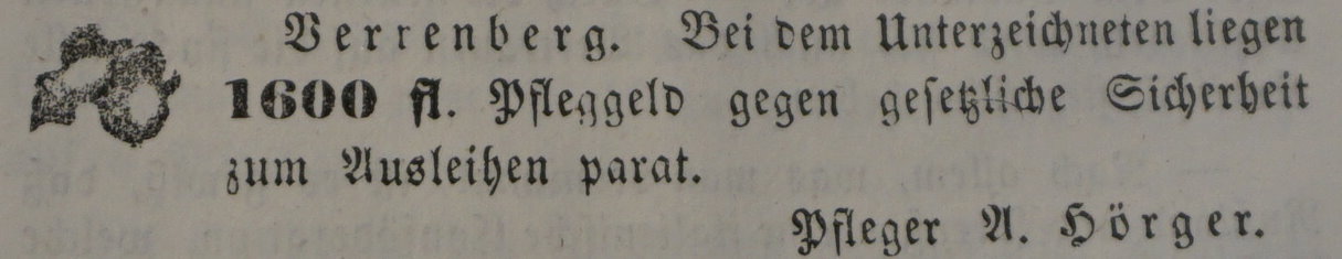 | Johann Jacob Anton Hörger verleiht in seiner Eigenschaft als Pfleger 8-900fl. - 1859 |