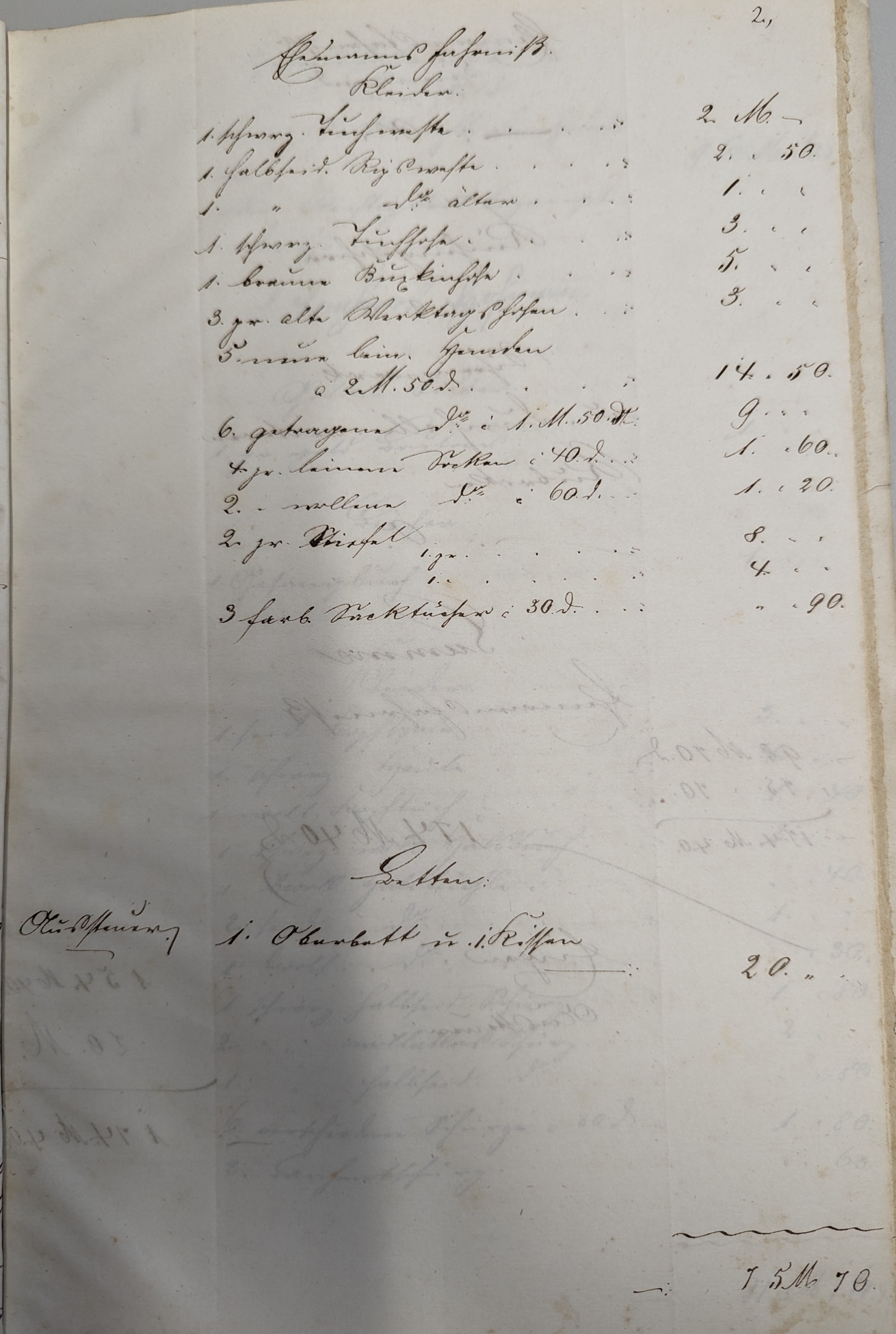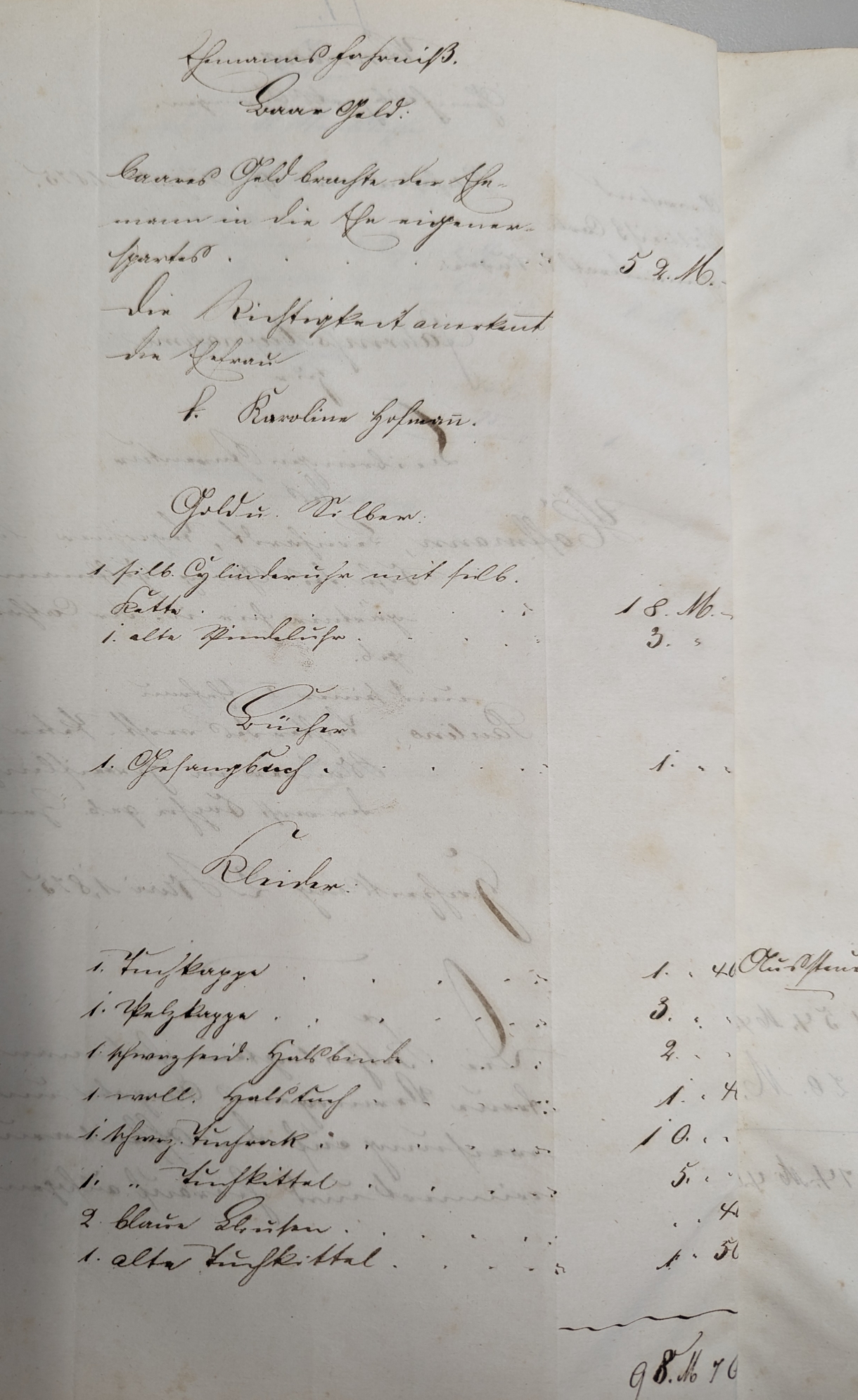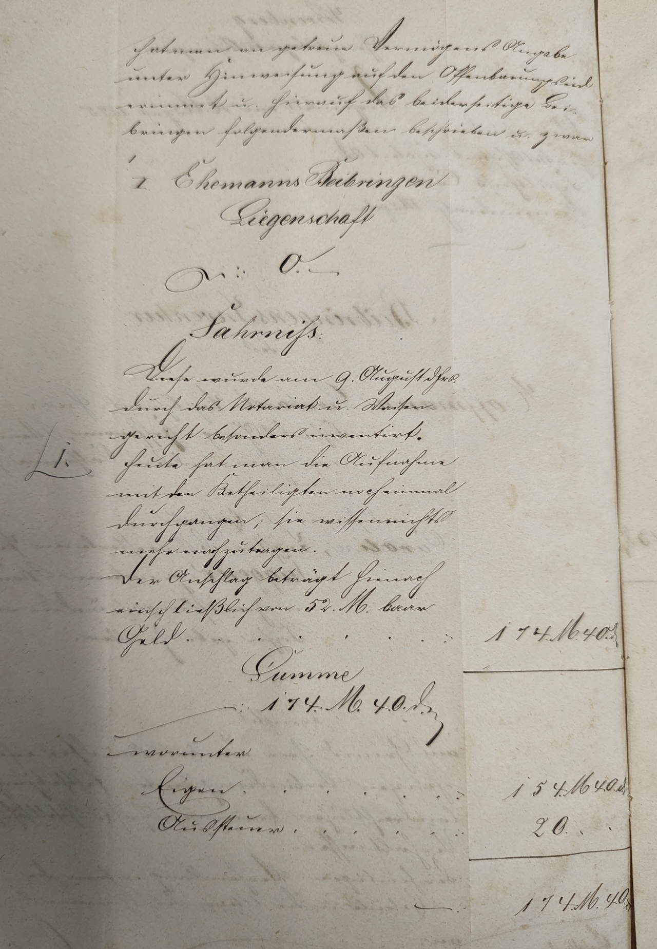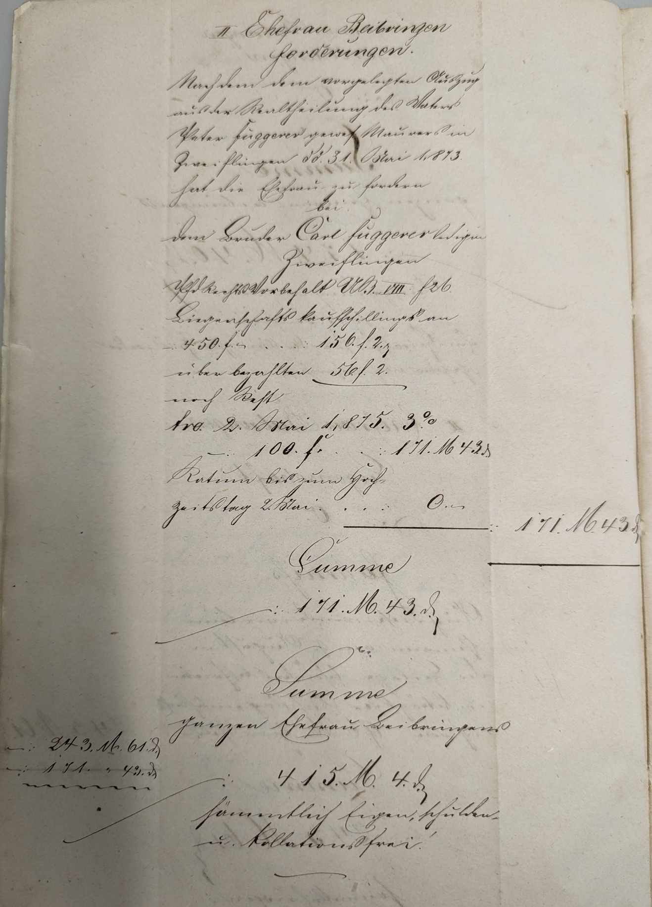In dieser Beibringinventur vom 16.08.1875 findet sich das folgende: Ehemanns Beibringen Liegenschaft 0 fl. Fahnriß 174 M. 40 d. Forderungen 0 fl. ganze Ehemanns Beibringen 174 M. 40 d. Ehefrau Beibringen Liegenschaft 0 fl. Fahrniß 243 M. 61 d. Forderungen 171 M. 43 d. ganze Ehefrau Beibringens 415 M. 4d. beiderseitigen Beibringens 589 M 44 d.