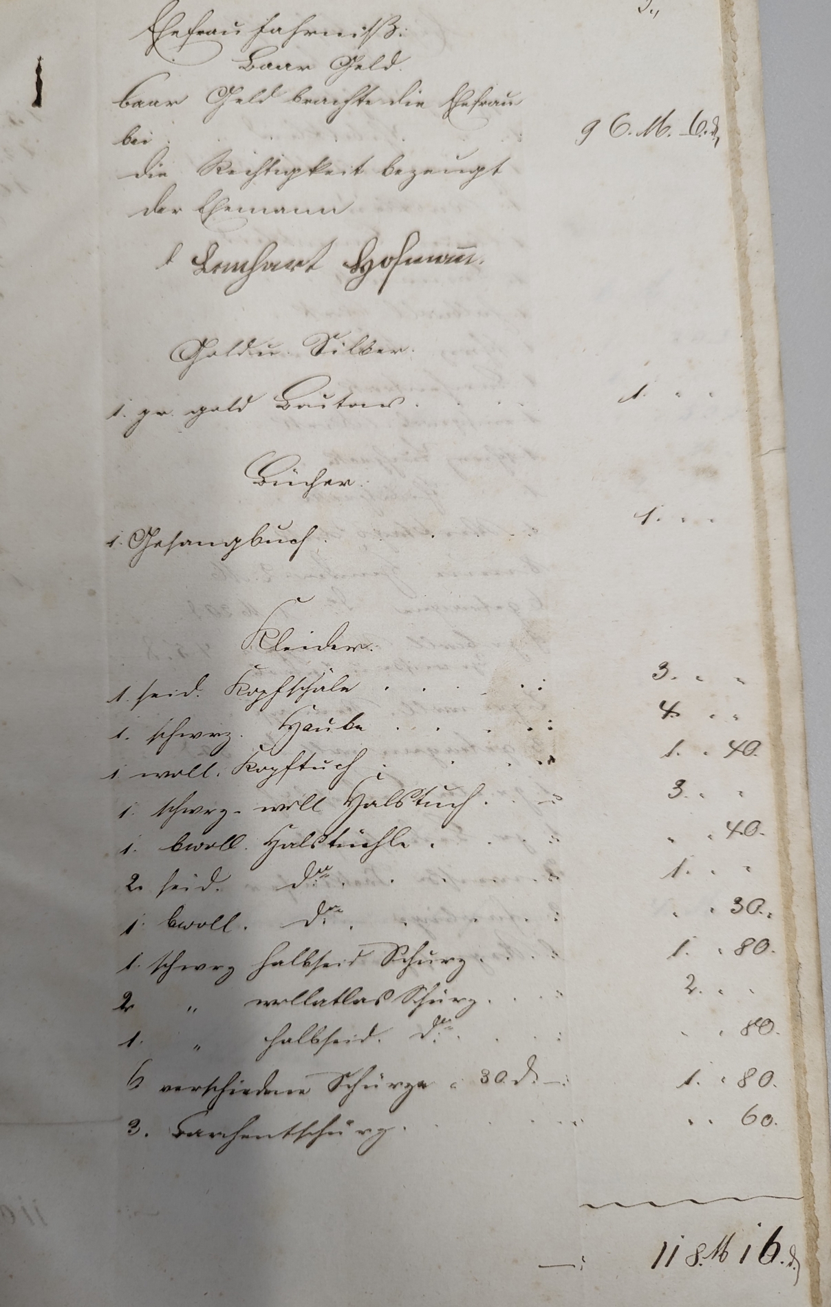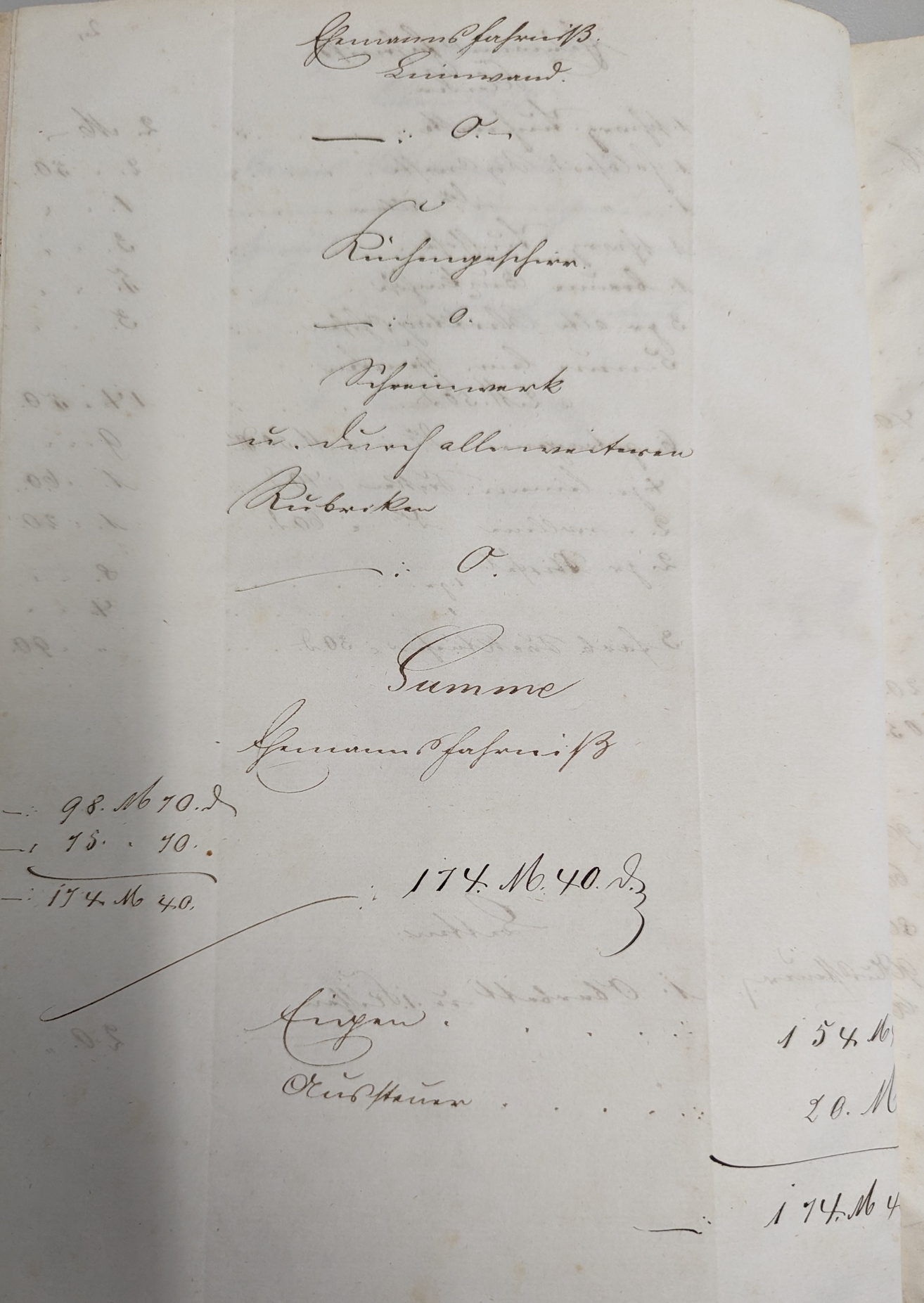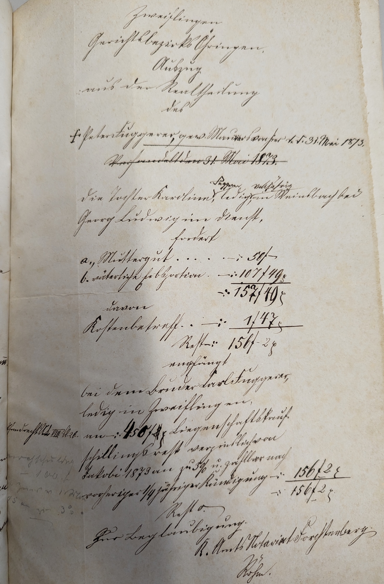 In dieser Beibringinventur vom 16.08.1875 findet sich das folgende: Ehemanns Beibringen Liegenschaft 0 fl. Fahnriß 174 M. 40 d. Forderungen 0 fl. ganze Ehemanns Beibringen 174 M. 40 d. Ehefrau Beibringen Liegenschaft 0 fl. Fahrniß 243 M. 61 d. Forderungen 171 M. 43 d. ganze Ehefrau Beibringens 415 M. 4d. beiderseitigen Beibringens 589 M 44 d.