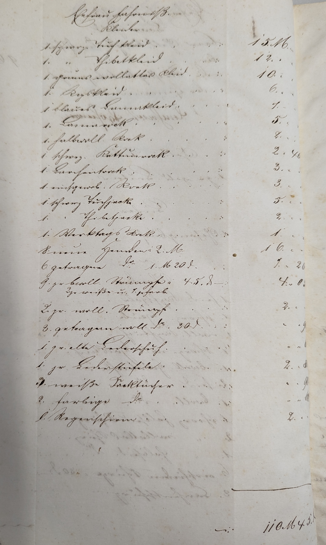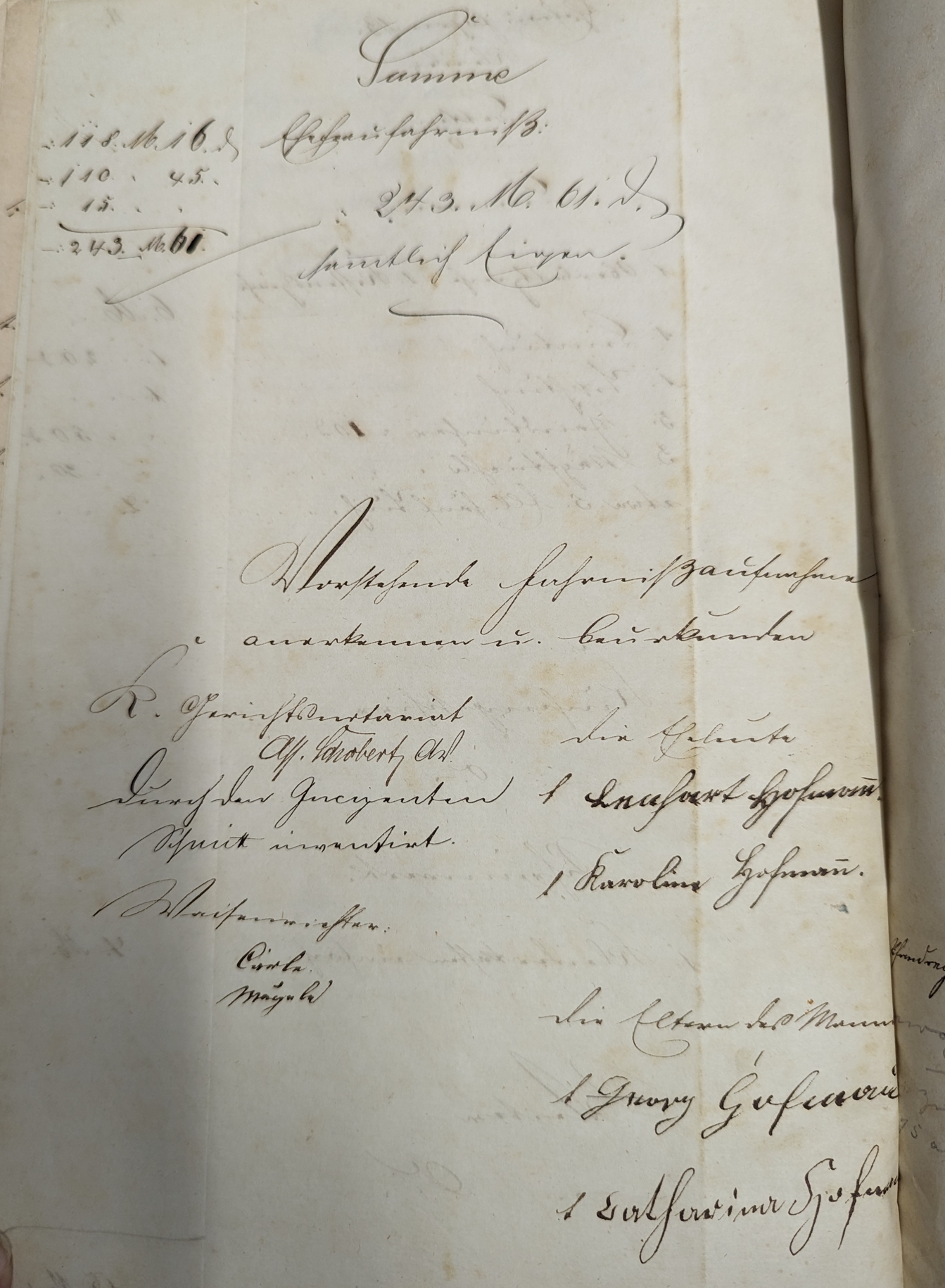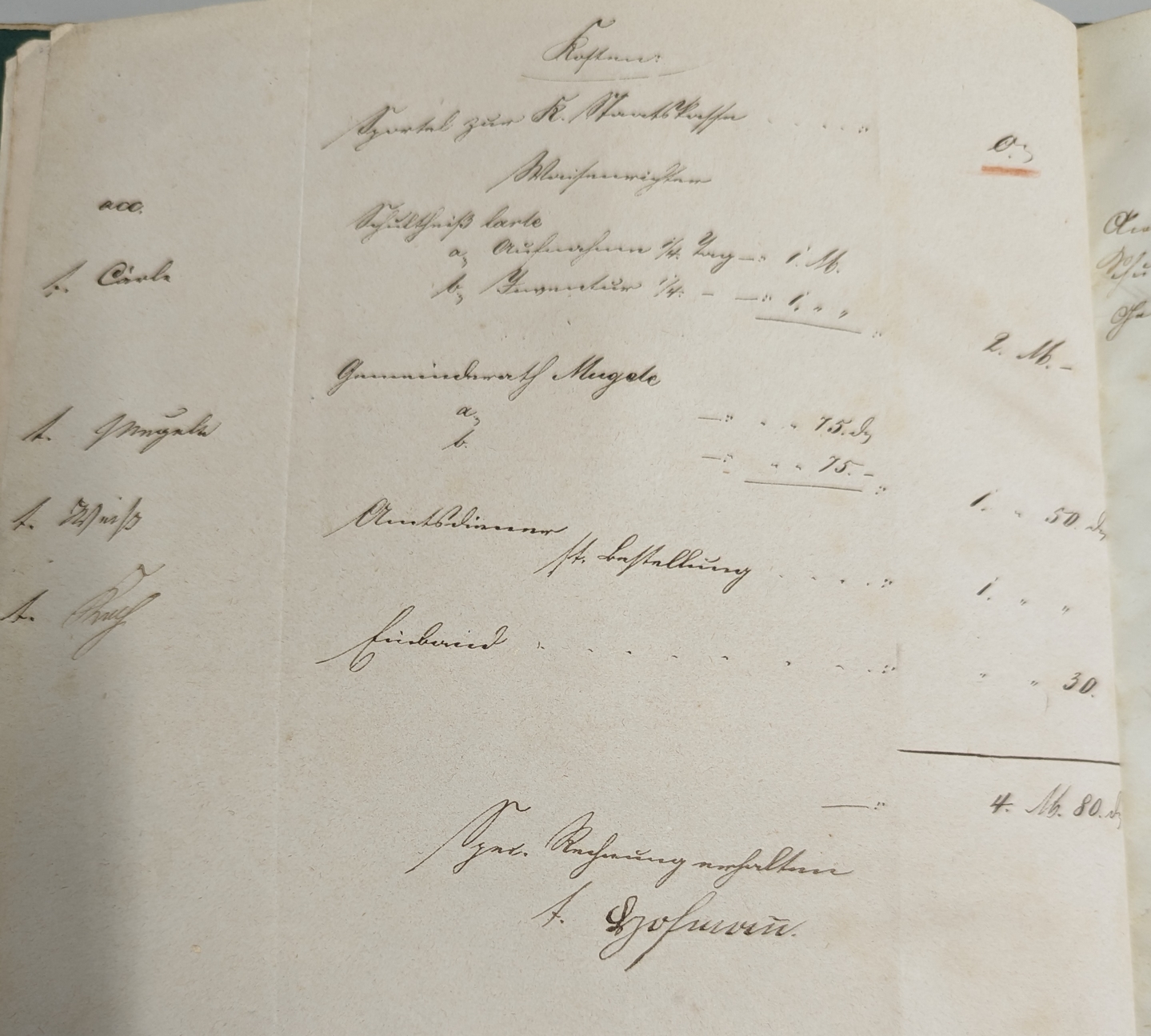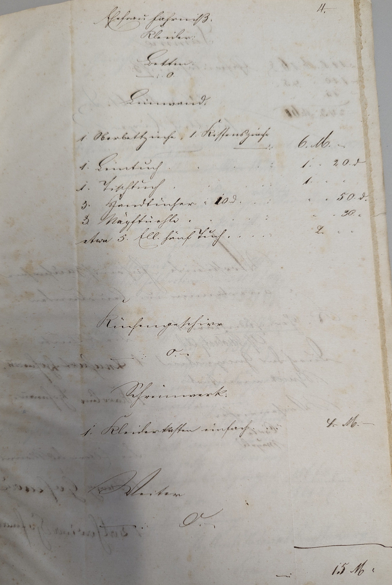 In dieser Beibringinventur vom 16.08.1875 findet sich das folgende: Ehemanns Beibringen Liegenschaft 0 fl. Fahnriß 174 M. 40 d. Forderungen 0 fl. ganze Ehemanns Beibringen 174 M. 40 d. Ehefrau Beibringen Liegenschaft 0 fl. Fahrniß 243 M. 61 d. Forderungen 171 M. 43 d. ganze Ehefrau Beibringens 415 M. 4d. beiderseitigen Beibringens 589 M 44 d.