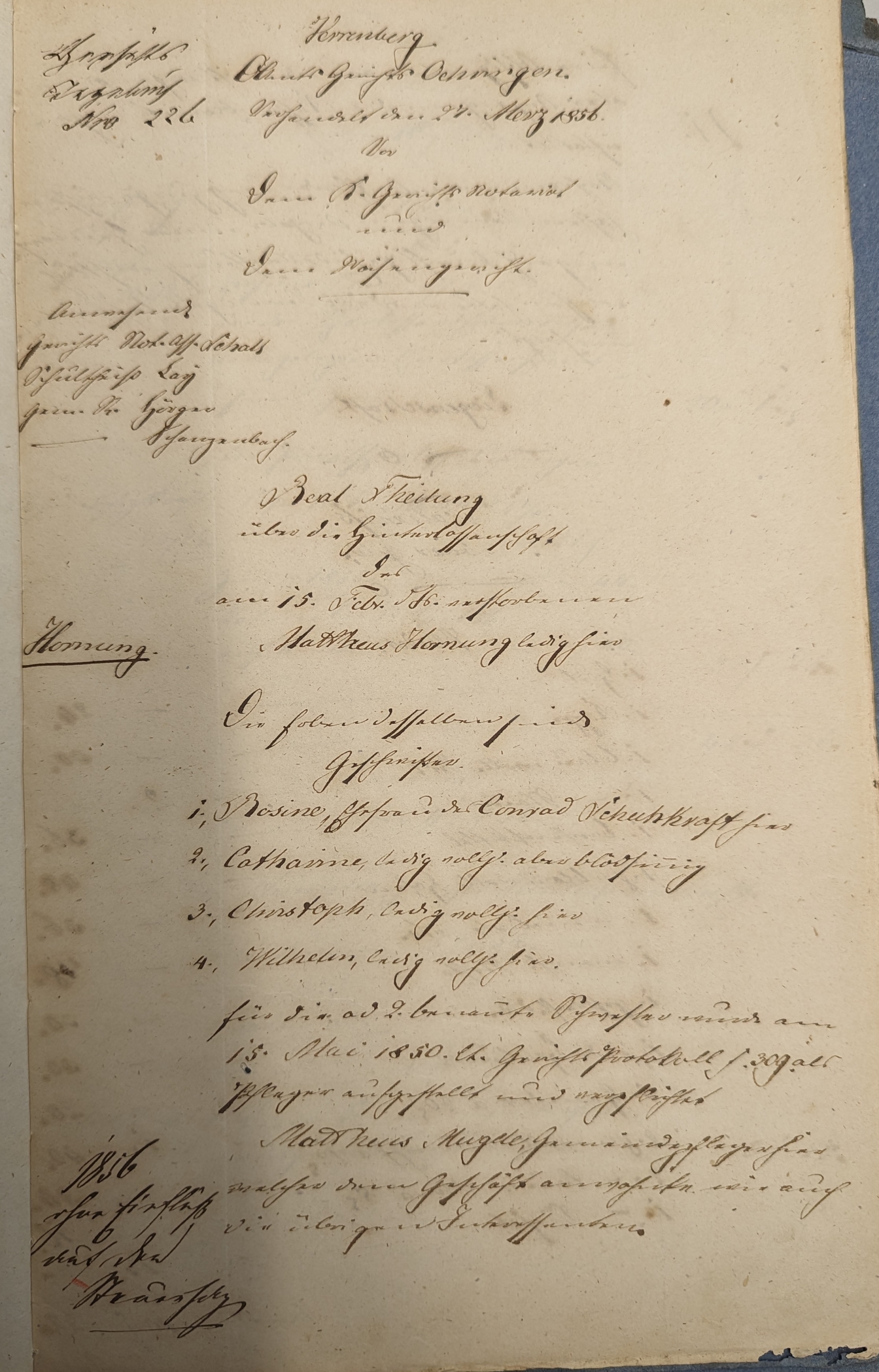 Nach dem Tod des Peter Hornung wurde eine Realteilung erstellt. Als Erben wurden die Kinder genannt: - Mattheus Hornung ledig vollj. hier - Christoph Hornung ledig vollj. hier - Wilhelm Hornung ledig vollj. hier - Rosine, Ehefrau des Conrad Schuhkraft, Weingärtner hier - Catharine ledig vollj. hier, für ent..... wegen mangelnder geistiger Fähigkeiten und körperlicher Gebrechen als Pfleger schon unterm 15. Mai 1850 lt. Gerichtsprotokoll S.309 aufgestellt und verpflichtet wurde Mattheus Mugele Gemeindepfleger hier