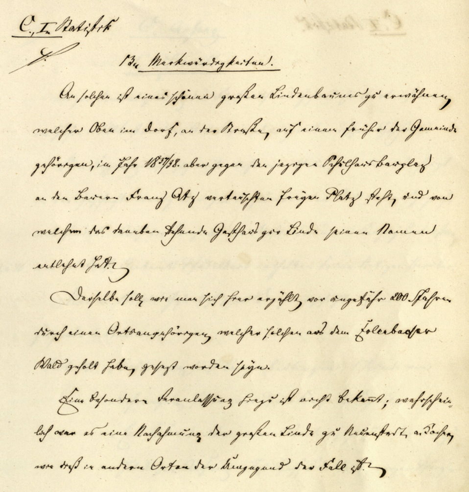 "13. Merkwürdigkeiten An solchen ist eines schönen großen Lindenbaums zu erwähnen, welcher Oben im Dorf, an der Straße, auf einem früher der Gemeinde gehörigen, im Jahr 1837/38 aber gegen den jezigen Schulhausbauplaz an den Bauern Franz Atz vertauschten freyen Platz steht, und von welchem das daneben stehende Gasthaus zur Linde seinen Namen entlehnt hat. Derselbe soll, wie man sich hier erzählt, vor ungefähr 200 Jahren durch einen Ortsangehörigen, welcher solchen aus dem Erlenbacher Wald geholt hat, gesezt worden seyn. Eine besondere Veranlassung hiezu ist nicht bekannt, wahrscheinlich war es eine Nachahmung der großen Linde zu Neuenstadt am Kocher, wie dies in andern Orten der Umgegend der Fall ist." |