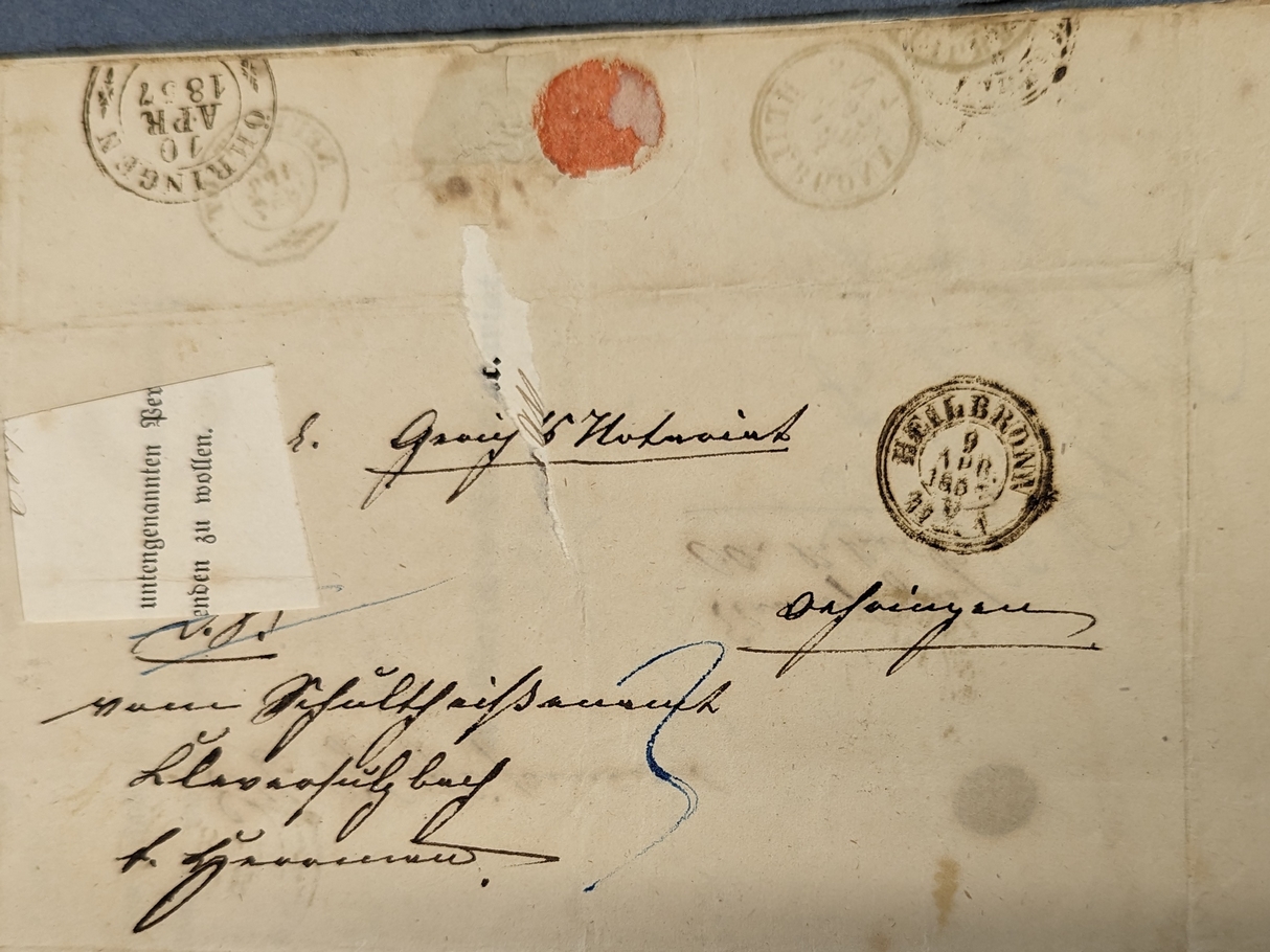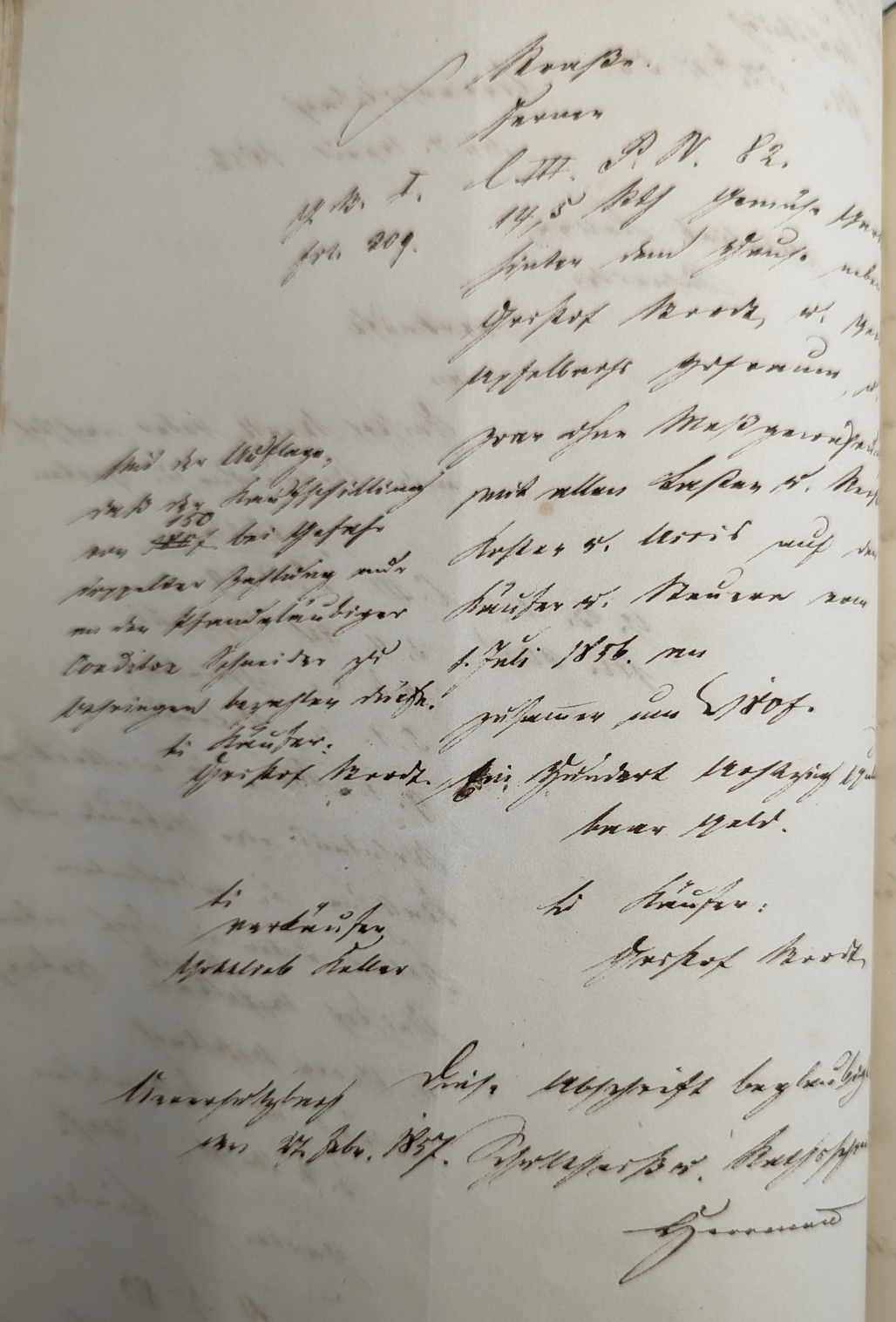 In dieser "Eventual- und Realteilung der Ehefrau des Gottlieb Keller" vom 13.02.1857 findet sich das folgende: Als Erben werden genannt: - der Wittwer Gottlieb Keller - Regine, ledig vollj., hier (vorehelich) - Johann geb. am 22.Merz 1845 - Rosine geb. am Dez 1850 Peter Frank wurde als Pfleger verpflichtet Liegenschaft: Haus Nr.28 inkl. Flächen rund ums Haus: 150 fl. ein Acker und ein Krautgarten 166 fl. Fahrniß baar Geld 0 fl. Männer und Frauen Kleider Betten, Leinwand, Küchengeschirr, Schreinerwerk, Handwerkszeug: 48 fl. 54 x Activa 0 fl. Summe ganzer Hinderlaßenschaft 361 fl. 54 x Schulden: - beim Conditor Schneider in Öhringen (versichert) 102 fl. 13 x - Jakob Hörger 50 fl. - Neuenstadt Bürgschaftsschuld 11 fl. - Schreiner Berg in Bitzfeld für den Sarg 7 fl. - Lindenwirt Carles Witwe hier für Wein 2fl. 28 x Diverse kleinere Summen Summe Schulden 222 fl. 33x Rest Vermögens 139 fl. 21 x Die Regina Hörger led. hier übernimmt die ganze Aktiv Masse Kaufsweise um den vom Weisengericht gemachten Anschlag von 361 fl. 54 x Damit übernimmt sie u.a. auch das Haus Nr.28. Sie verpflichtet sich, ihren Vater bis zu seinem Lebensende zu verpflegen und einzukleiden. Für ihre beiden minderjährigen Geschwister verpflichtet sie sich, sie bis zu deren 14.Geburtstag sie zu verpflegen, einzukleiden etc.. Danach muss sie jeder 35 fl. aus dem mütterlichen Vermögen auszahlen. |
