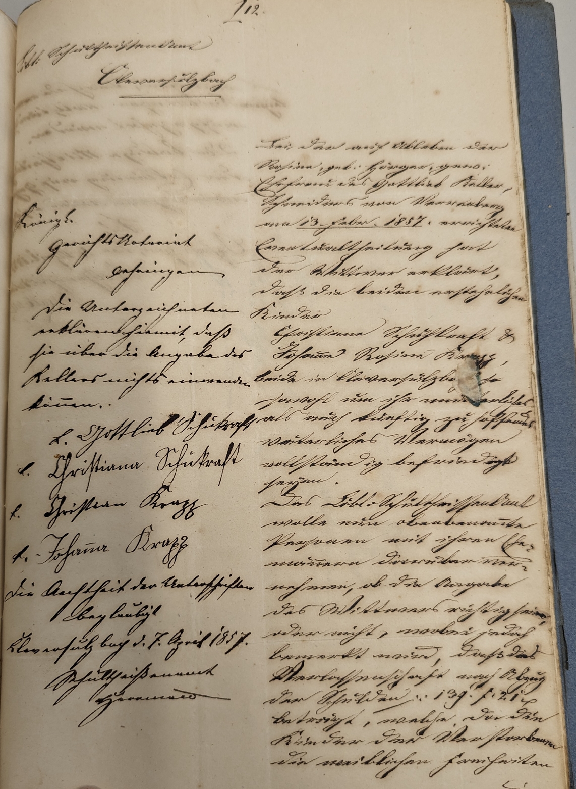Im "Schultheißen-Amts Protokoll" findet sich am 16.Juni 1856 folgendes: Es erschien Johann Haußler und Michael Roth von hier und bringen Klagbar vor daß Ihnen in ihrem gemeinschaftlichen Wald im Lindenhölzle am 7.Mai d.J. 16 Forchen abgeschnitten und entwendet worden sind, sie haben seit dieser Zeit durch den Waldschüzen Michael Kipf in Erfahrung gebracht daß Christian Wieland led 17 Jahr alt Johann Keller 12 Jahre alt solches gethan haben. Sie tragen daher auf Schadenersatz nebst Bestrafung über diesen Unfug der Thäter an Auf diese Angabe wurden die Beklagten vorgeladen und erschienen beide in Persohn desgl. Waldschüz Kipf 1. Wieland wurd über die Klage verständigt gibt hierauf an ich habe kein Forchen umgeschnitten desgleichen auch kein Holz entwendet Keller gibt an ich habe nicht in dem umgeschnitten sondern ich habe nur die ...... Holz an den Bäumen abgebrochen aber der Wieland hat 2. Schnitthaben bei sich gehabt und hat damit einige Forchen umgeschnitten und hat sie nach Hause getragen Wieland wurde noch einmal gefragt ob die Angabe des Kellers der Wahrheit gemäß sei gibt hierauf an ist richtig daß ich einige abgeschnitten und nach Hauße getragen habe aber daß ich die 16 Stück abgeschnitten ist Unwahrheit den die Regina Hörger von hier war auch in der Sache anwesend welche eine Holzhabe gehabt und auch Forchen umgehauen und nach Hauß getragen hat weiter weiß ich nichts anzugeben Beschluß Da die Regina Hörger welche nach Angabe des Wieland mitbetheiligt sein soll von Hause entfernt war später vorzuladen und über die Angabe des Wieland zu hören Nach einigen Tagen wurde die Regina Hörger vorgeladen, welche auch erschien. Dieselbe wurde über vorstehendes verständigt gibt an es ist richtig daß ich Dürres Holz geholt und einige Dürre Forchen umgeschnitten habe Beschluß Die Beklagten dem Gemeinderath zur Bestrafung bei dem nächsten Ruhtag zu übertragen |