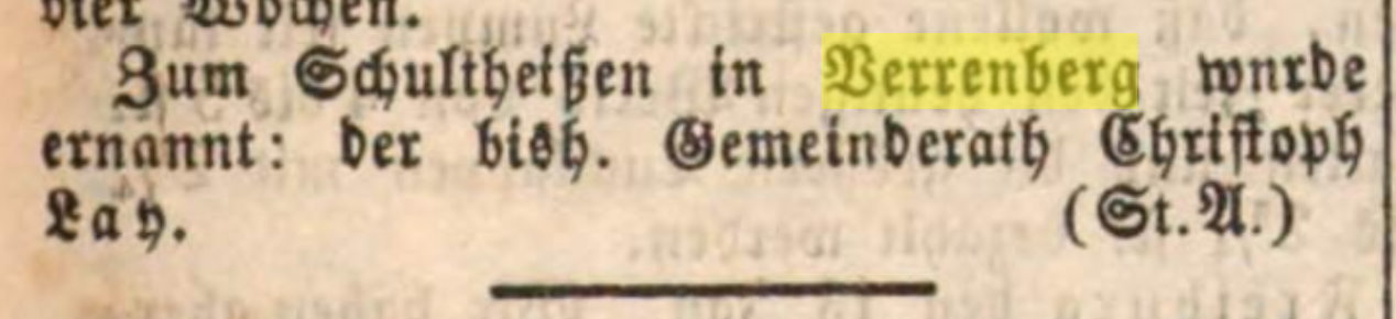 Im Verrenberger Gemeinderatsprotokoll vom 06.September 1860 liest sich das so: Schultheiß Lay hat sich unterm 28 Aug. 1860 mit einer schriftlichen Bitte an den Gemeinderath um Aufbesserung seiner Eigen Besoldung gewendet. Die Collegien haben über dieses Gesuch einstimmig Berathung gepflogen und Beschlossen Dem Bittsteller statt 40f. eine .... Besoldung von 55f. pro 1.Juli 1860 an besonders so lange das Eisenbahngeschäft dauert weil dieses viel verurhsacht, daß der Ortsvorsteher sein Amt schwieriger zu besorgen hat, zu verwilligen hiezu aber die Ober Amtliche Genegmigung einzuholen. |