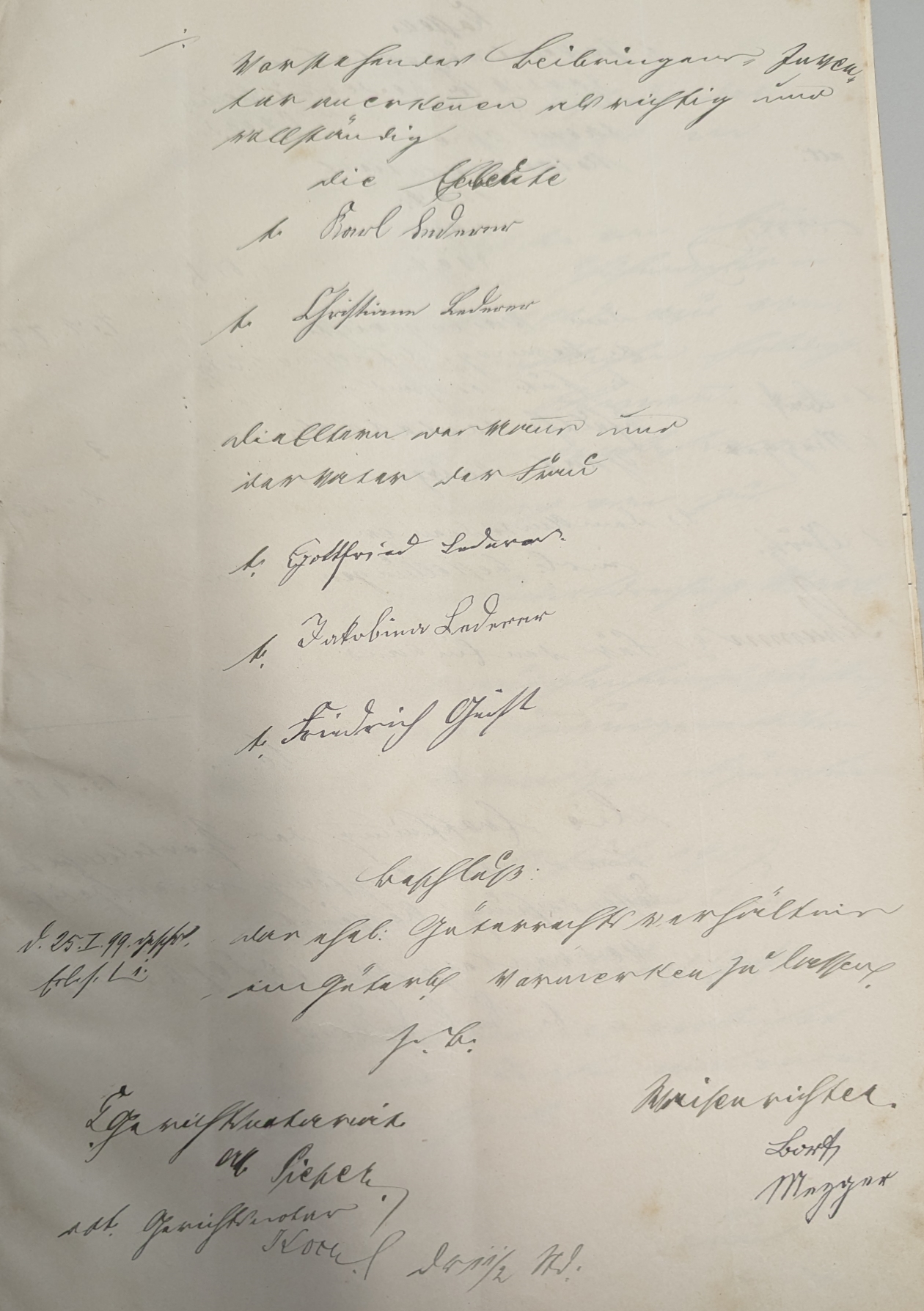 Im Beibringensinventur wird auch erwähnt, dass das Ehepaar die Liegenschaft seiner Eltern, Haus Nr.48, um 5.000 Mark erkauft haben. Dabei dürfen sie 1.000 Mark als Heiratsgut vom Kaufpreis abziehen. Karl Lederer hat in die Ehe eingebracht: - Fahrniß 150 M. 70 d. (62 M. 70 d. Eigen und 88 M. Aussteuer) - 1.000 M. Heiratsgut, die er vom Kaufpreis für die elterliche Liegenschaft abziehen darf. "Ganzes Beibringen ds Ehemanns 1.150 M. 70 d." Christiane Karoline Lederer geb. Geist hat in die Ehe eingebracht: - Fahrniß 1.592 M. 40 d. (522 m. 65 d. empfangenes Muttergut und 67 M. 40 d. Eigen - bei ihrem Vater kann sie noch 300 M. fordern. "Frau Beibring Summe 1.892 M. 40 d." "Summe Beibringens beider Eheleute 3.042 M. 10 d."