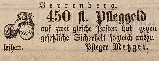 Im Verrenberger Gemeinderatsprotokoll vom 28.Januar 1851 findet sich folgendes: Als Pfleger für das Unehliche Kindt der Catrina Schanzenbach von hier wirdt von dem Weisen Gericht vorgeschlagen als Pfleger und Bestedig, Christian Mezger von hier, und wurte nach der Eides Formel verpflichtet. |