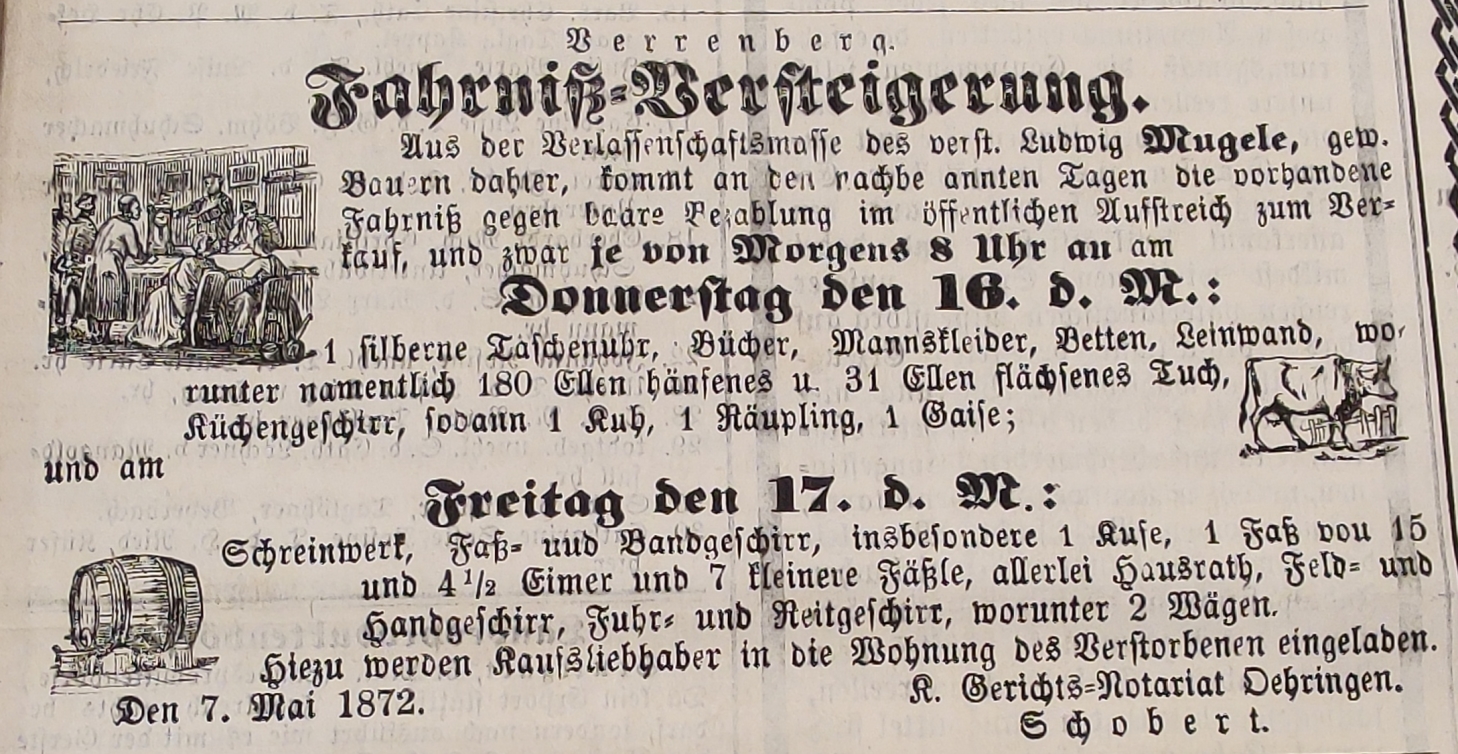 Am 16.02.1871 bot er dann im Hohenloher Boten Fahrniß zum Berkauf an, das er aufgrund der Verpachtung nicht mehr benötigt.