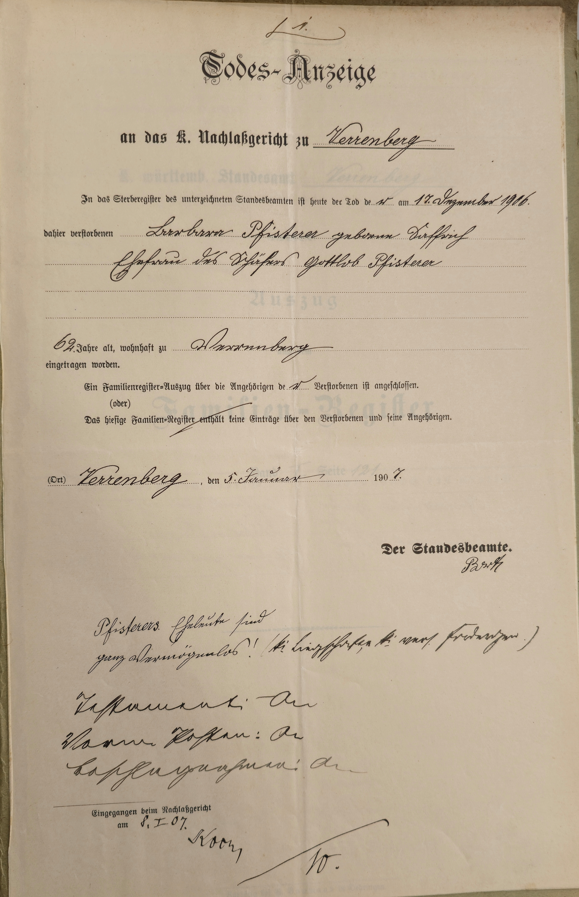 In diesen Nachlassakten vom 17.12.1906 - 20.04.1907 findet sich das folgende: In der Todesanzeige findet sich noch eine Bemerkung des Standesbeamten: "Pfisterers Eheleute sind ganz Vermögenslos"