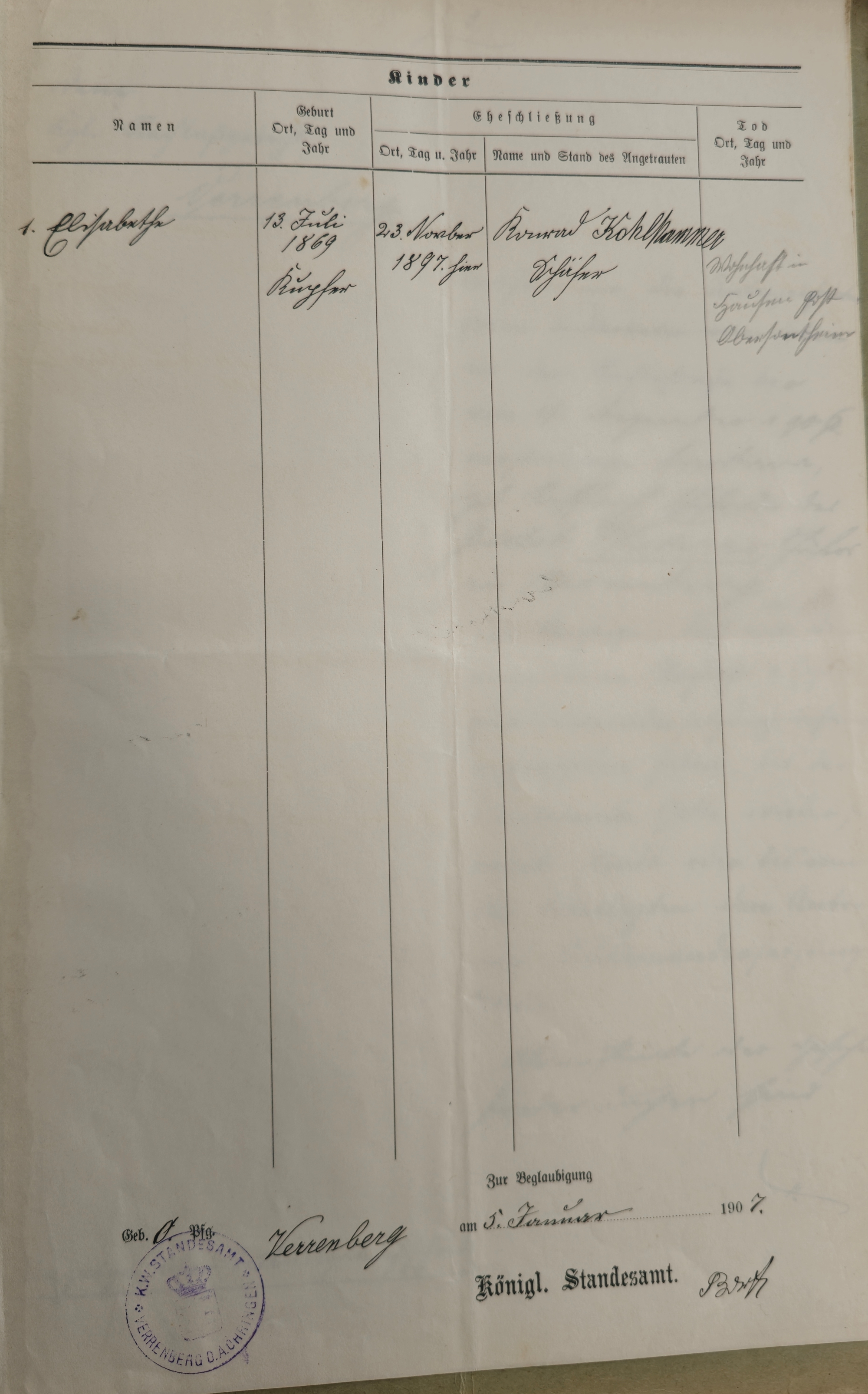 Im Verrenberger Gemeinderatsprotokoll vom 08.September 1874 findet sich folgendes: Dem Gotlob Pfisterer Zeugnis ausgestellt auf Verl. Des K.Ob/Amts Gerichts Oehringen 1. Predikat gut 2. Vermögen ca. 150f. 3. Vorstrafen nach dem Strafverzeichniß |