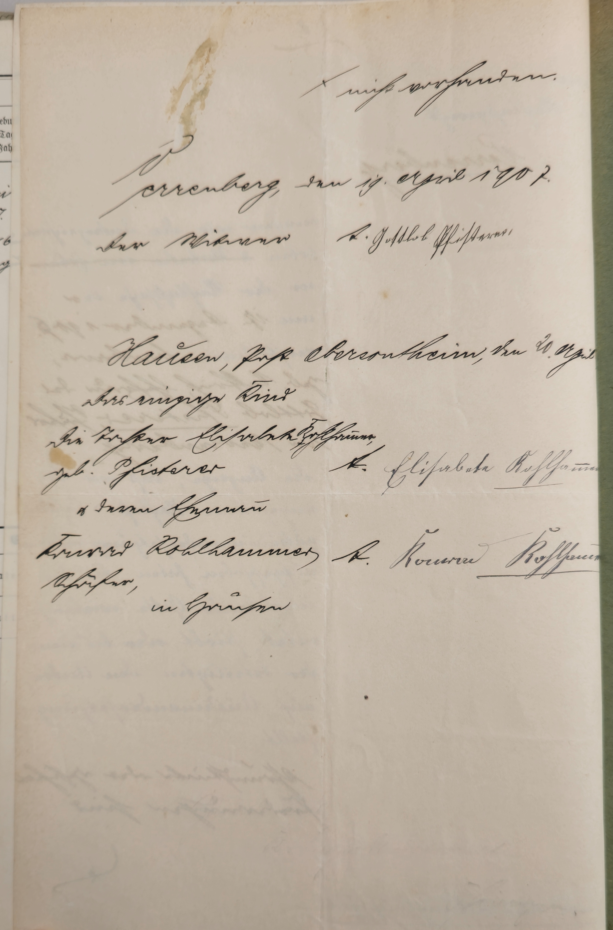 In diesem Dokument vom 23.03.1896 findet sich das folgende: Es gab drei Geburten in dieser Ehe, aber keines der Kinder wurde älter als einen Tag. Daher hatte er sich nun entschlossen das uneheliche Kind seiner Frau, Elisabeth Saffrich "... an Kinderstadt anzunehmen." Dazu wurde zwischen beiden ein Arrogations-Vertrag abgeschlossen. Sie bekommt alle Rechte eines ehelichen kindes an und übernimmt den Familiennamen Pfisterer |